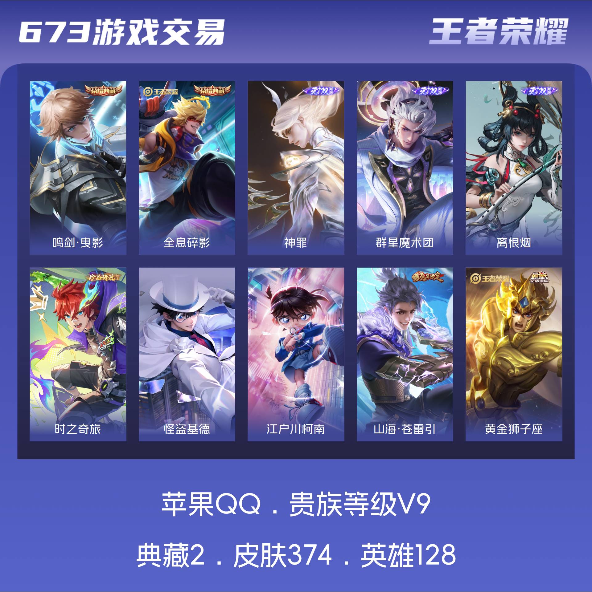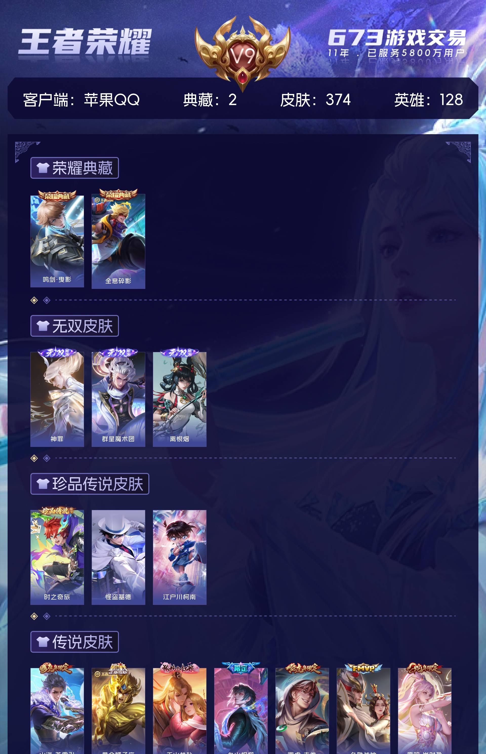苹果QQ/至尊星耀/374皮肤/128英雄/2典藏/0珍品无双/3无双/3珍品传说/39传说/103