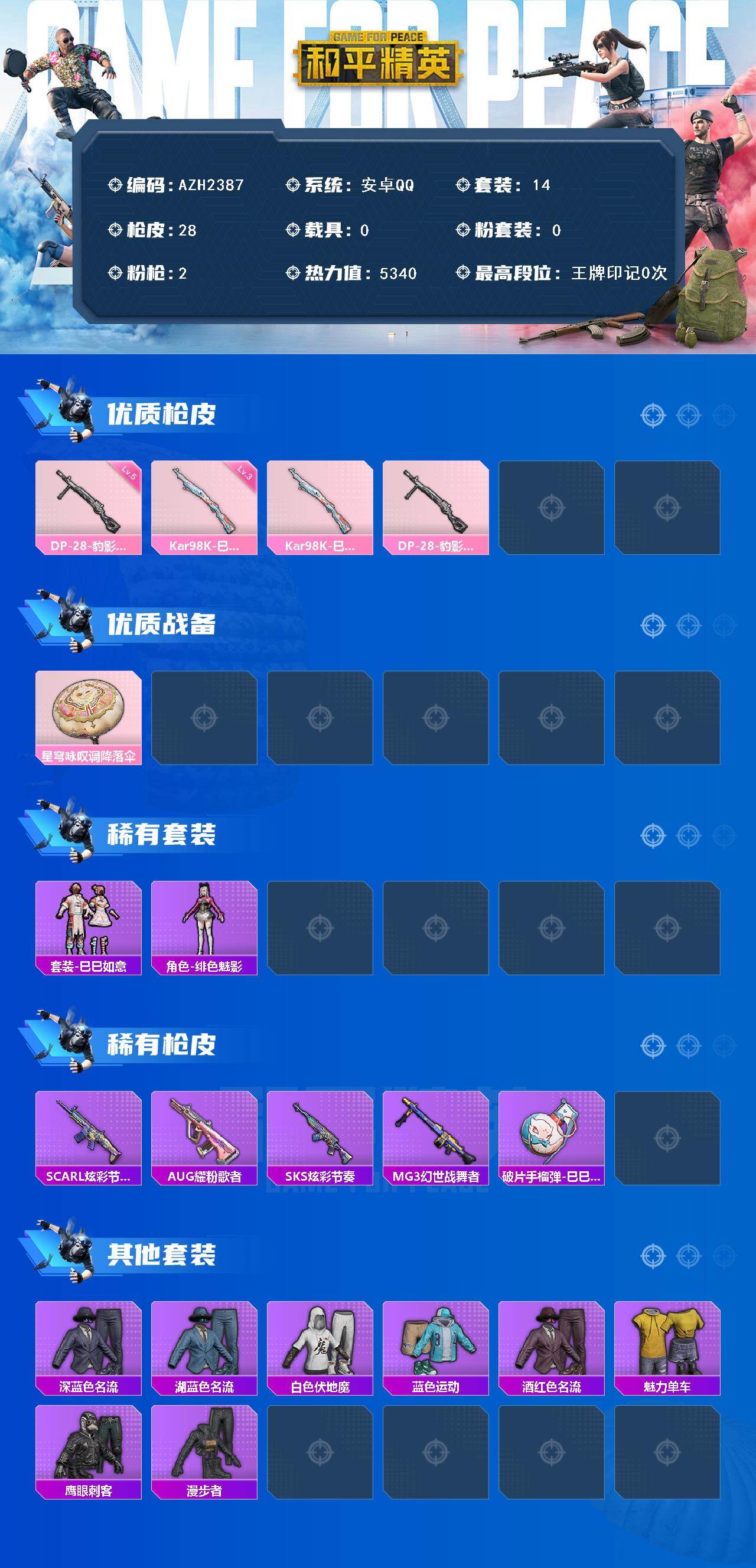 【AZH2387】安卓 手Q【绯色魅影 鹰眼刺客 漫步者】0粉装-2特效枪-0载具-0粉色飞行器-5340热力值-0王牌印记-14套装-28枪皮