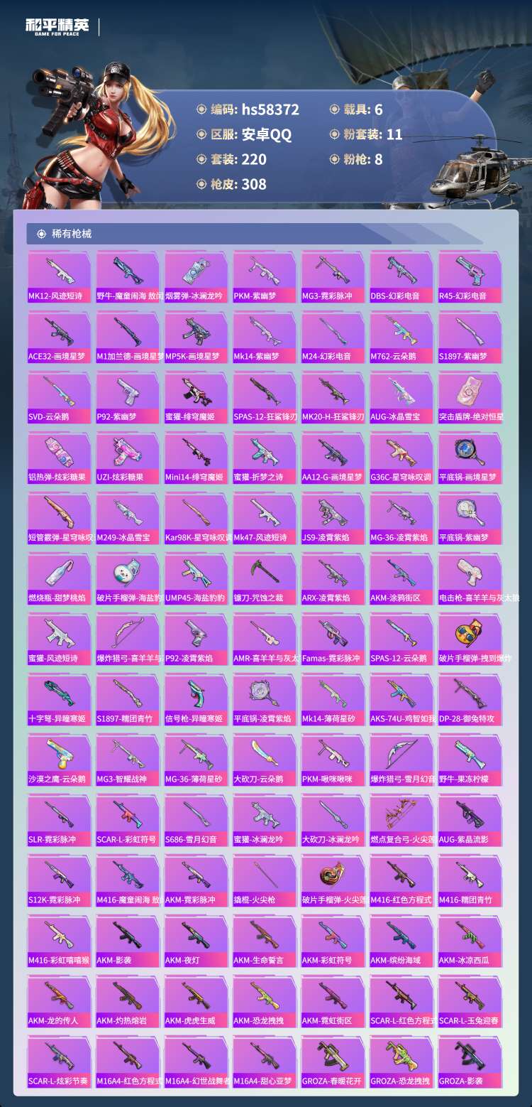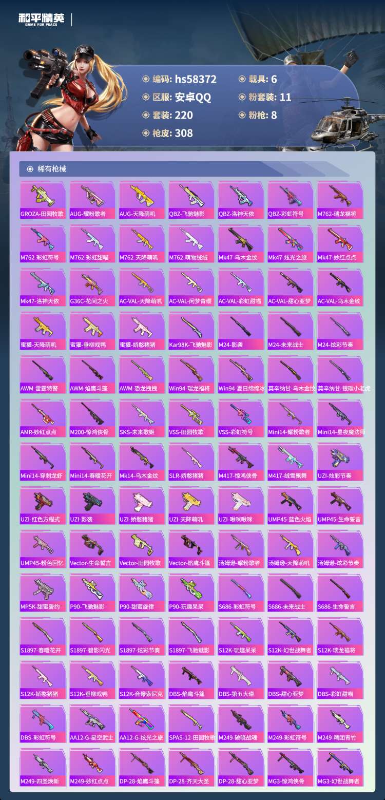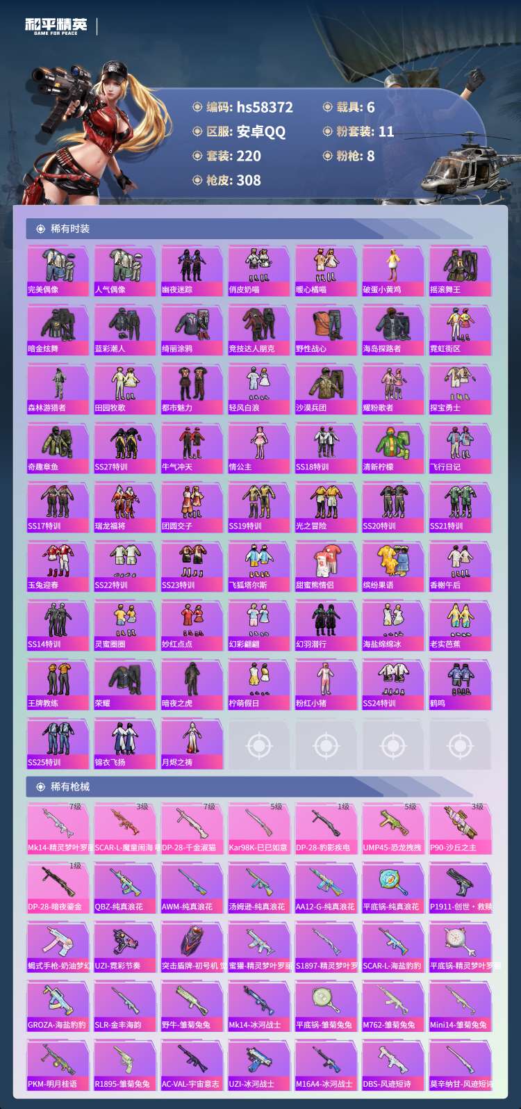 hs58372 安卓手Q-17王牌印记-11粉装-8特效枪-6载具-109649热力值-220套装-