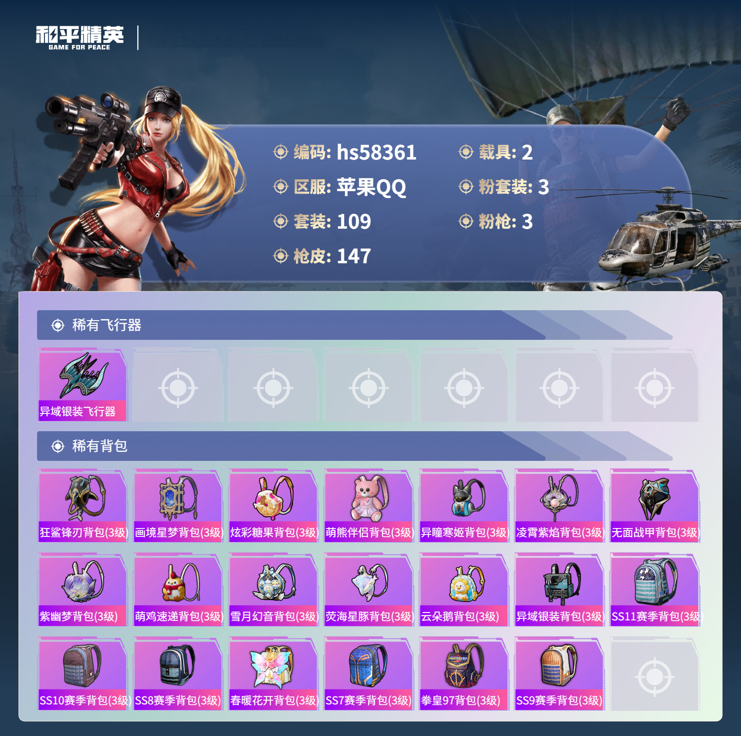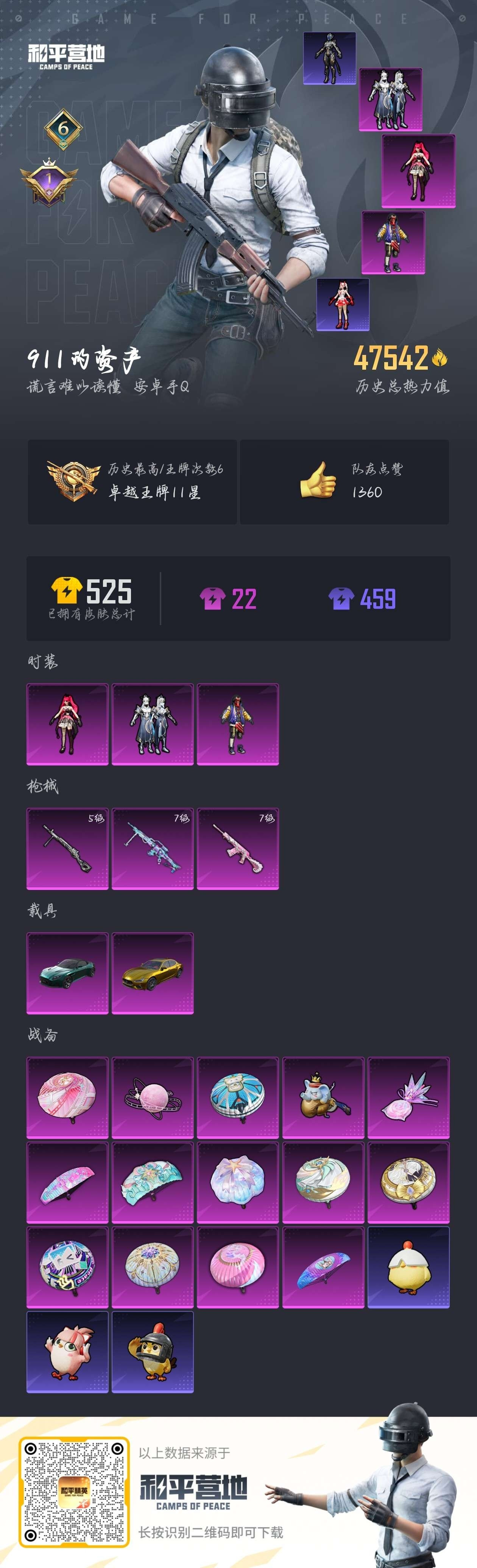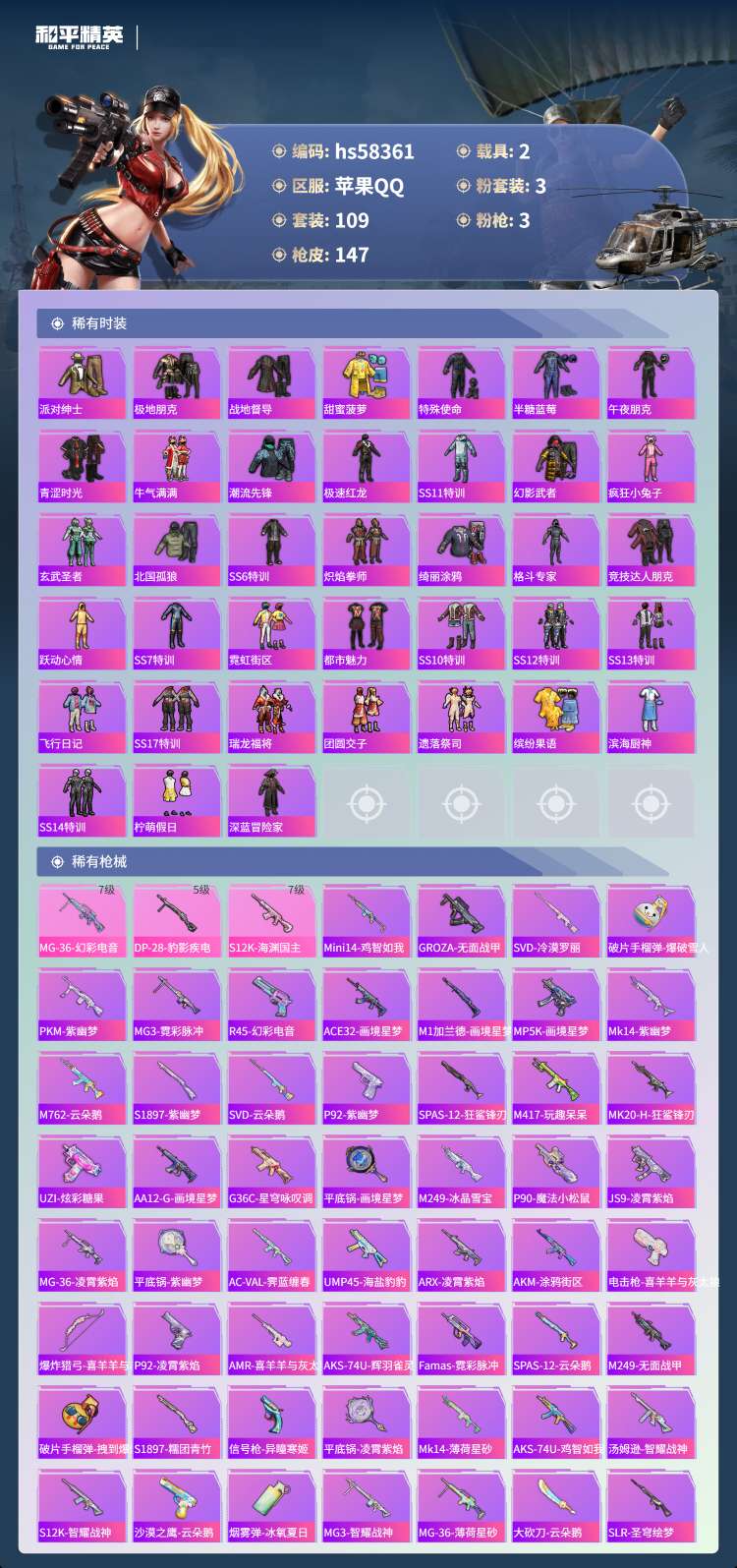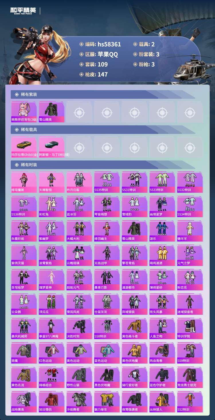 hs58361 安卓手Q-6王牌印记-3粉装-3特效枪-2载具-47542热力值-109套装-147