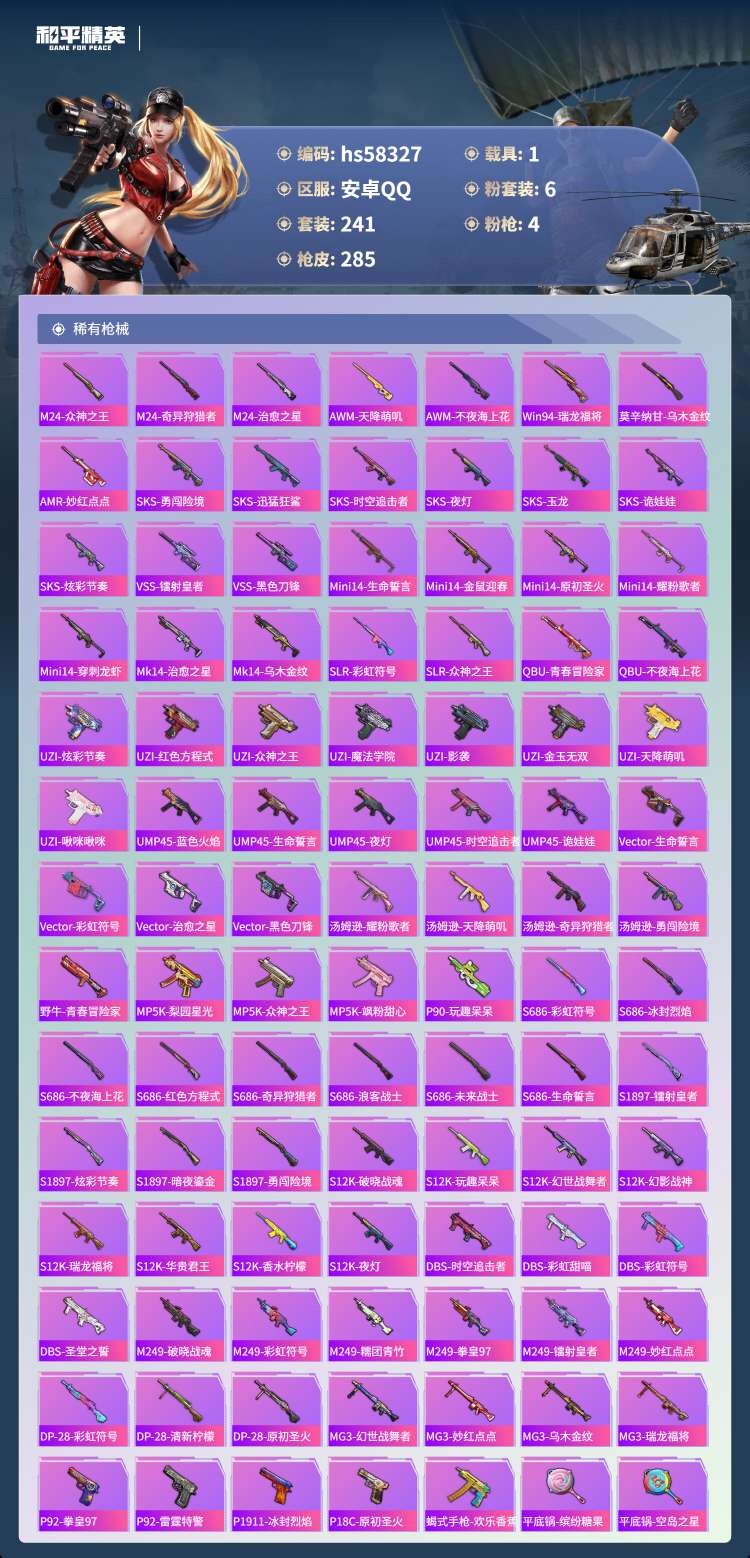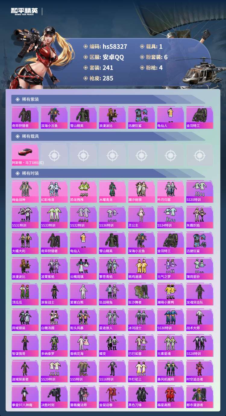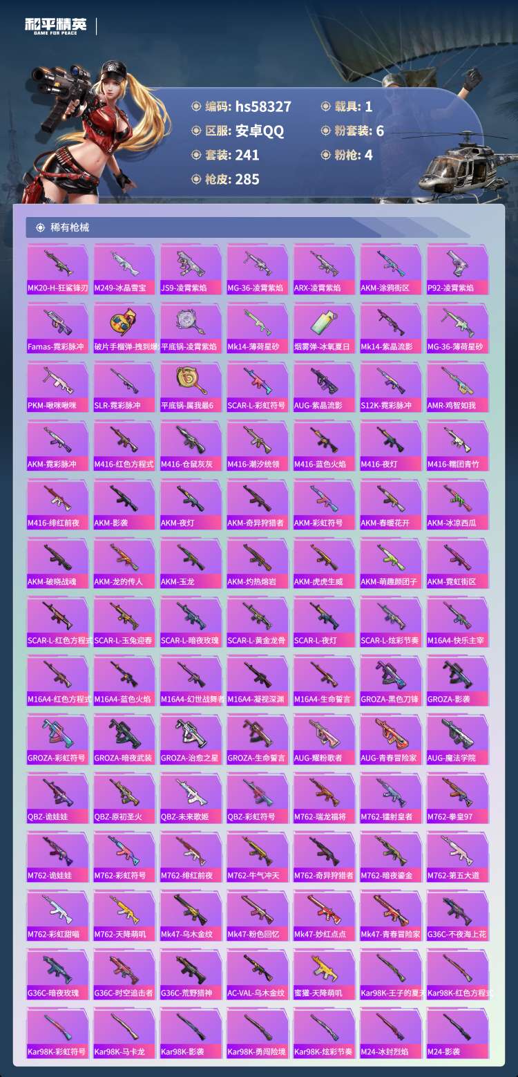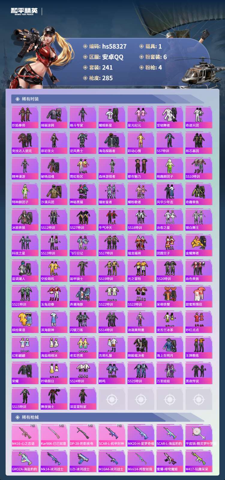 hs58327 安卓手Q-13王牌印记-6粉装-4特效枪-1载具-89497热力值-241套装-28