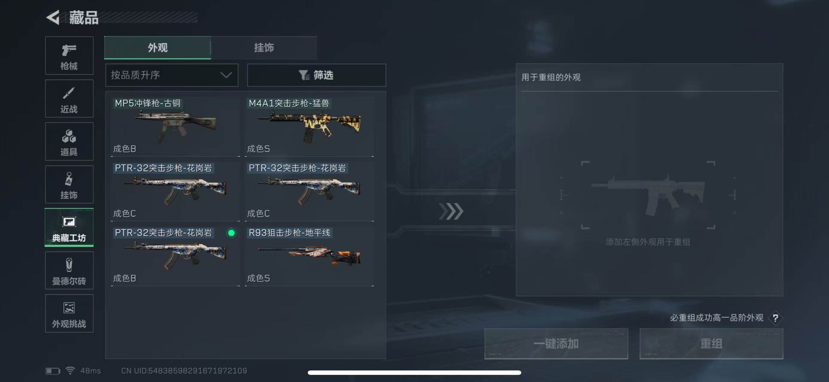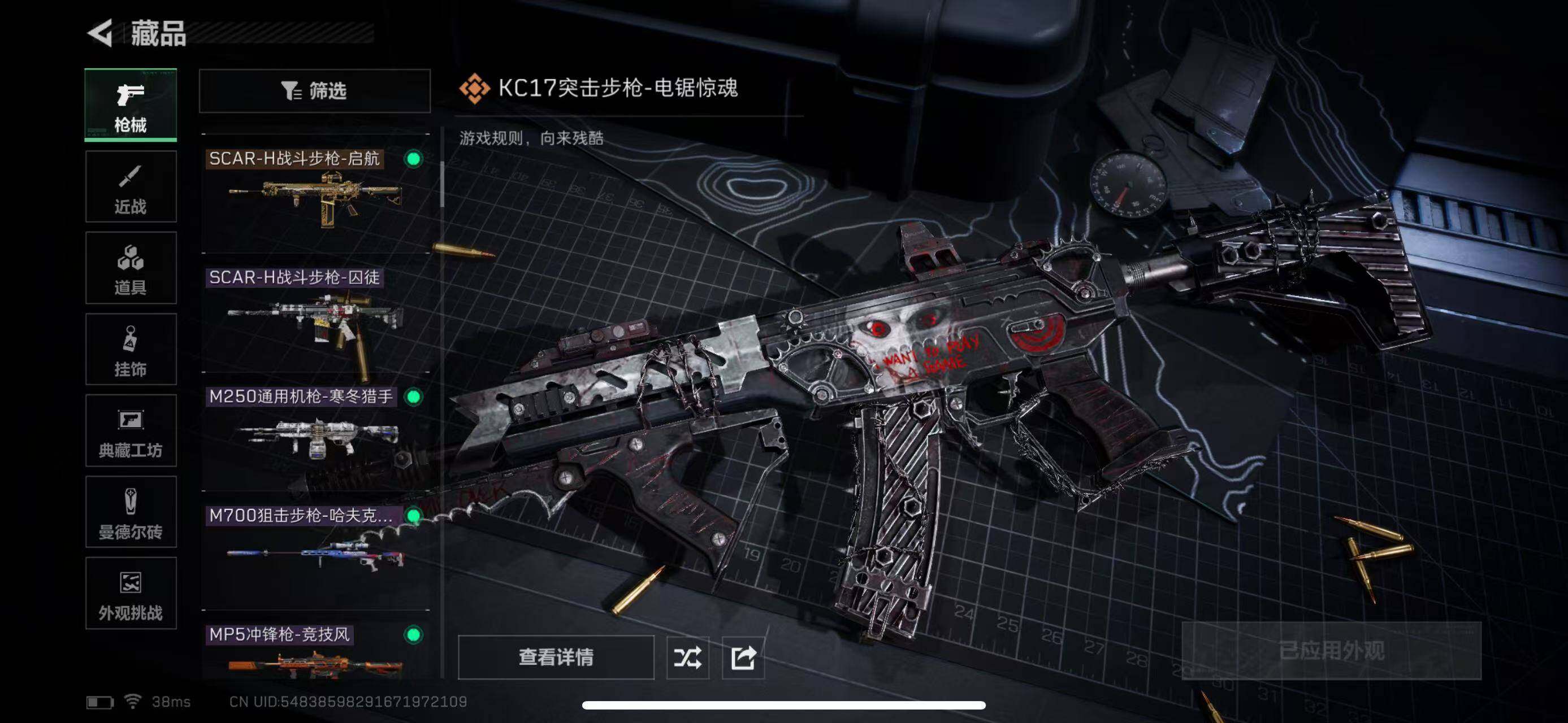 【传说外观】:M4A1突击步枪-阿米娅,ASh-12战斗步枪-鹅鸭杀,SCAR-H战斗步枪-启航,KC17突击步枪-电锯惊魂,QCQ171冲锋枪-鹅鸭杀,QJB201轻机枪-鹅鸭杀,R93狙击步枪-维什戴尔