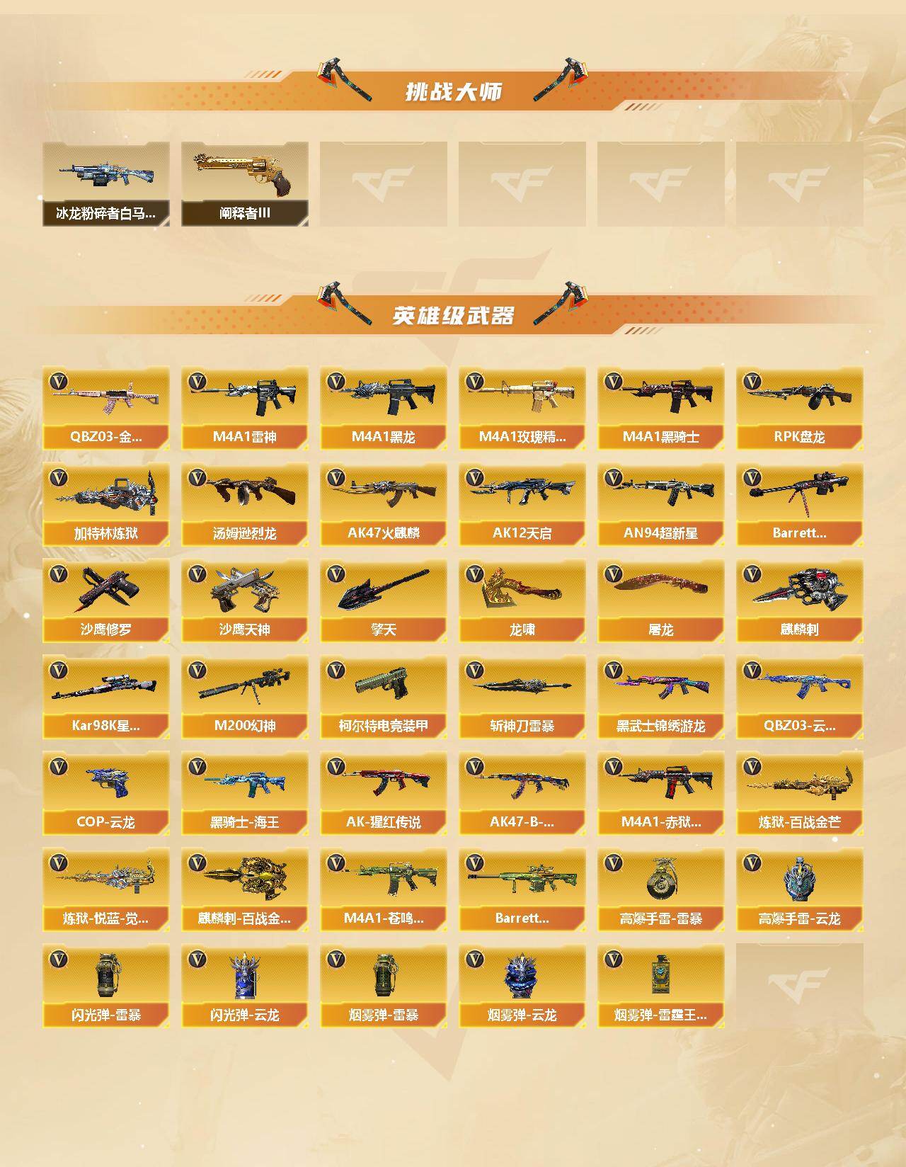 【热门武器】:QBZ03-金色蔷薇,M200-幻神,Kar98K-星神,M4A1-黑骑士,汤姆逊-烈龙*2,RPK-盘龙,加特林-炼狱,沙鹰-修罗*4
