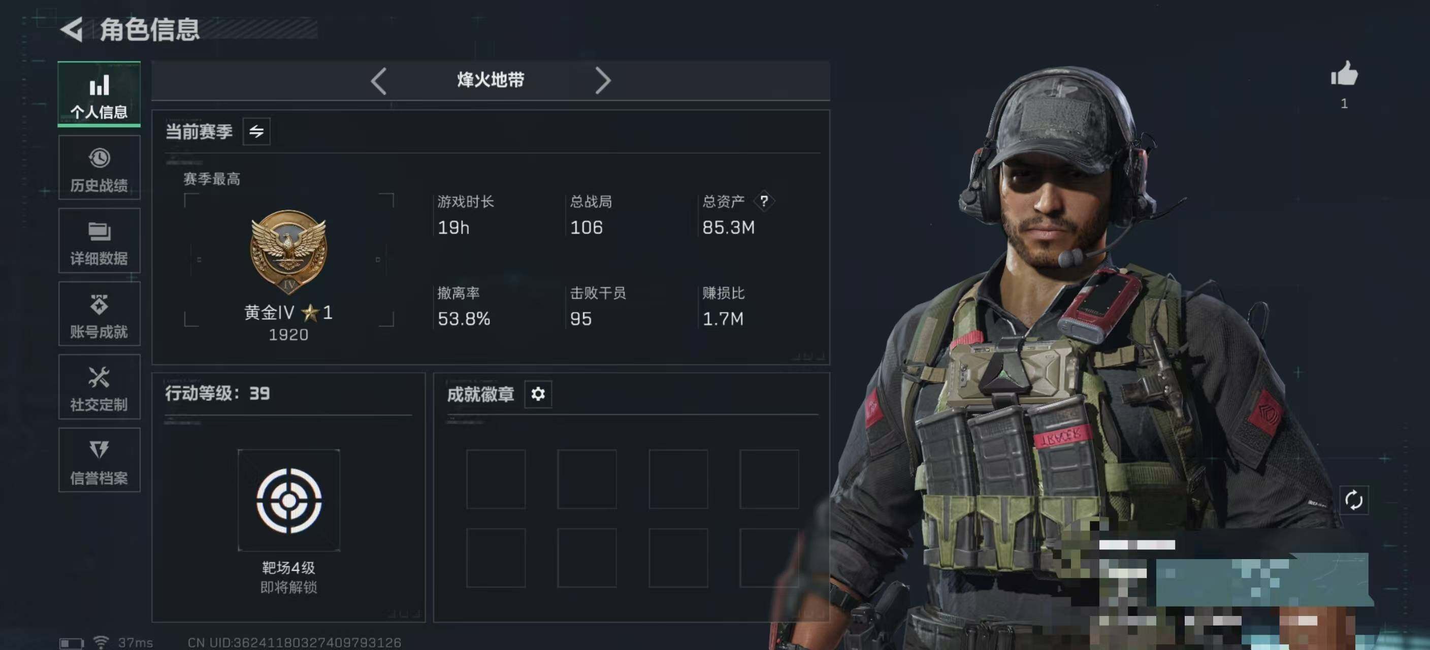 总资产(M):85M/哈夫币(K):68833K/全面战场等级:1_段位:无段位/烽火地带等级:39_段位:黄金/