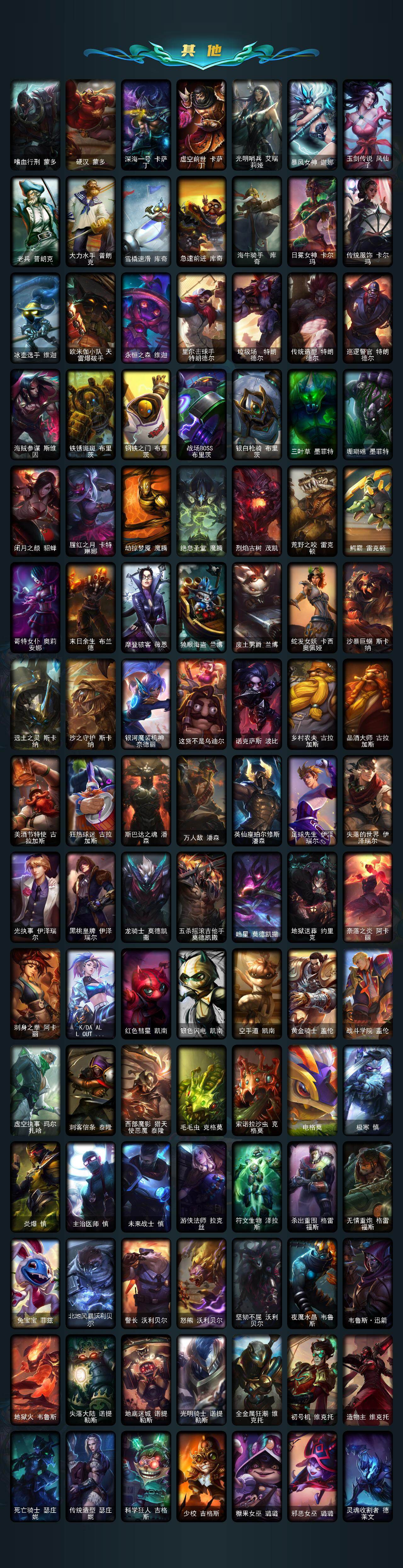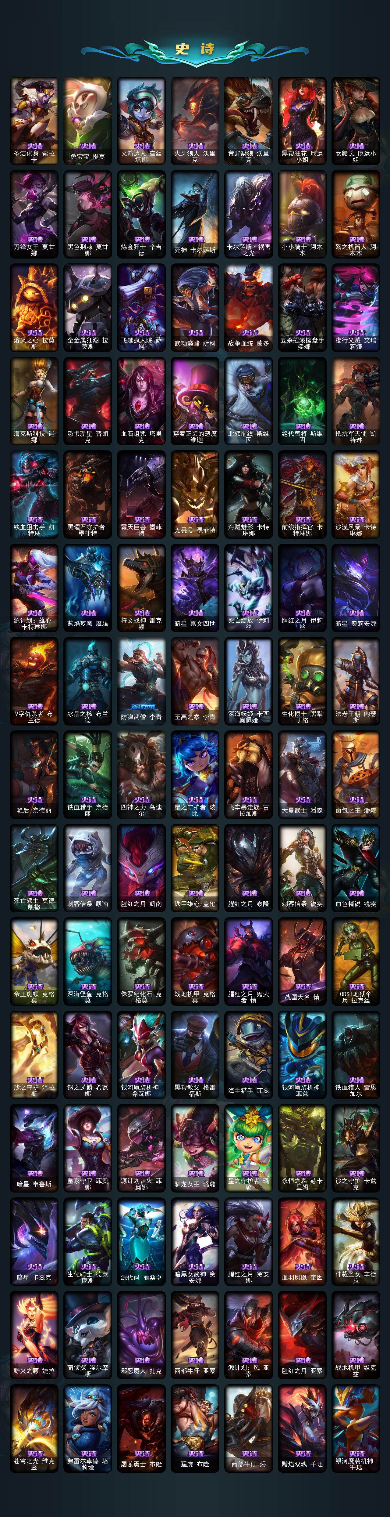 【臻彩皮肤】:春晖神女拉克丝流风回雪,天龙之子卡莎飞龙乘云,墨之影武者亚索金墨耀影,闭月之颜貂蝉炫金莲华,玉剑传说无极麒麟,霸天异形卡兹克掠空魅影,持七彩冰棍的雪人易,海之歌艾希冰爽浪花,魔女阿卡丽虚荣,净雪之月莫甘娜冬虹