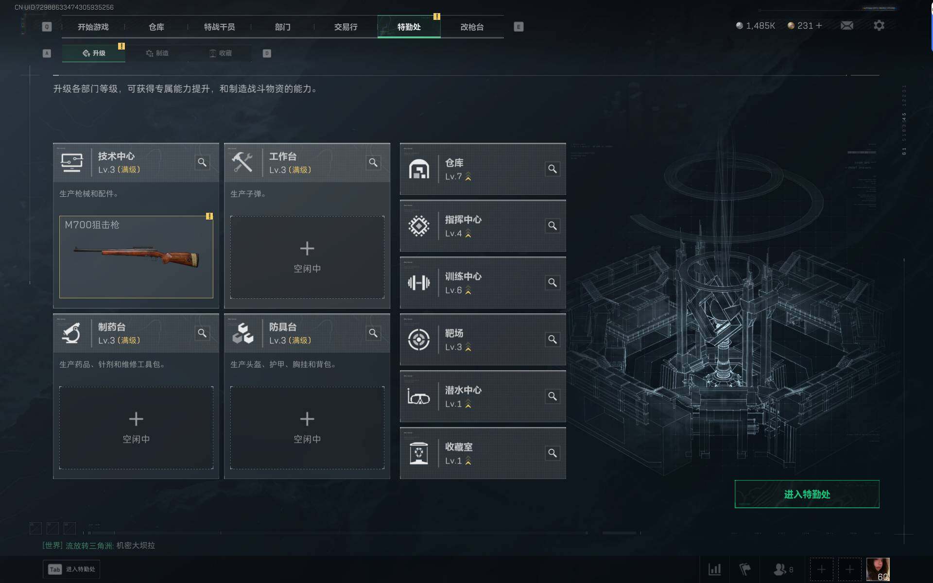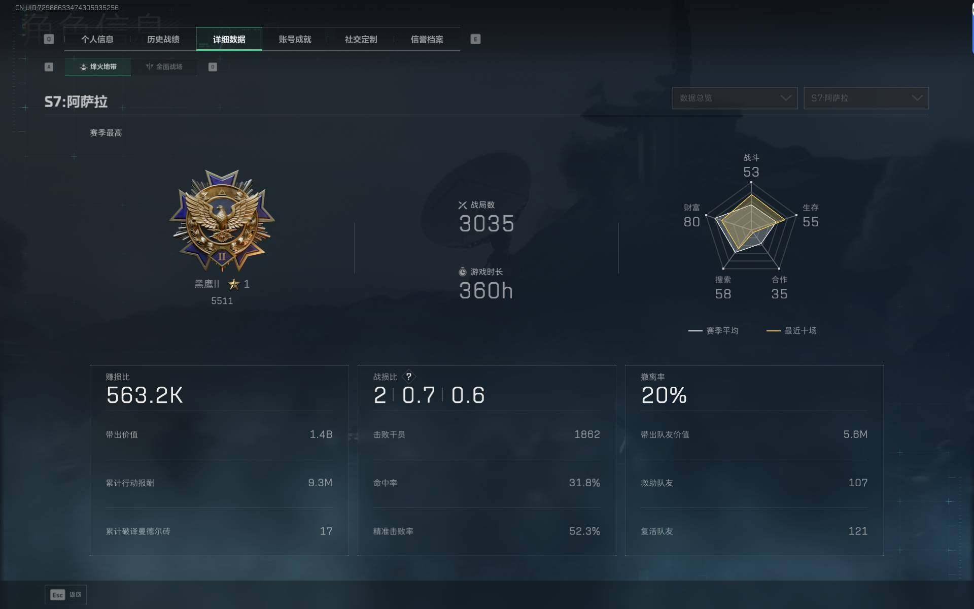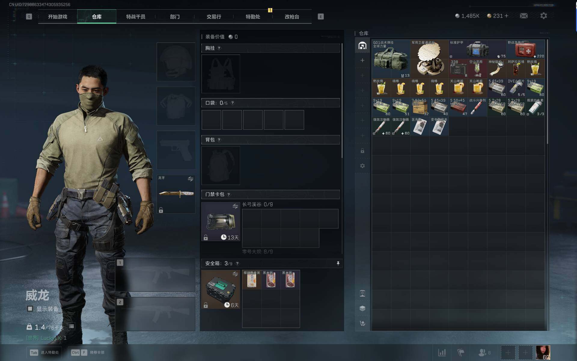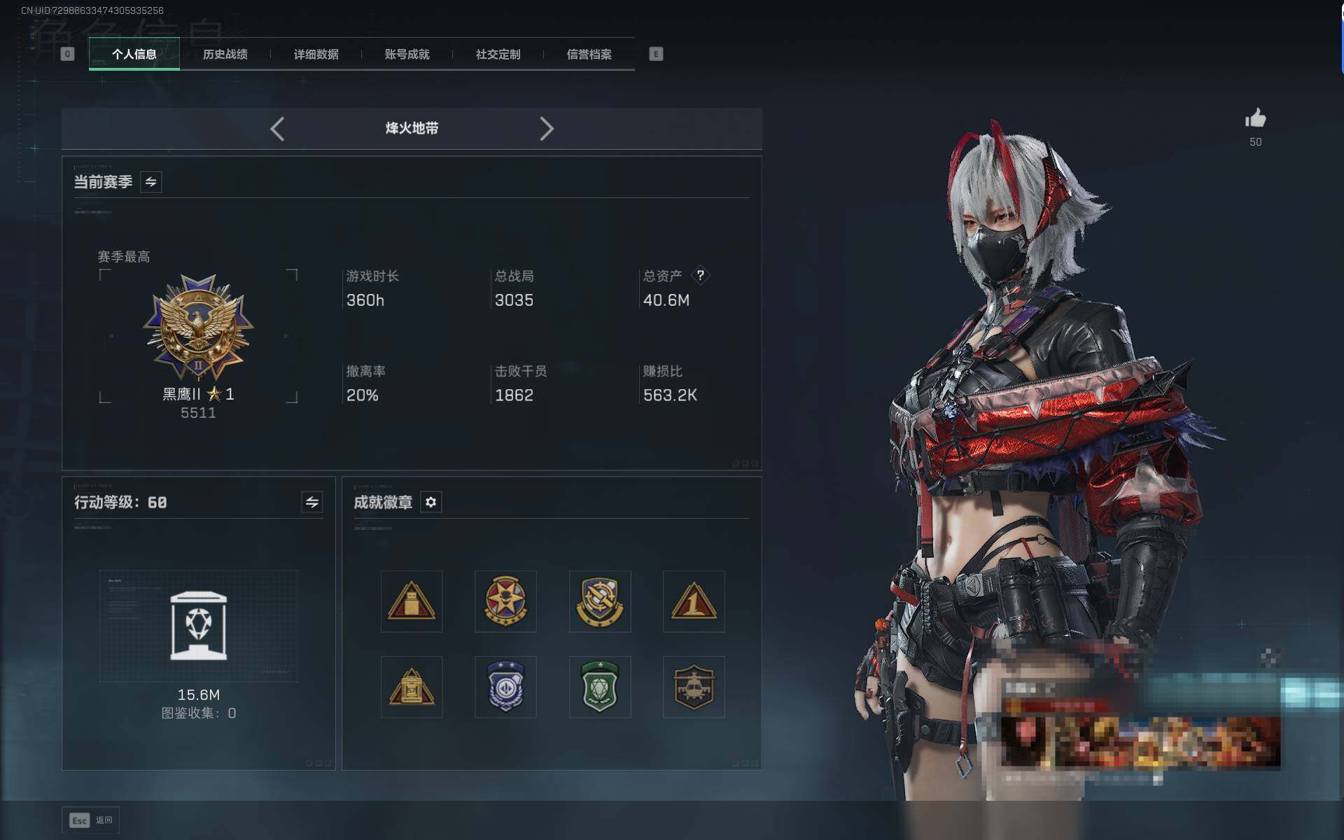总资产(M):40M/哈夫币(K):1485K/传说枪皮数:8/全面战场等级:48_段位:校官/烽火地带等级:60_段位:黑鹰/