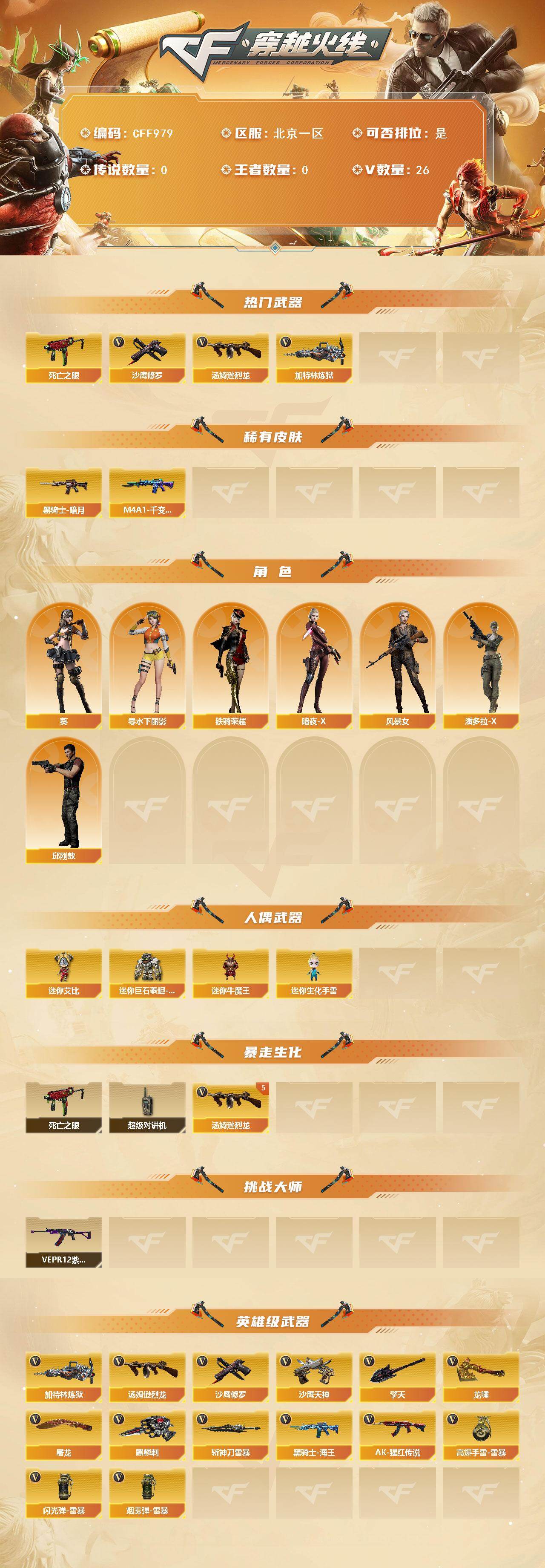 【CFF979】25V/102级/荣耀元首/1英雄/死亡之眼/汤姆逊烈龙/加特林_炼狱/沙鹰_修罗/M4A1-千变-孔明皮肤/黑骑士-暗月/葵/暗夜-X/风暴女/零-水下丽影/潘多拉-X/邱刚敖/铁骑荣耀/迷你牛魔王/迷你生化手雷/迷你艾比/迷你巨石泰坦-魔花研究所/超级对讲机/5烈龙/VEPR-12-紫魔/AK-47-猩红传说/黑骑士-海王/沙鹰_天神/屠龙/龙啸/擎天/麒麟刺/斩神刀-雷暴/高爆手雷-雷暴/闪光弹-雷暴/烟雾弹-雷暴/战舰背包/炫彩背包/老虎背包/超级背包/黄金生化钩/灵魂忍