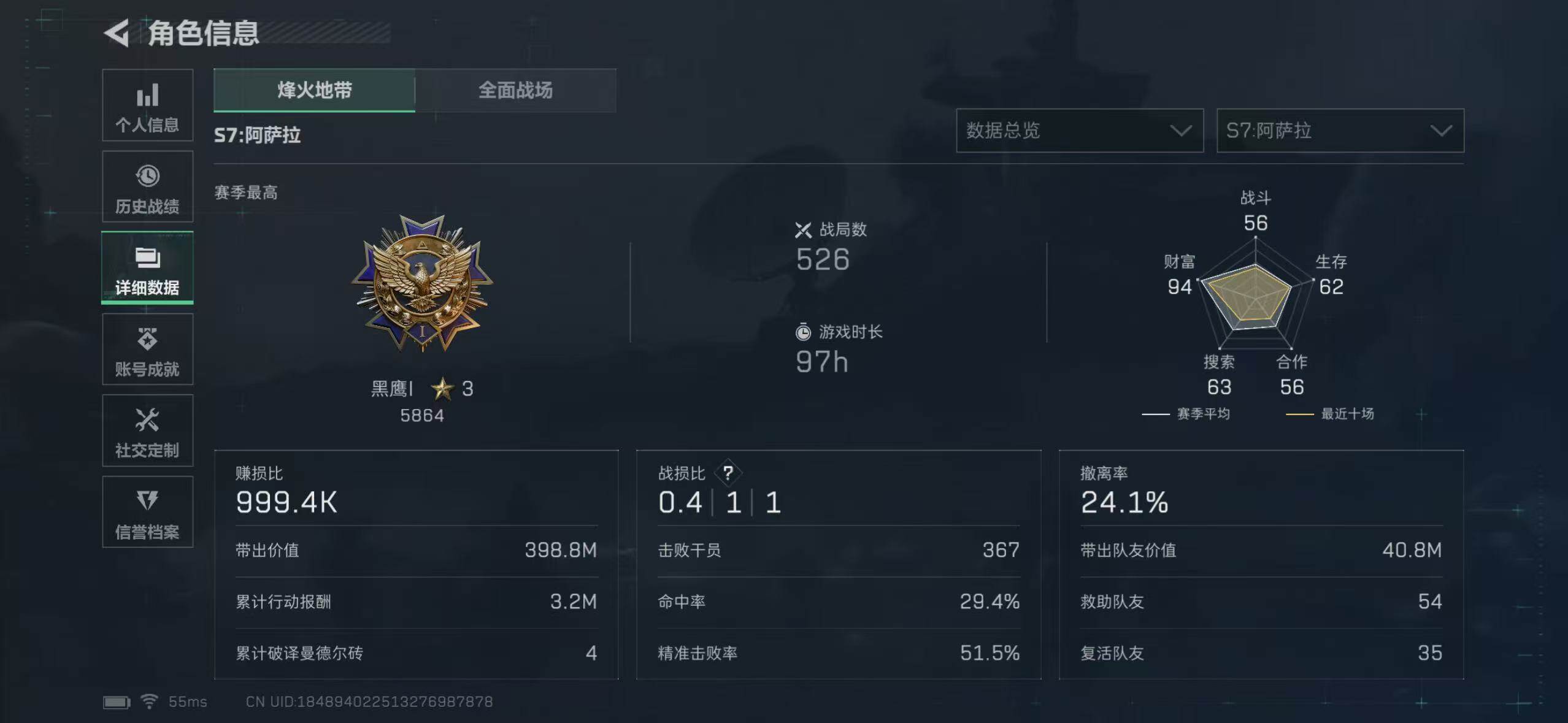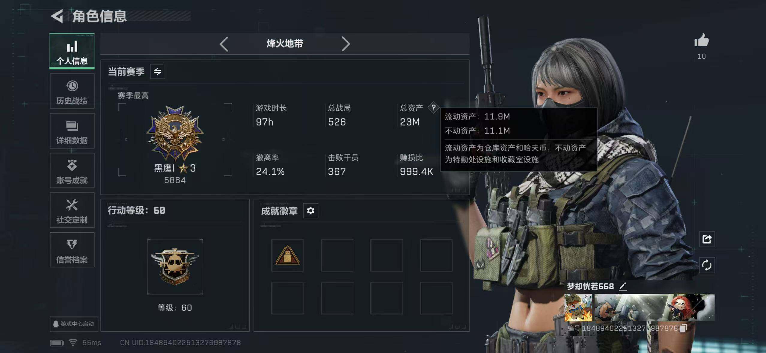 22m总资产-806k哈伏币-60烽火等级-黑鹰-14战场等级-上等兵