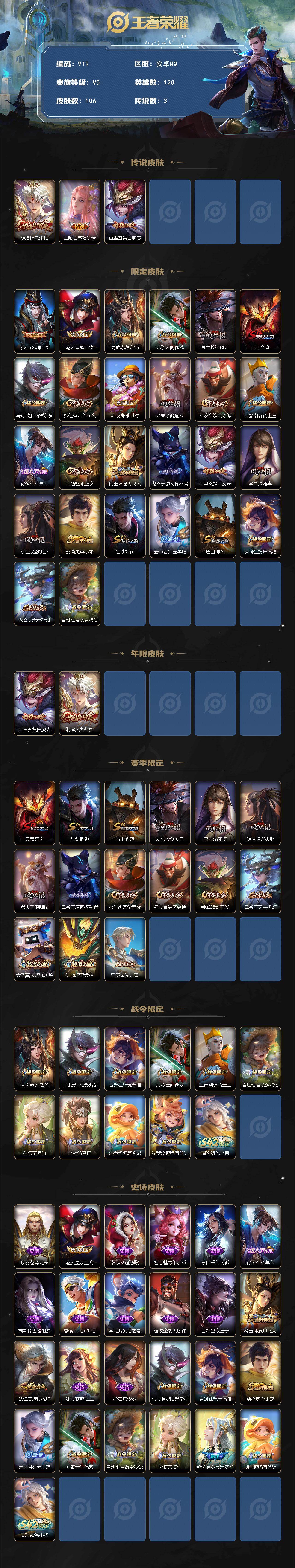 /2044943 王者荣耀账号 安卓Q-V5-至尊星耀IV段位-120英雄-106皮肤-3传说-24史诗