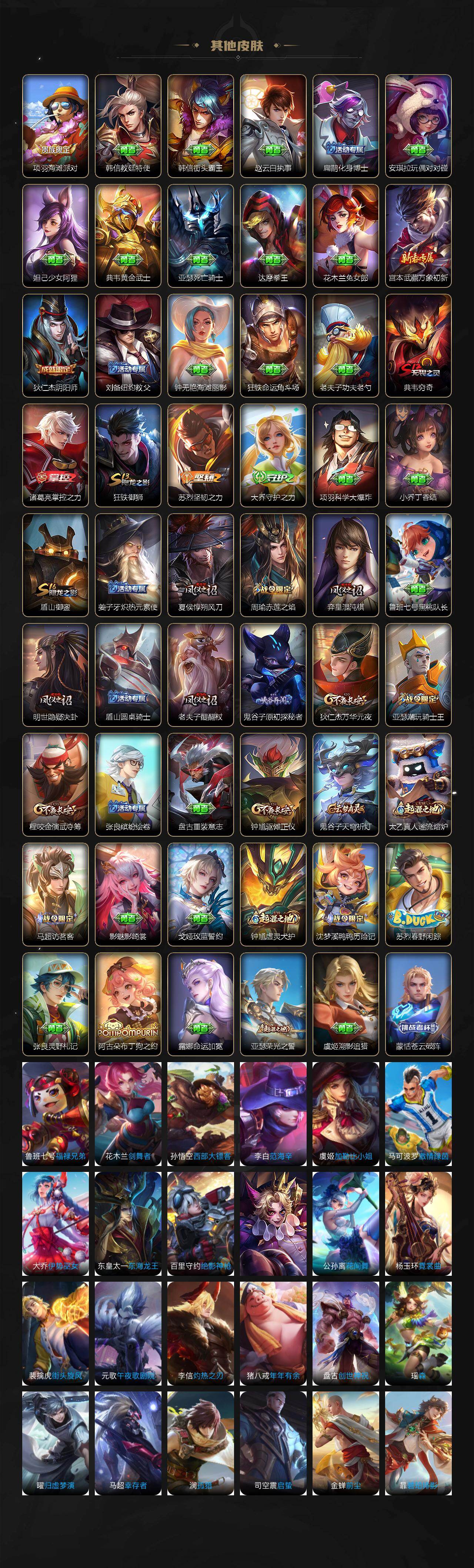 【限定皮肤】:狄仁杰阴阳师,赵云皇家上将,周瑜赤莲之焰,元歌云间偶戏,夏侯惇朔风刀,典韦穷奇,马可波罗暗影游猎,狄仁杰万华元夜,项羽海滩派对,老夫子醍醐杖,程咬金演武夺筹,亚瑟潮玩骑