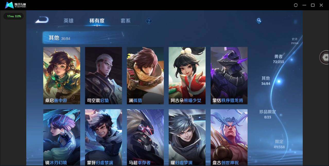 实名: 可修改 贵族等级: V7 英雄数: 125 皮肤数: 143 星传说: 幽冥之眼 传说皮: 冠军飞将,地狱之眼,记忆之芯,妄想实况,惊梅引 限定皮: 李小龙,梁祝,白晶晶,神威,天狼绘梦者,五谷丰年
