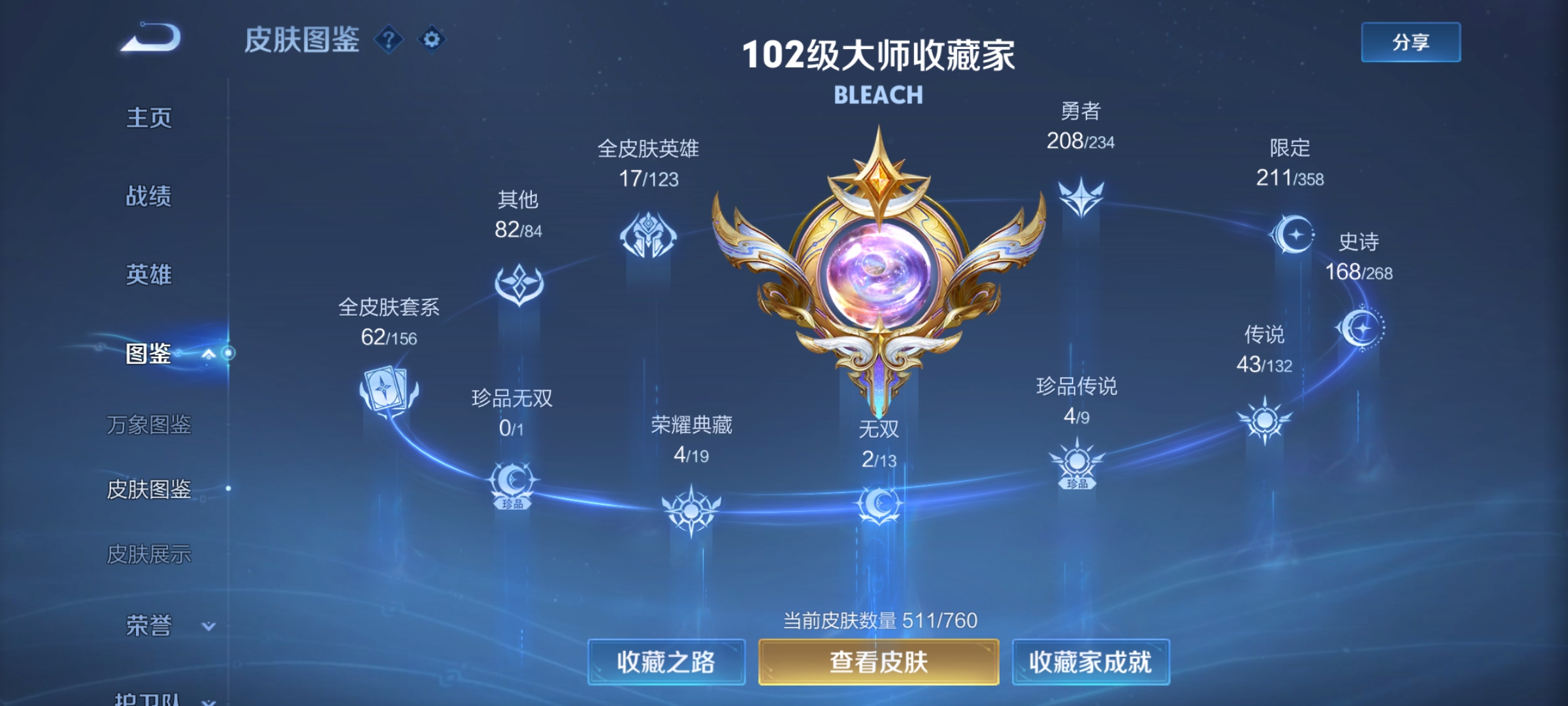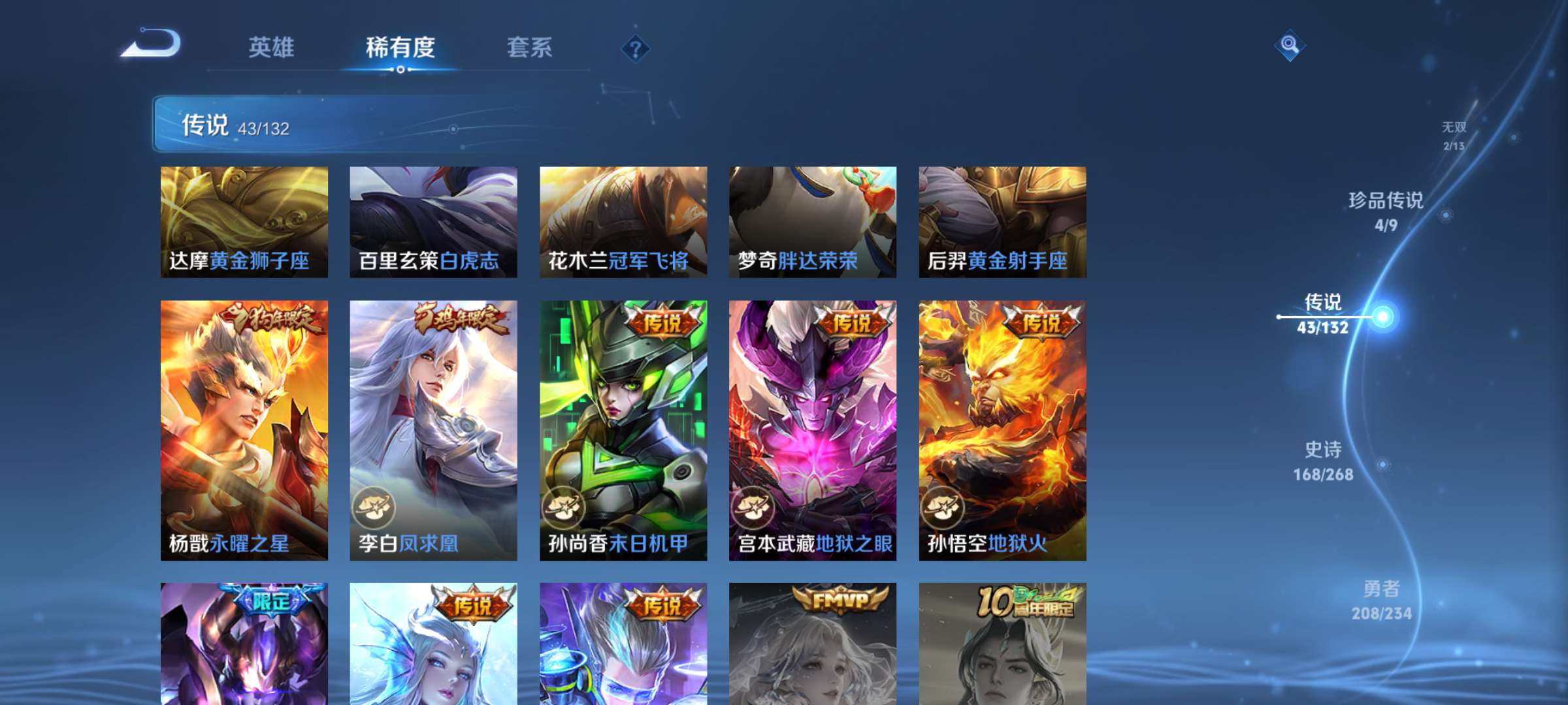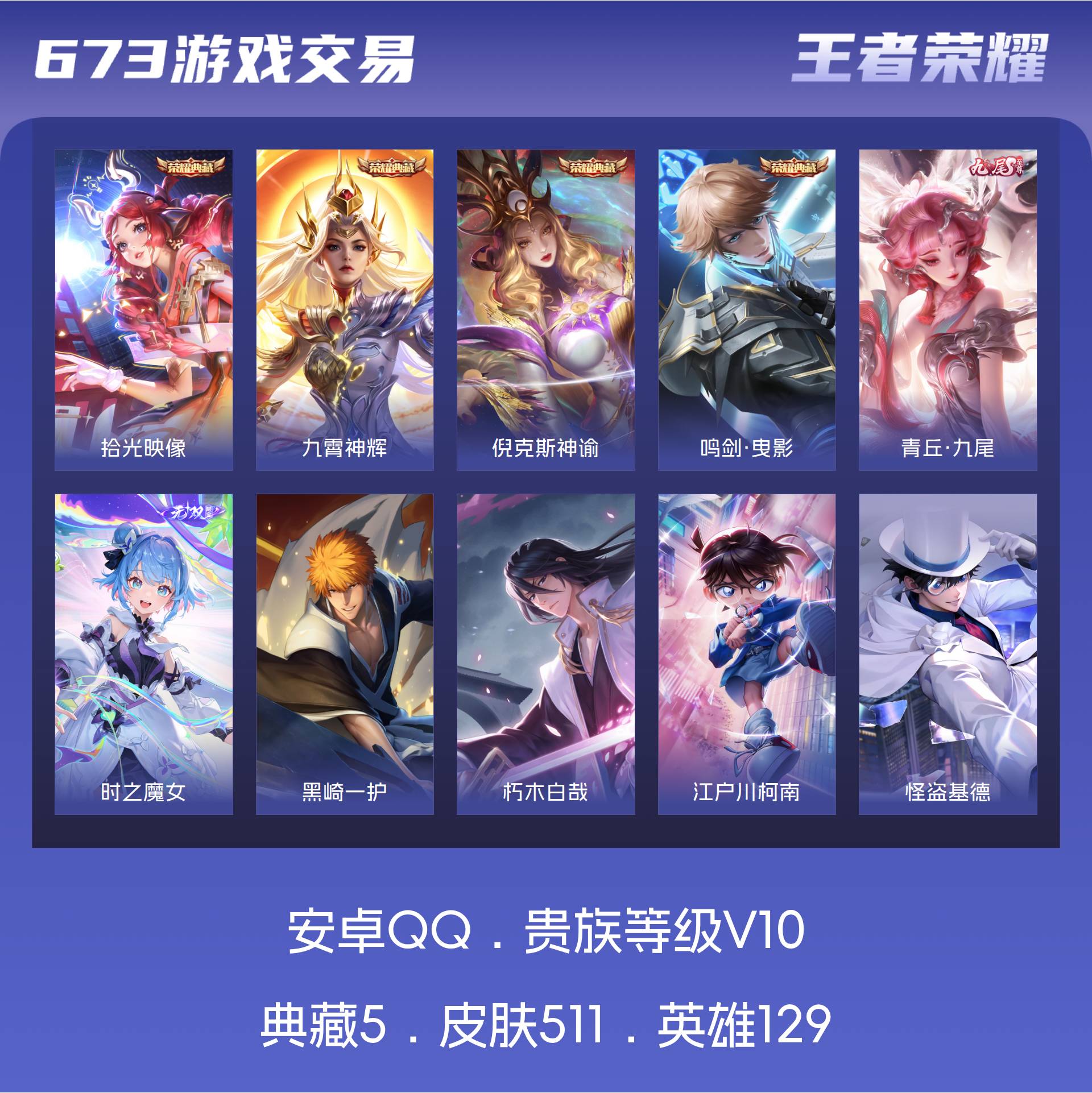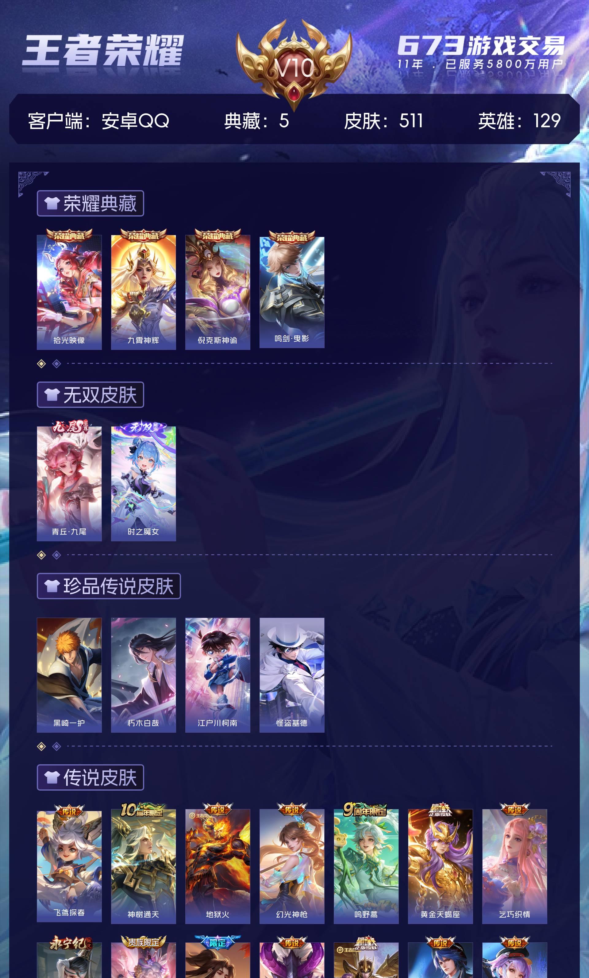 V10 皮肤511 英雄129 至尊星耀 荣耀典藏5 无双皮肤2 珍品传说4 传说43 其他皮肤461