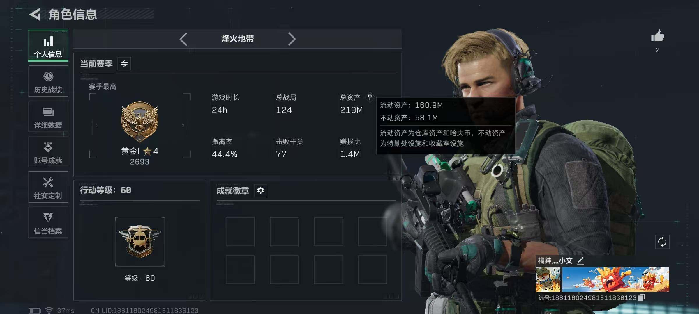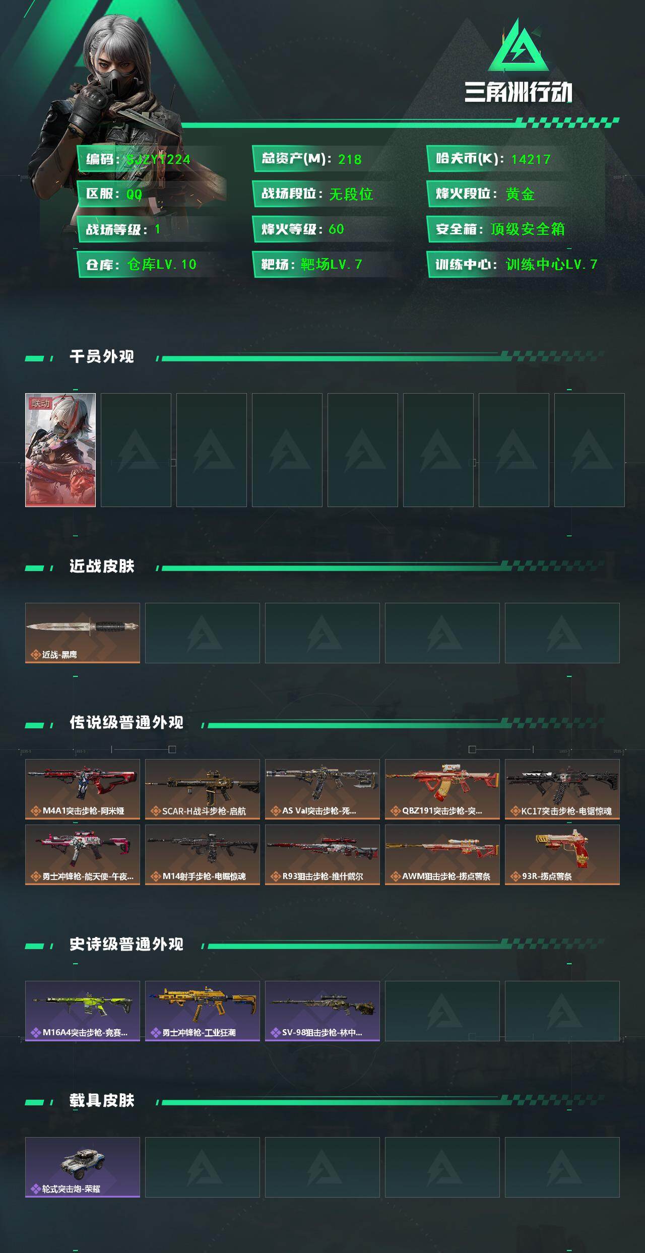 【SJZYT224】总资产(M):218M/哈夫币(K):14217K/哈夫币(K):14217K/传说枪皮数:10/全面战场等级:1_段位:无段位/烽火地带等级:60_段位:黄金/骇爪-维什戴尔/近战-黑鹰/M4A1突击步枪-阿米娅/SCAR-H战斗步枪-启航/AS Val突击步枪-死神玫瑰/腾龙突击步枪-捞点薯条/KC17突击步枪-电锯惊魂/勇士冲锋枪-能天使-午夜邮差/M14射手步枪-电锯惊魂/R93狙击步枪-维什戴尔/AWM狙击步枪-捞点薯条/93R-捞点薯条/M16A4突击步枪-竞赛选