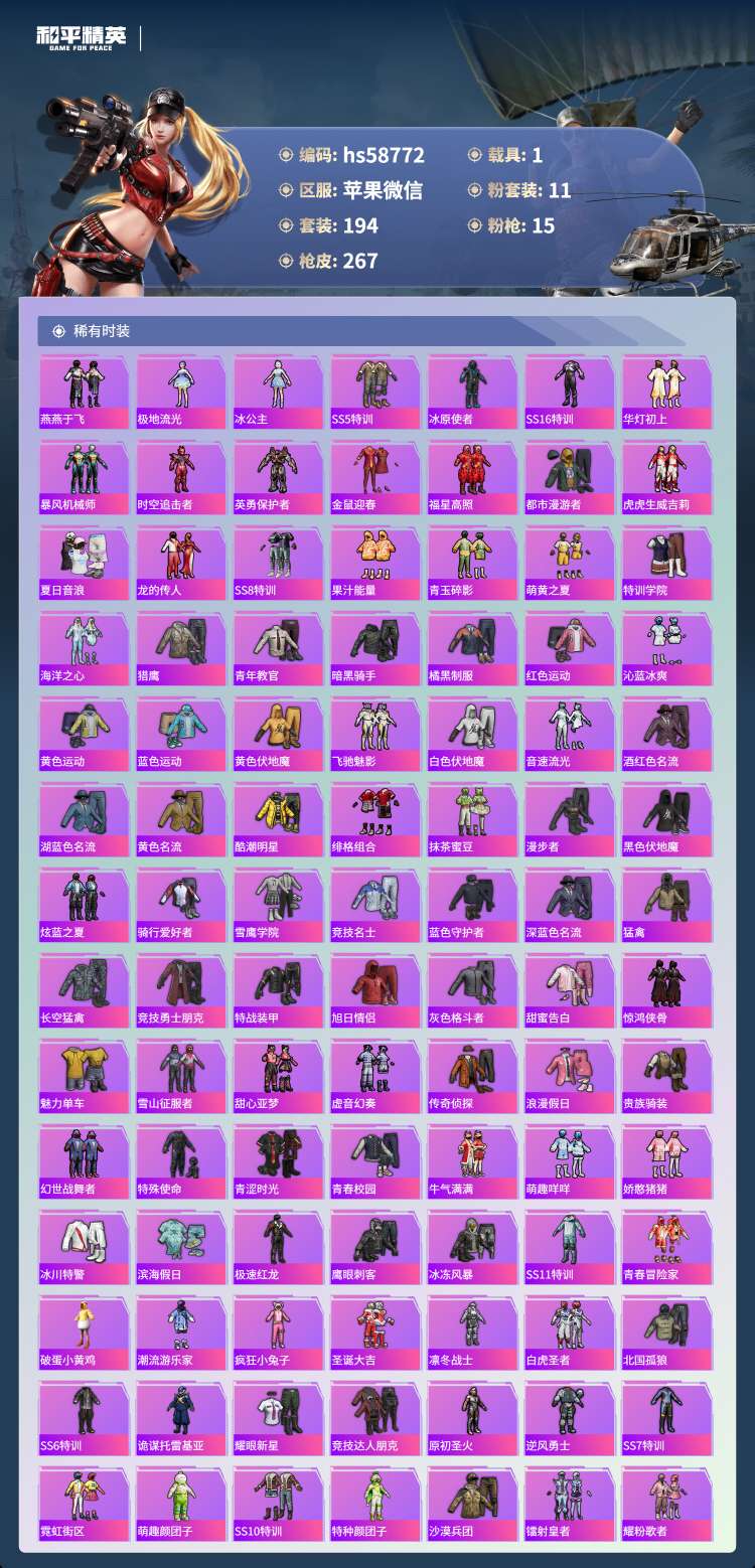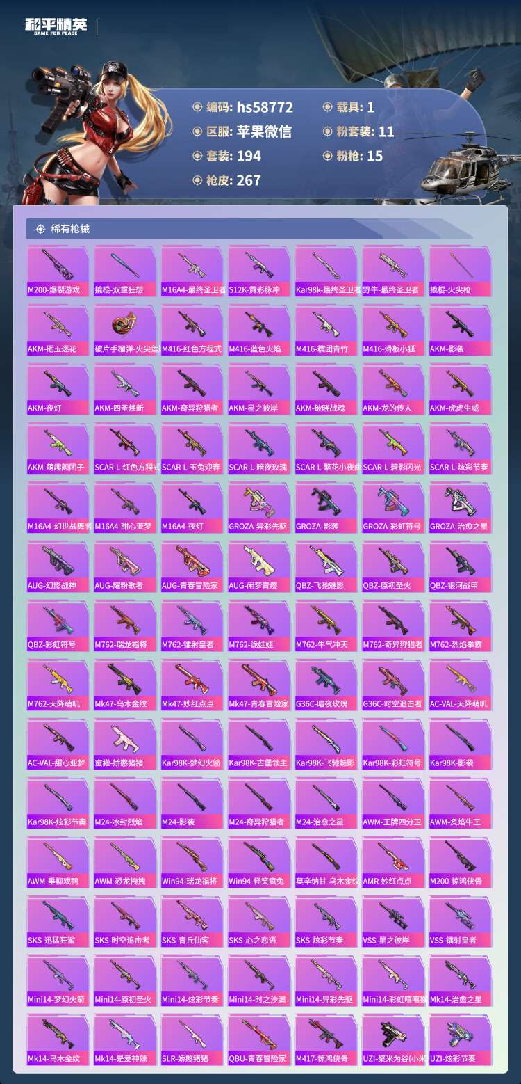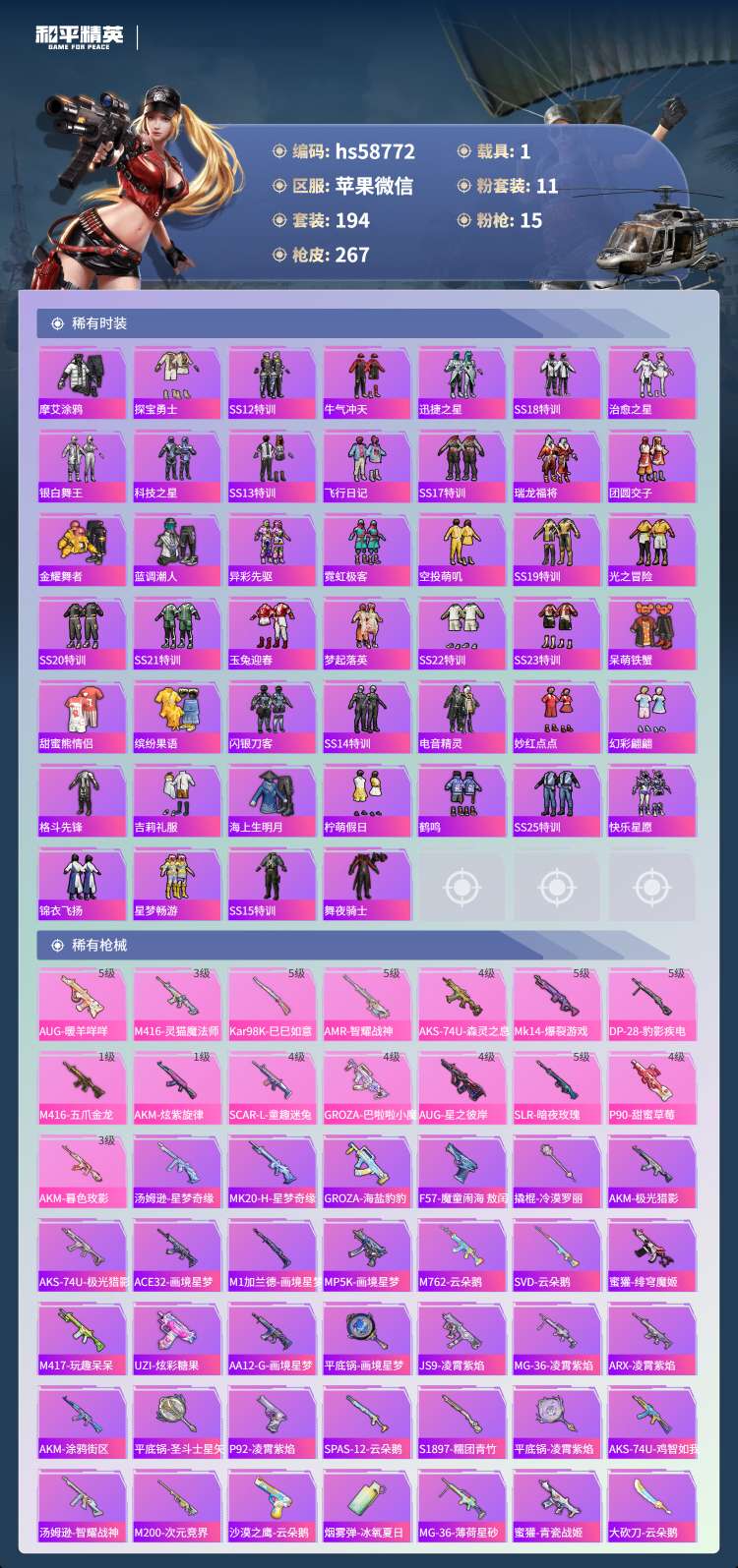 hs58772 苹果微-17王牌印记-1红装-11粉装-15特效枪-1载具-87583热力值-19