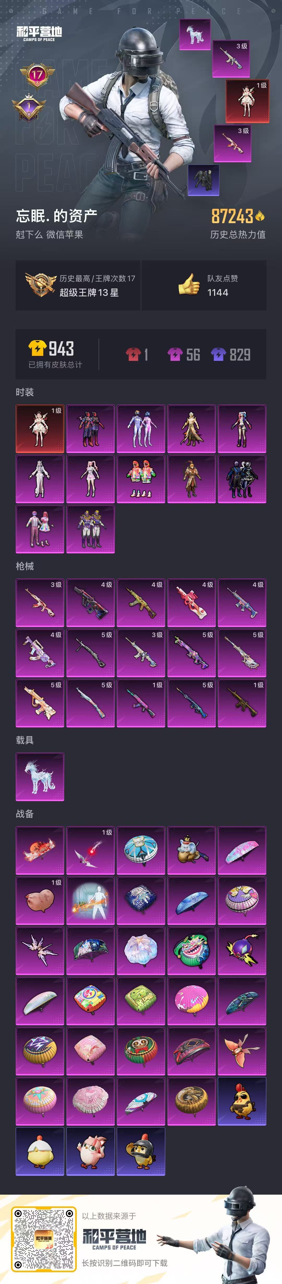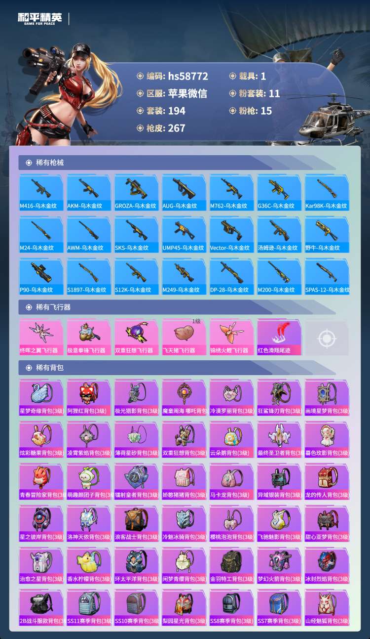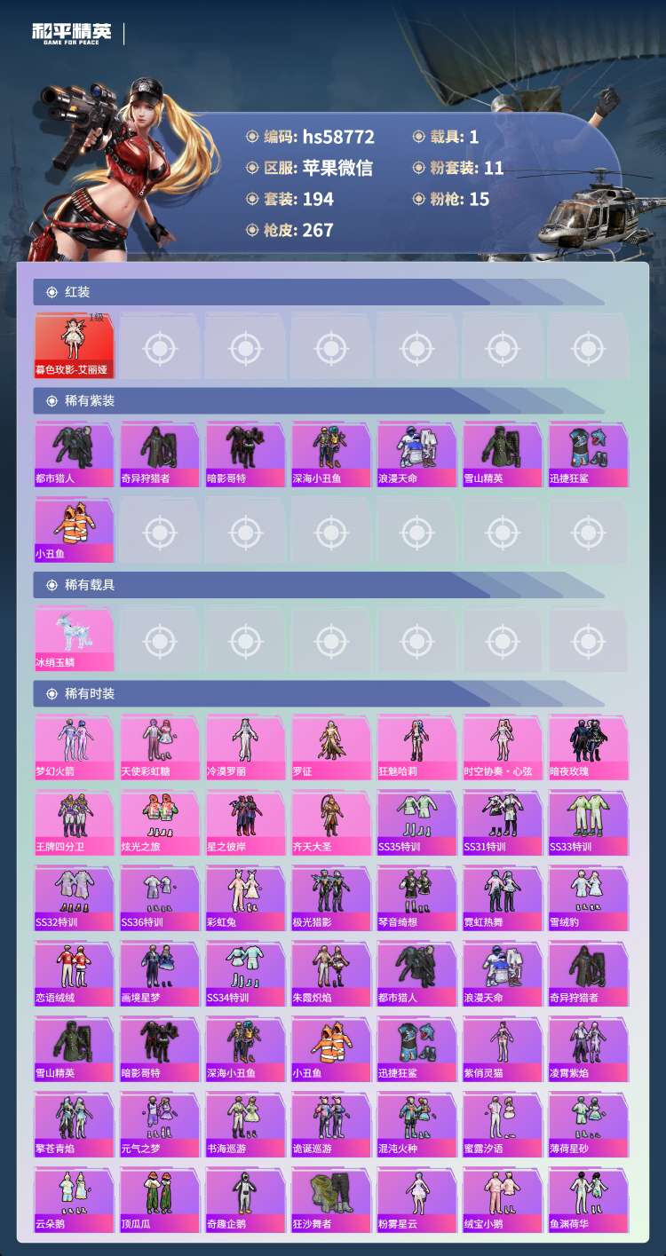 hs58772 苹果微-17王牌印记-1红装-11粉装-15特效枪-1载具-87583热力值-19