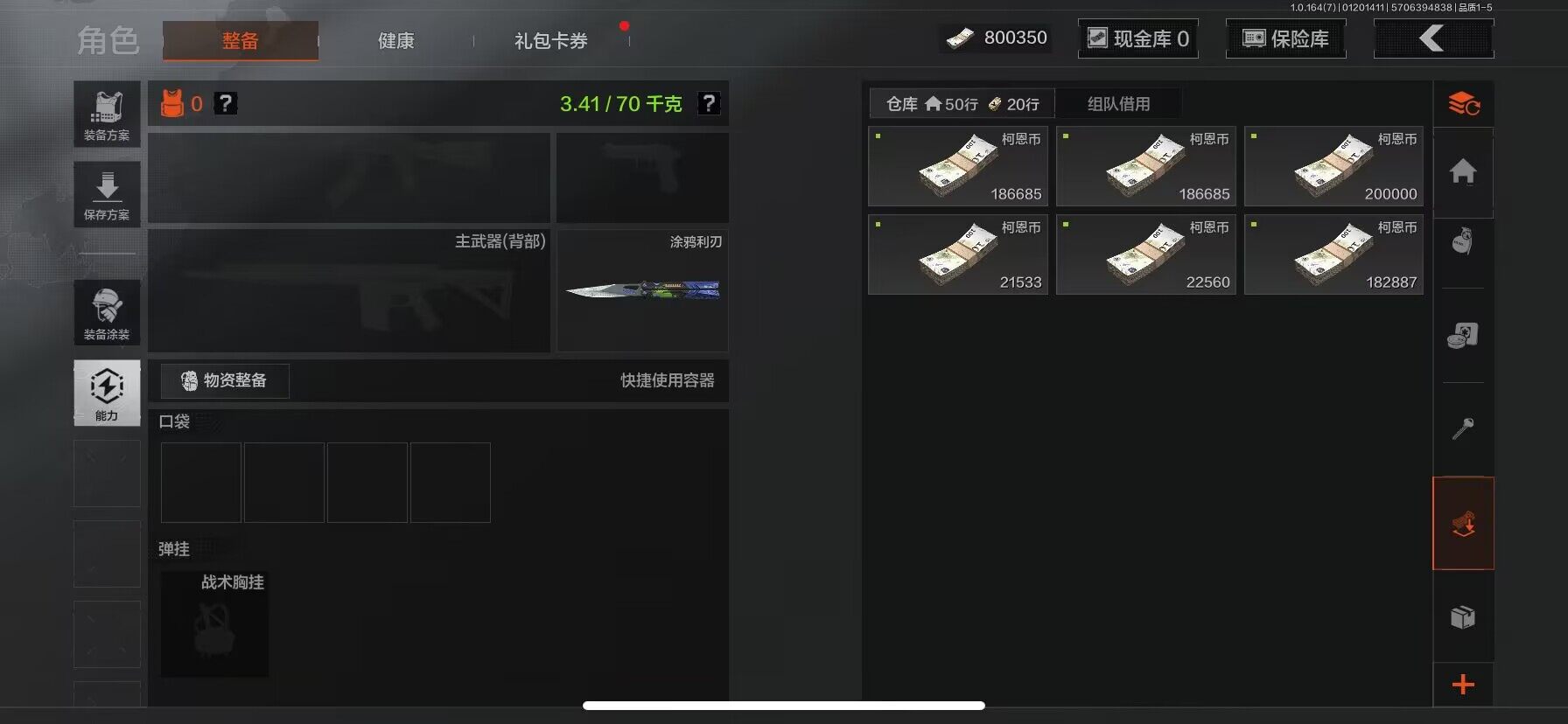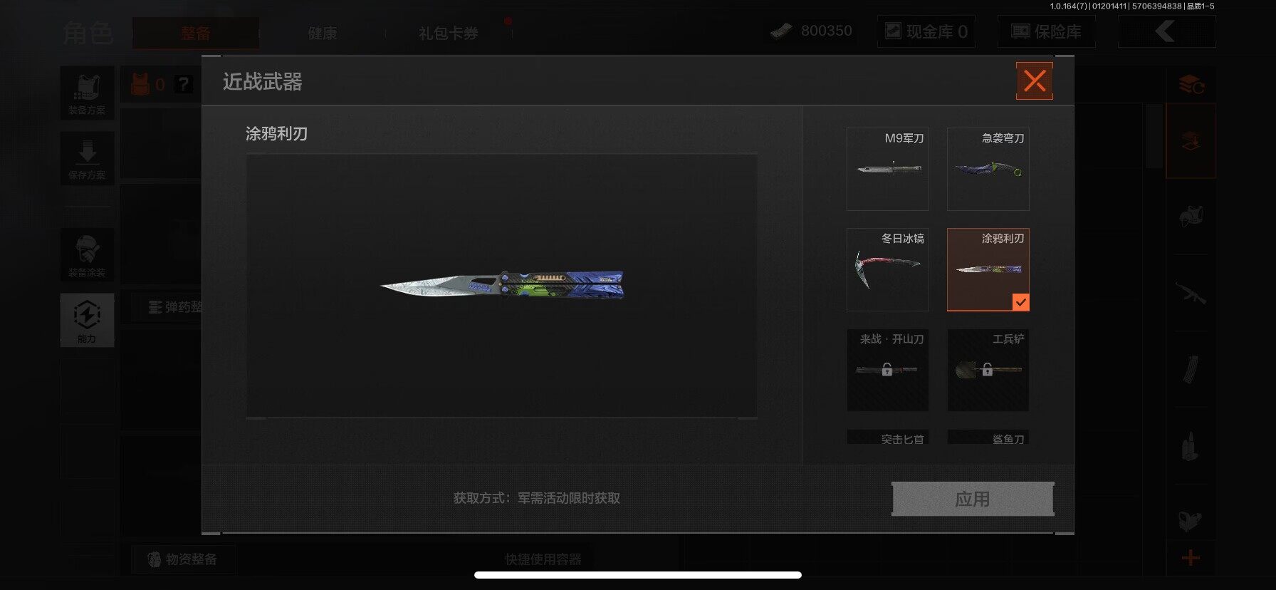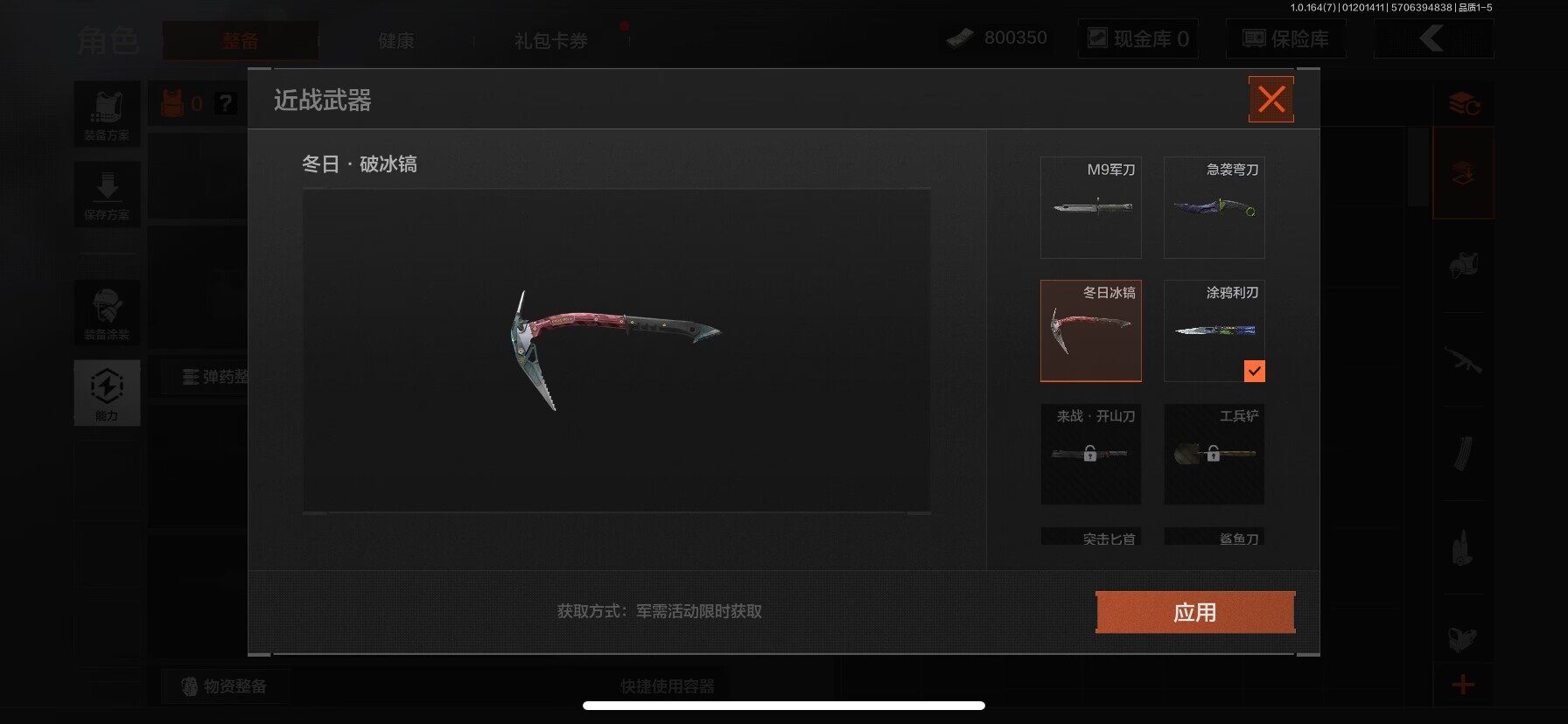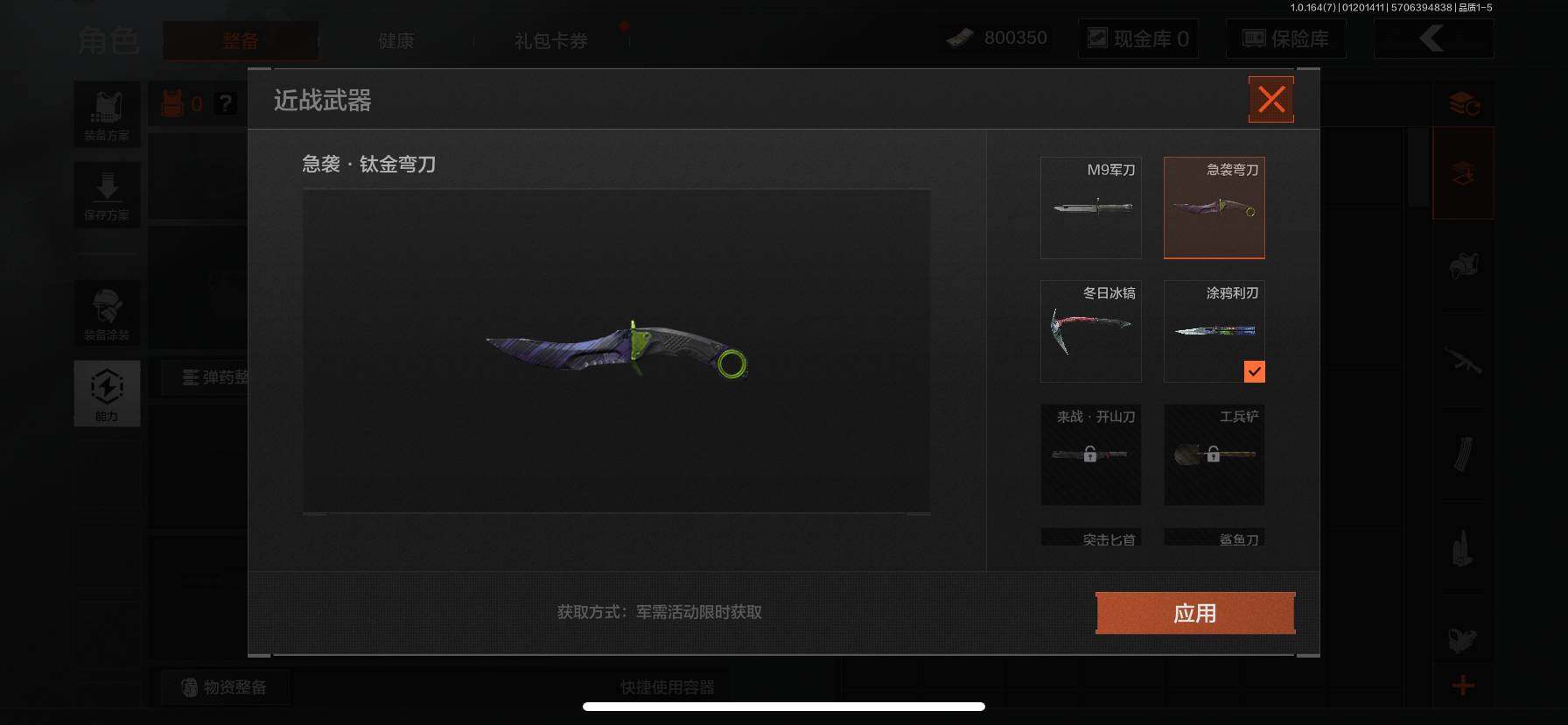 仓库价值(百万):1/柯恩币:800350/急袭弯刀/涂鸦利刃/冬日冰镐