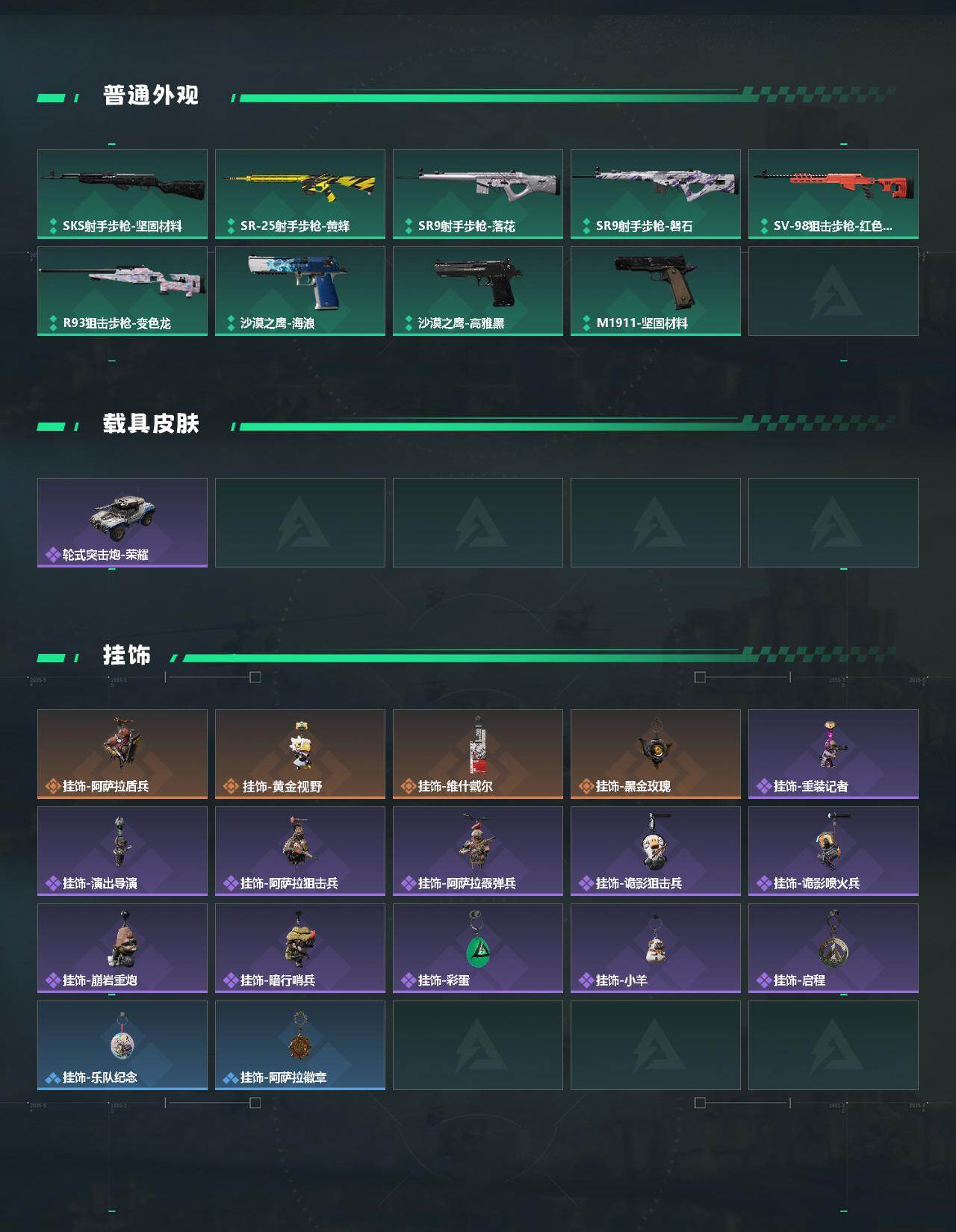 【史诗外观】:ASh-12战斗步枪-碎冰行动,AKM突击步枪-林中猎手,ASh-12战斗步枪-守夜人,M16A4突击步枪-竞赛选手,SG552突击步枪