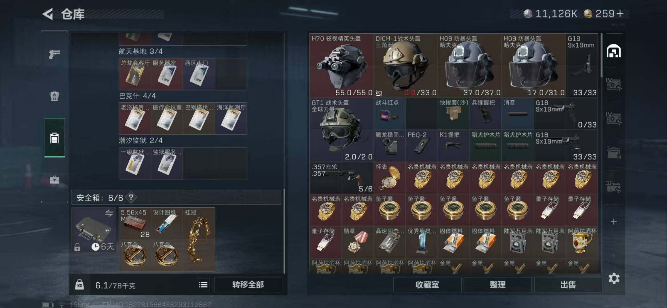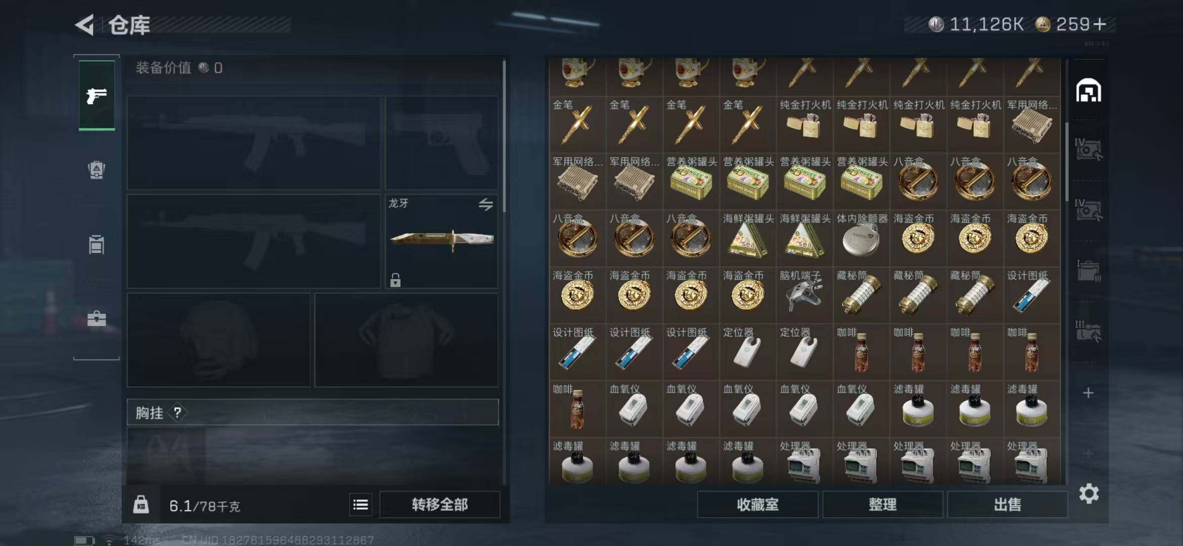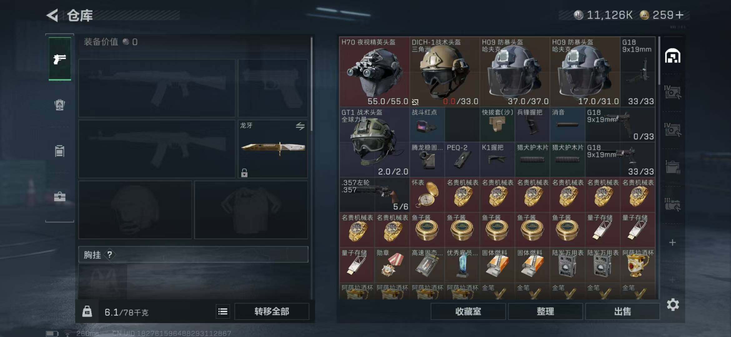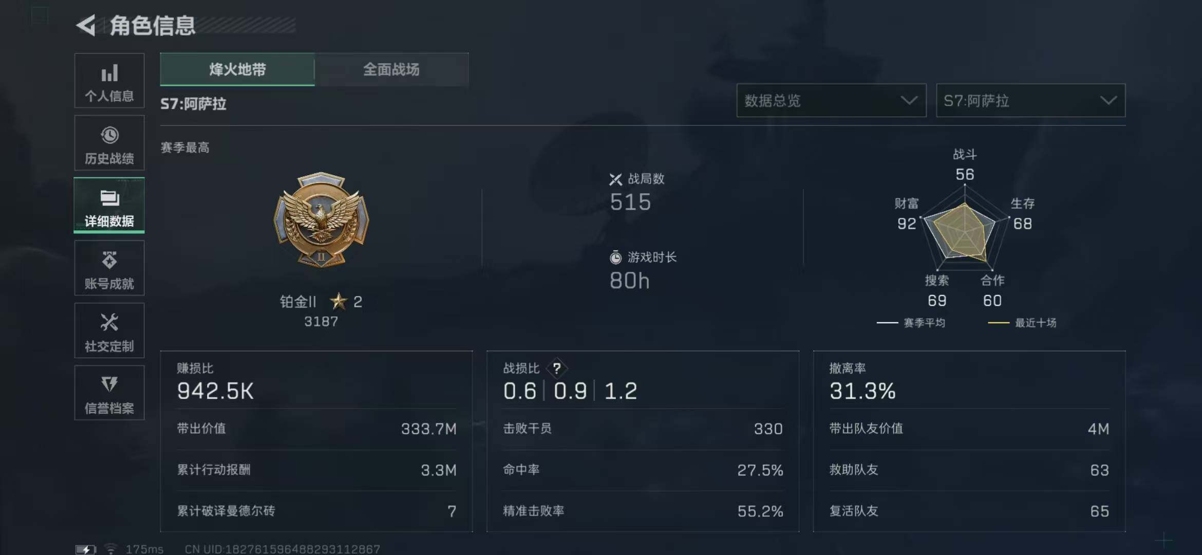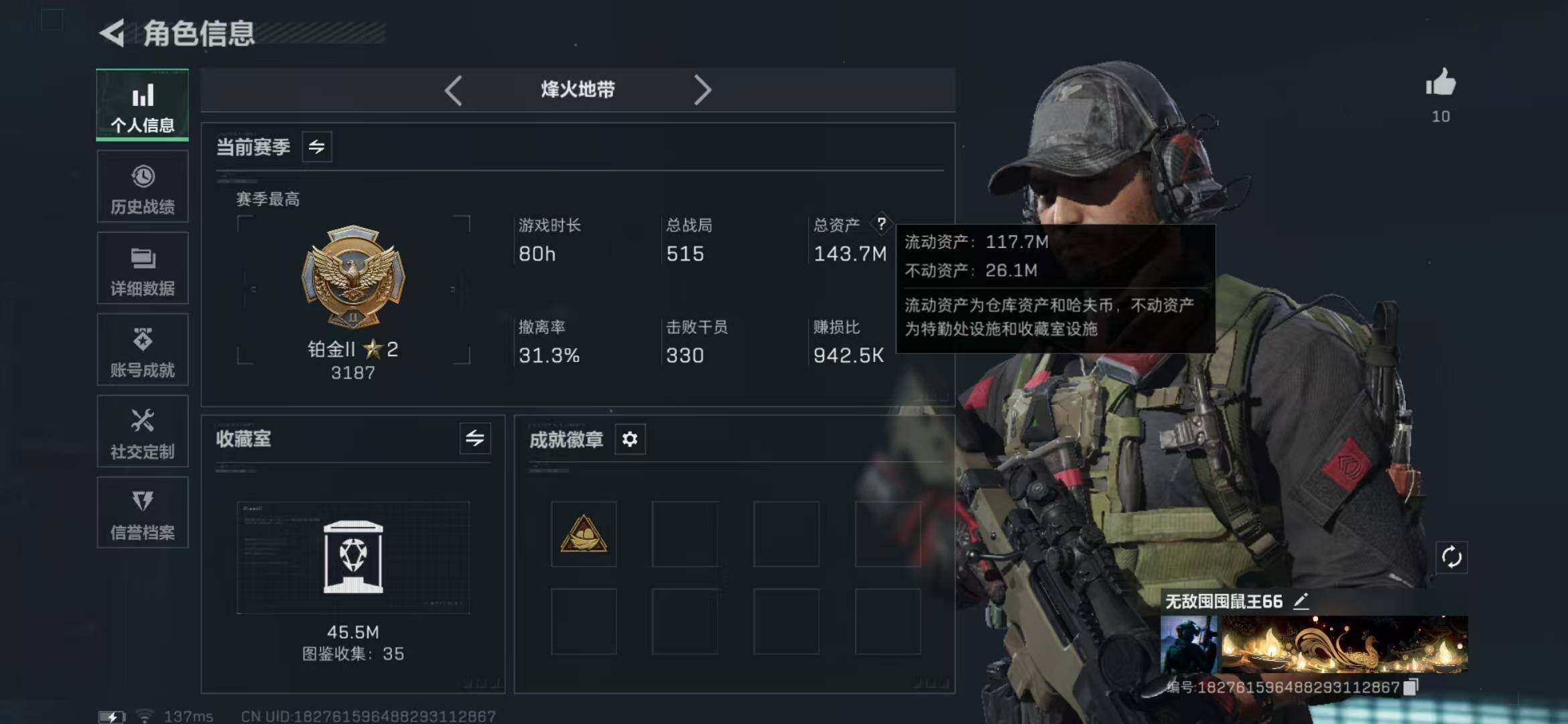 143m总资产-11126k哈伏币-60烽火等级-铂金-1战场等级-无军衔