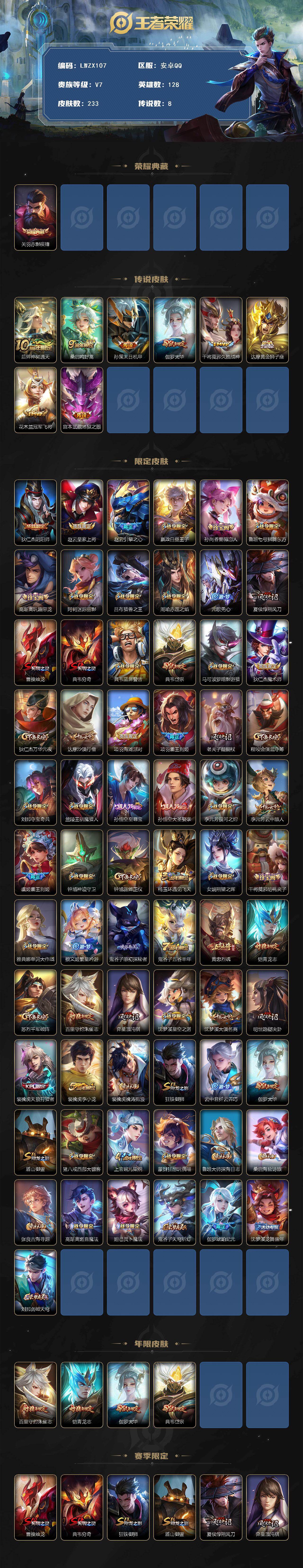 【特价出售/店主推荐】安卓Q-V7-永恒钻石III段位-128英雄-233皮肤-1典藏皮肤-8传说-68史诗