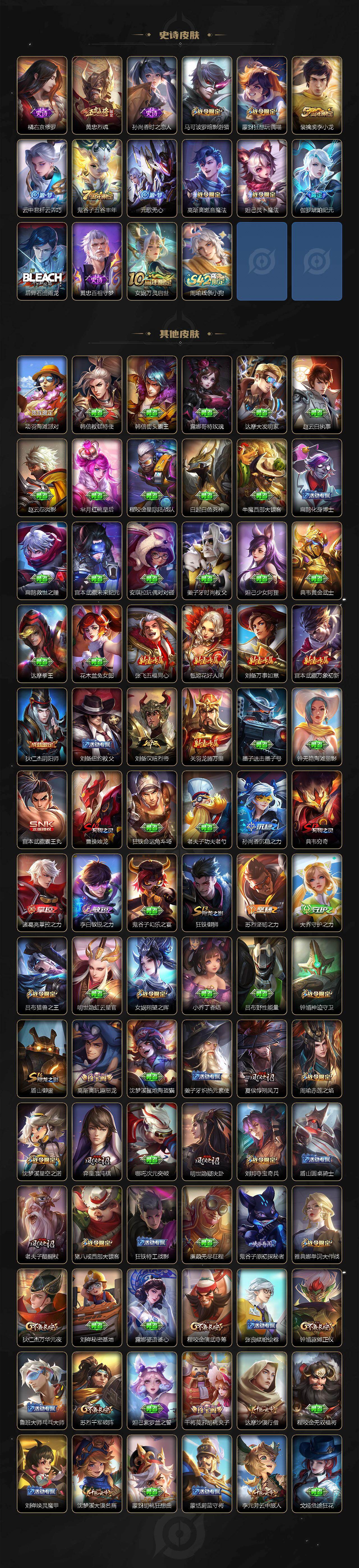 【传说皮肤】:后羿神树通天,桑启鸣野蒿,孙策末日机甲,伽罗太华,干将莫邪久胜战神,达摩黄金狮子座,花木兰冠军飞将,宫本武藏地狱之眼