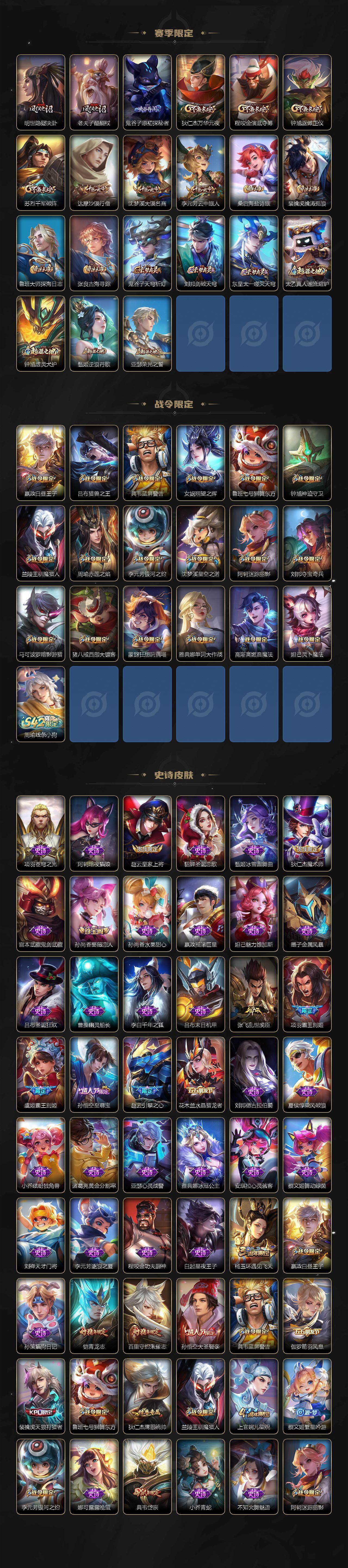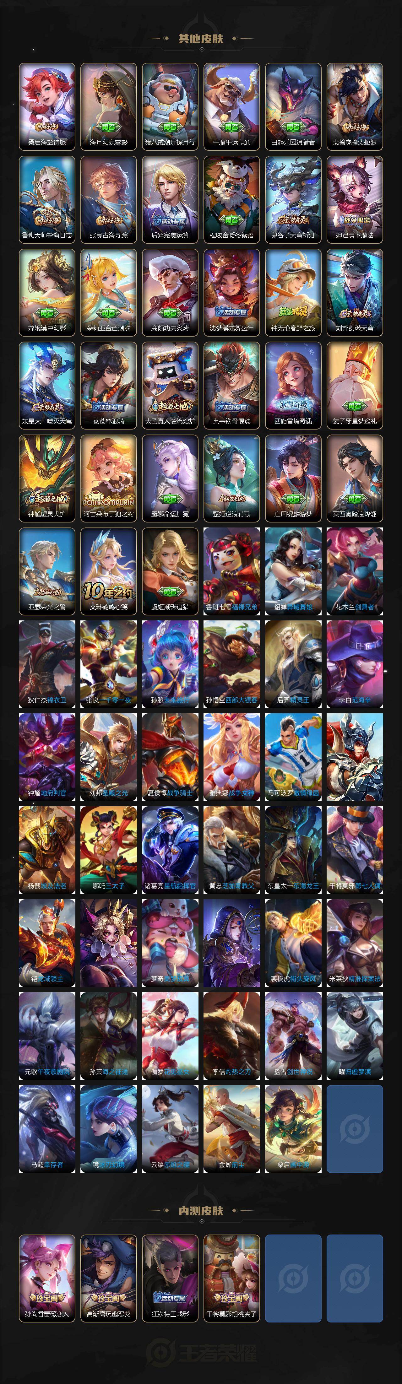 【限定皮肤】:狄仁杰阴阳师,赵云皇家上将,赵云引擎之心,嬴政白昼王子,孙尚香蔷薇恋人,鲁班七号狮舞