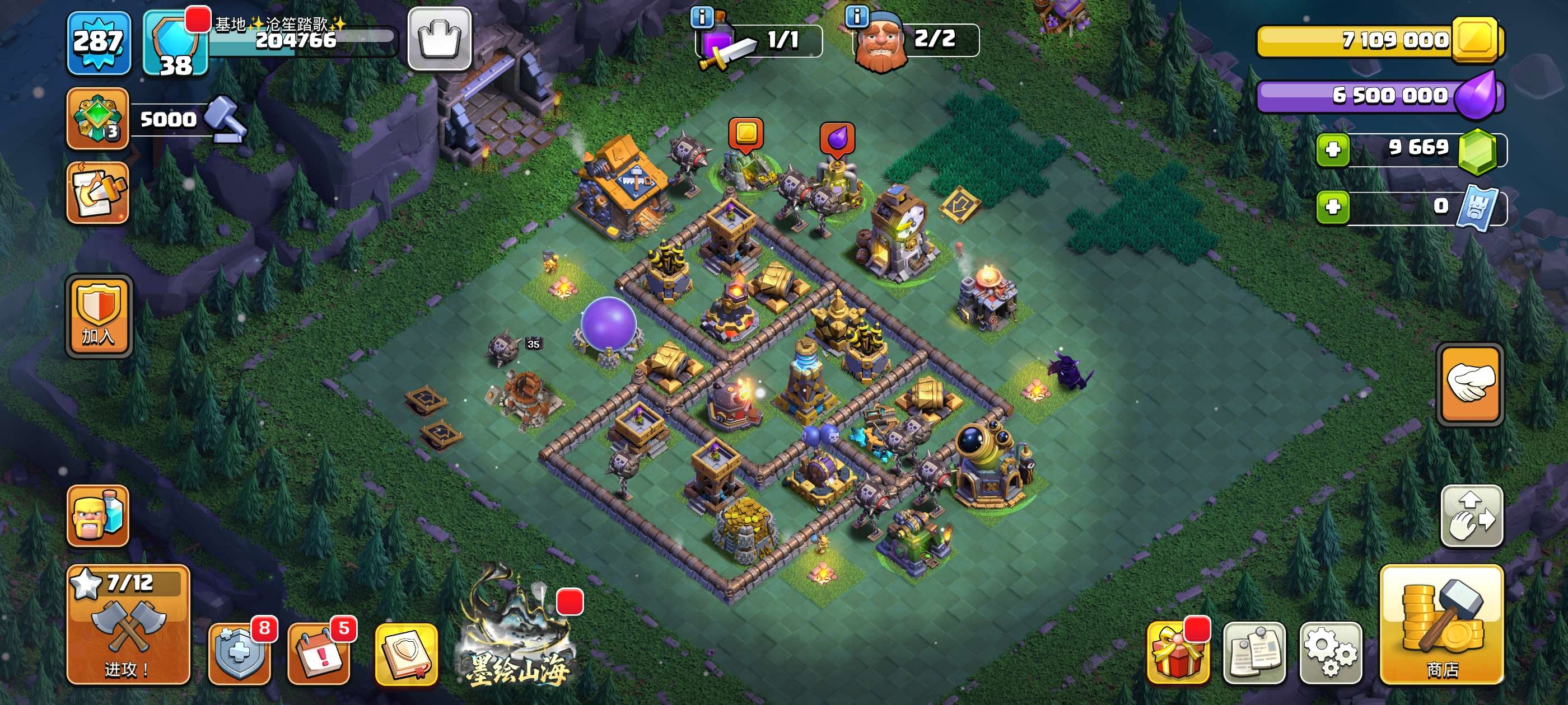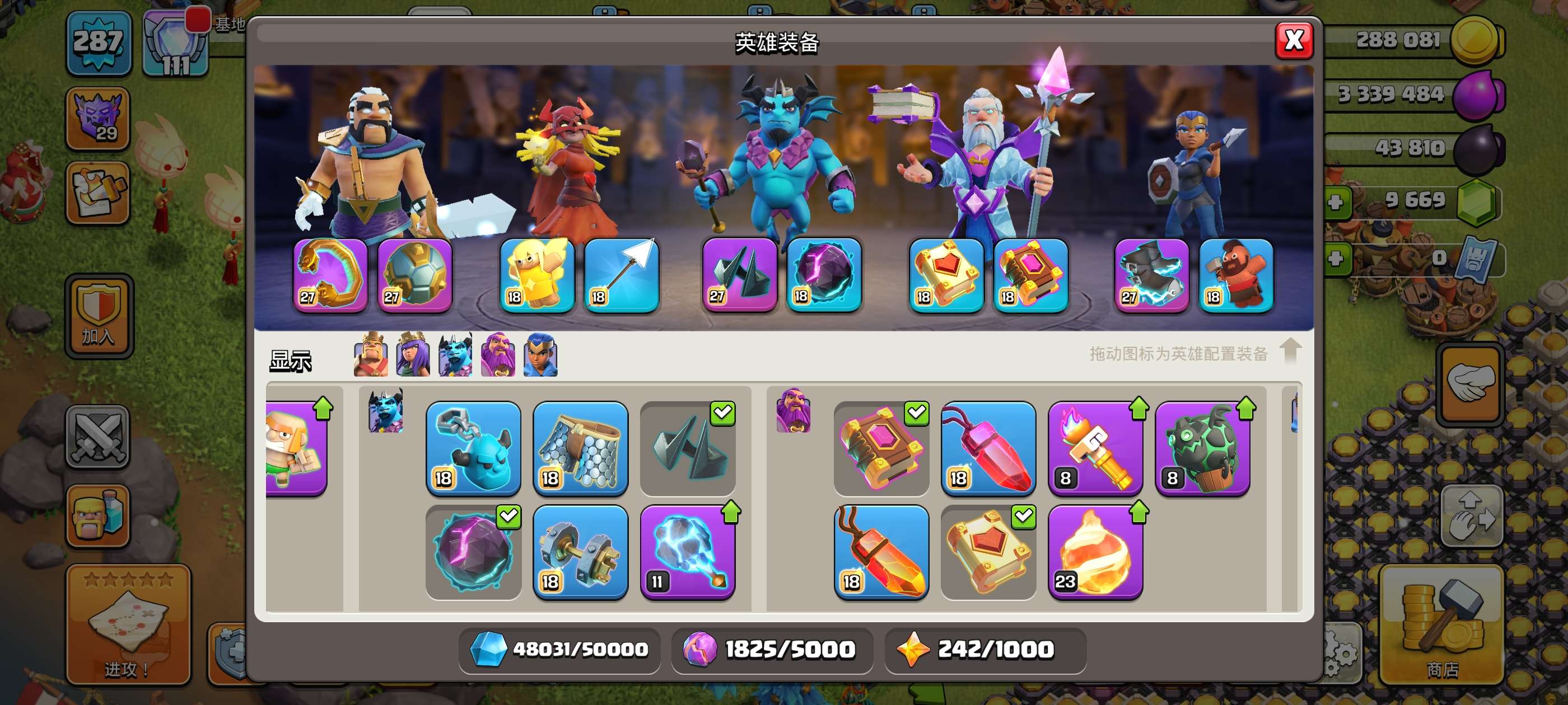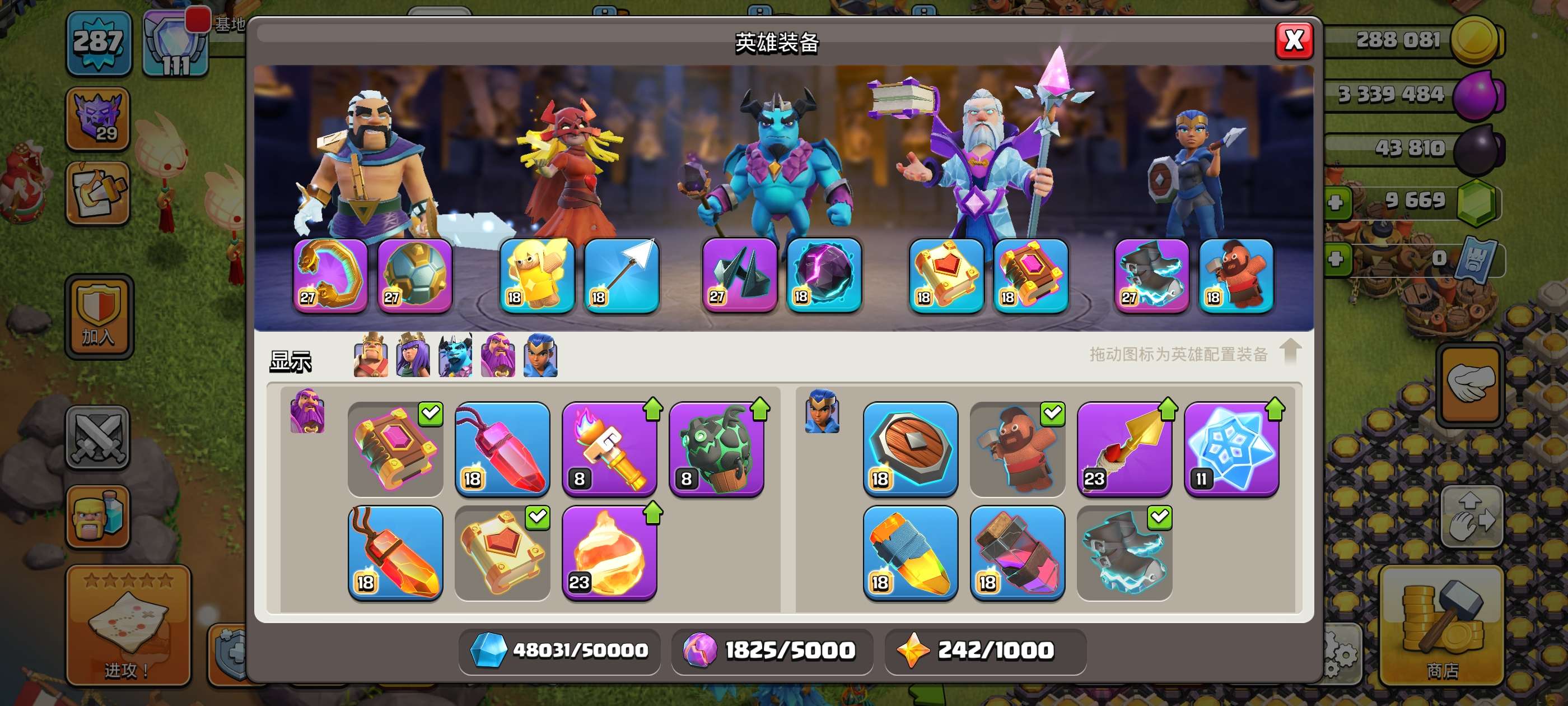 287级,夜世界38级科技防御城墙俩英雄全满毕业!主世界111繁荣,装备很好,5王等级高9700宝石