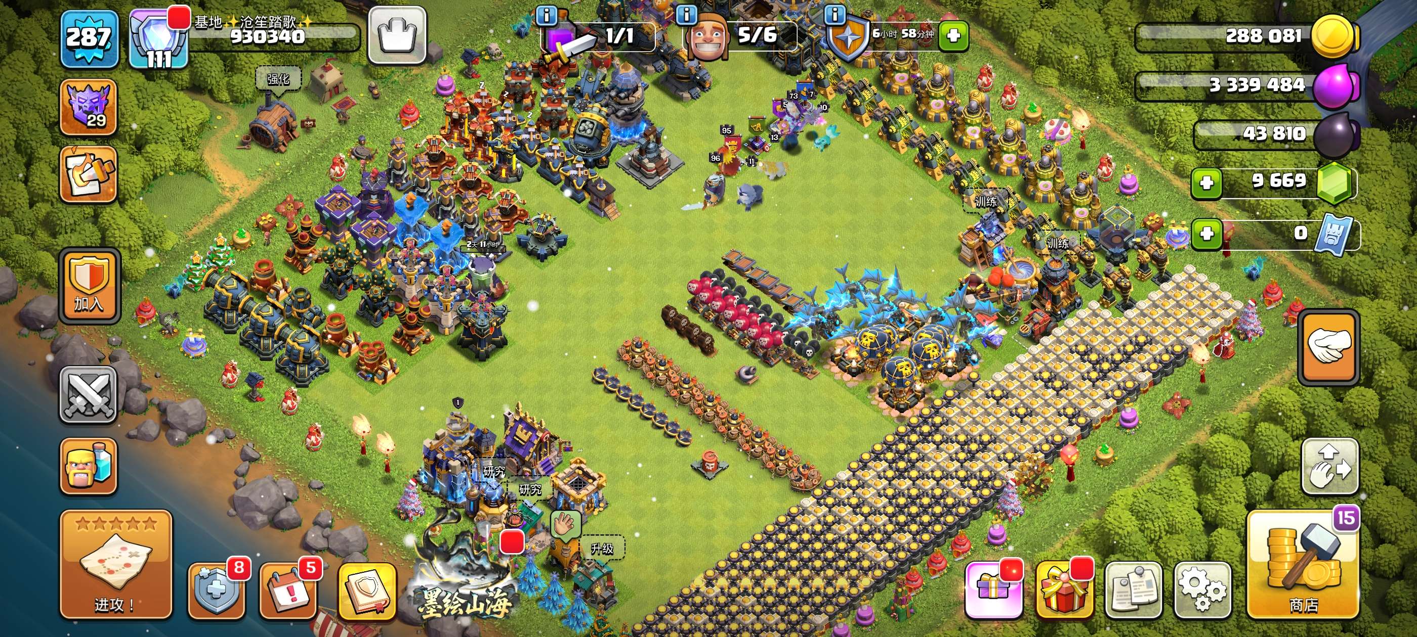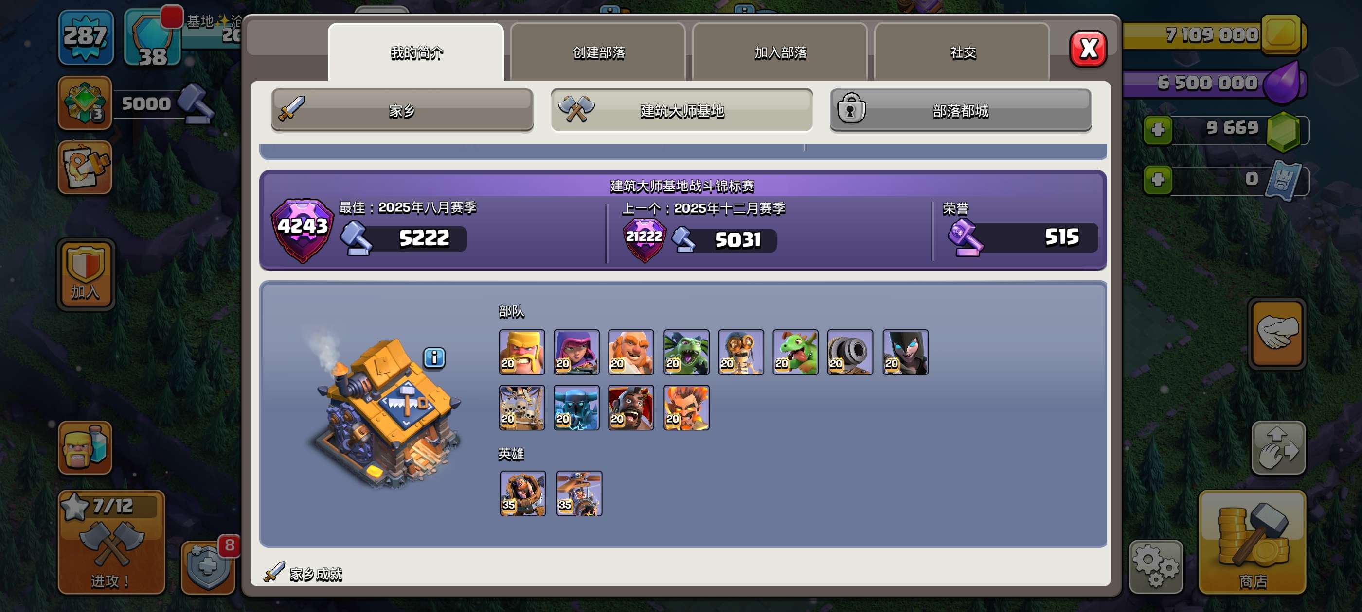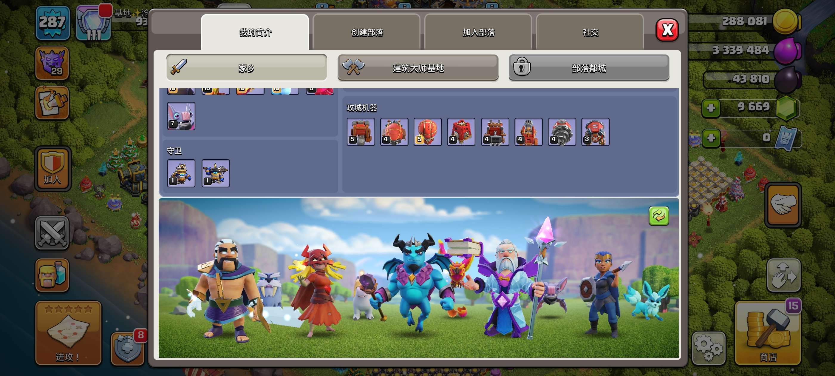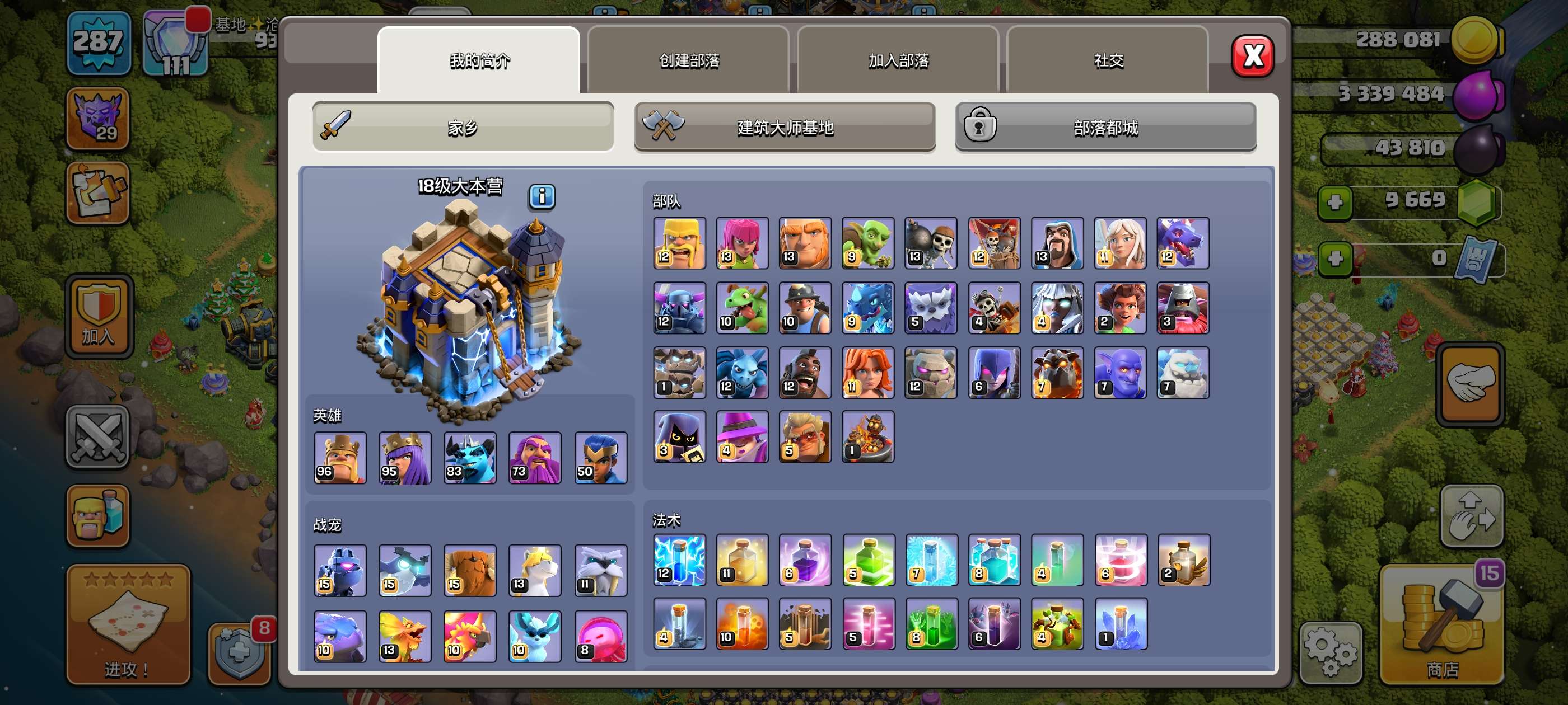 287级,夜世界38级科技防御城墙俩英雄全满毕业!主世界111繁荣,装备很好,5王等级高9700宝石