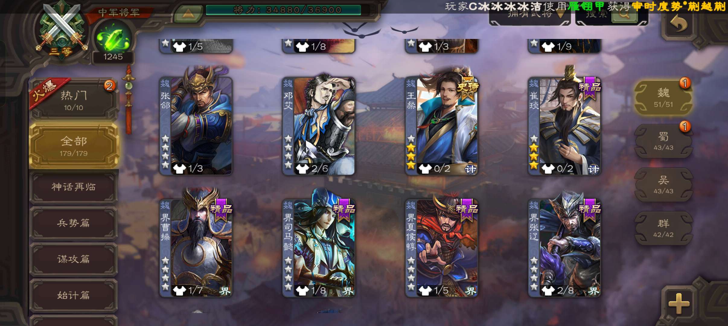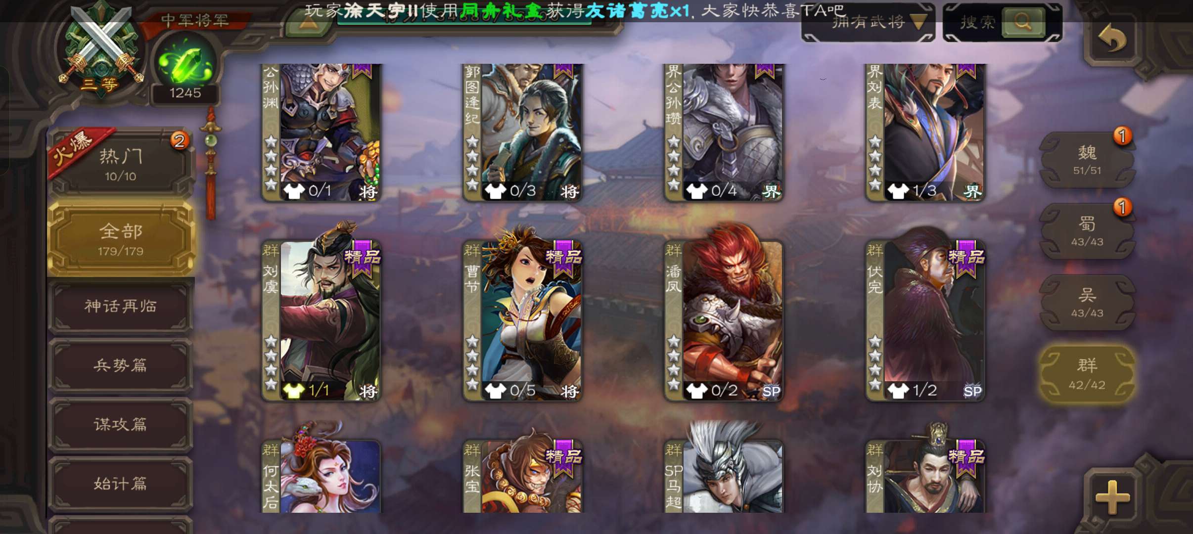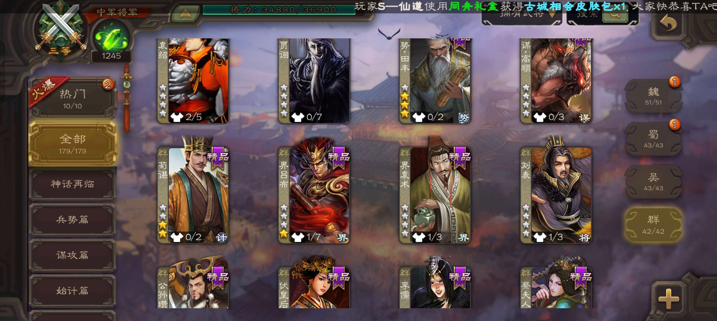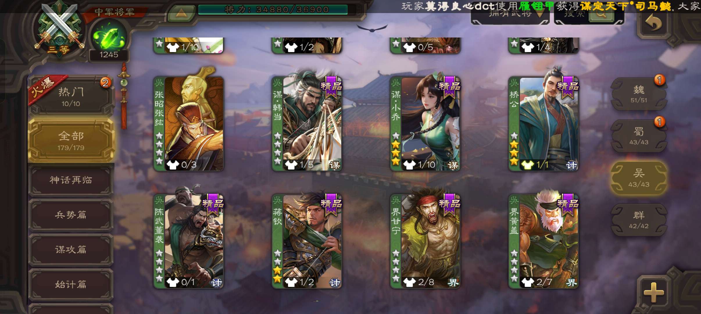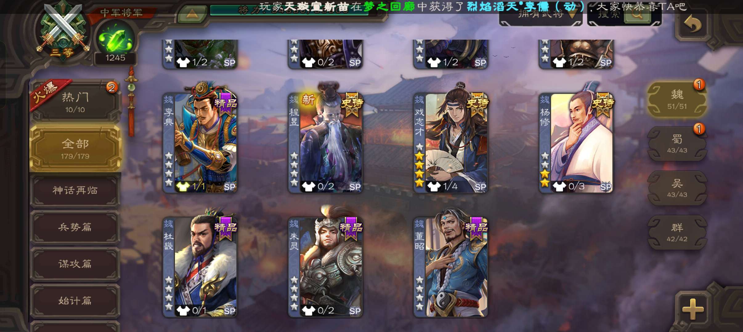 5史诗中军,玉龙动态戏志才庞德公王粲杨修程昱5史诗,谋小乔桥公谋高顺谋韩当崔琰179将