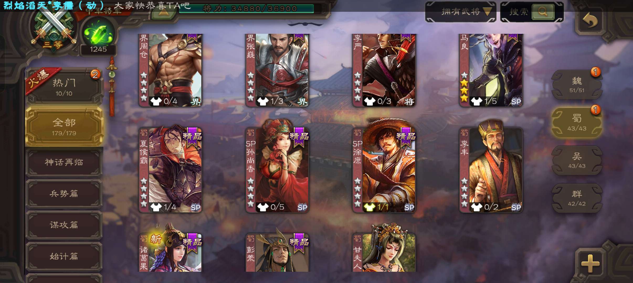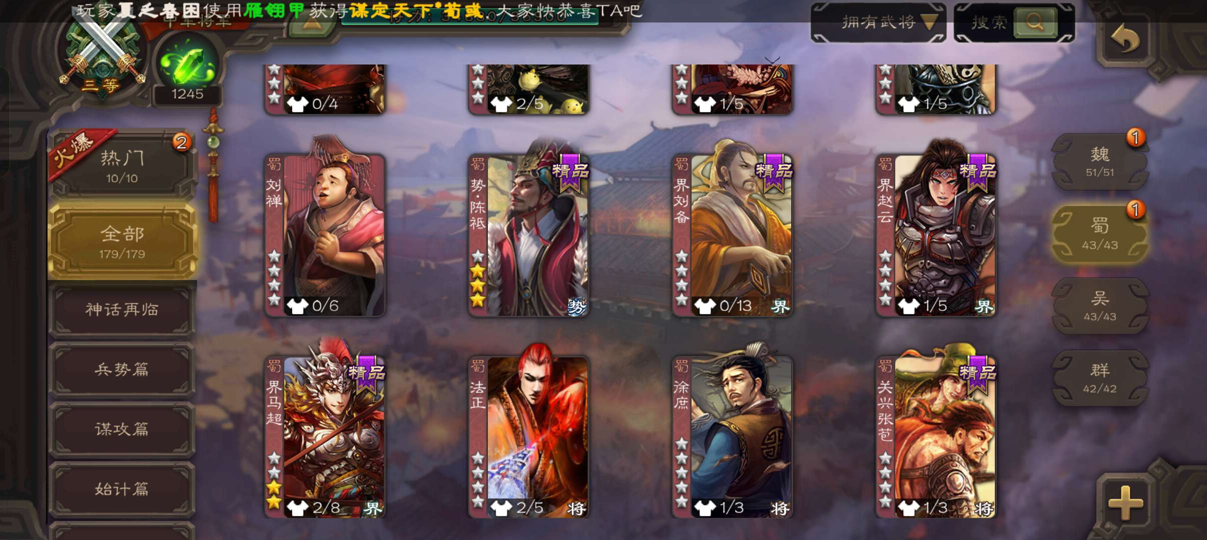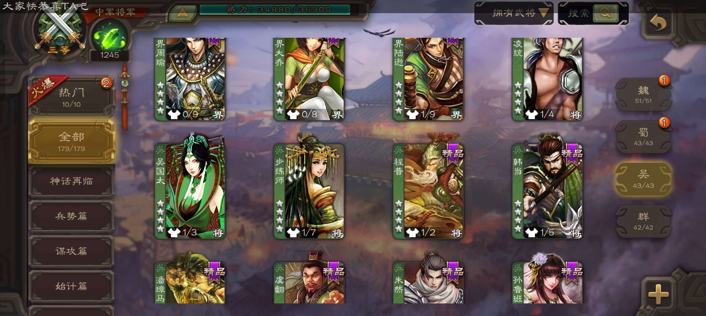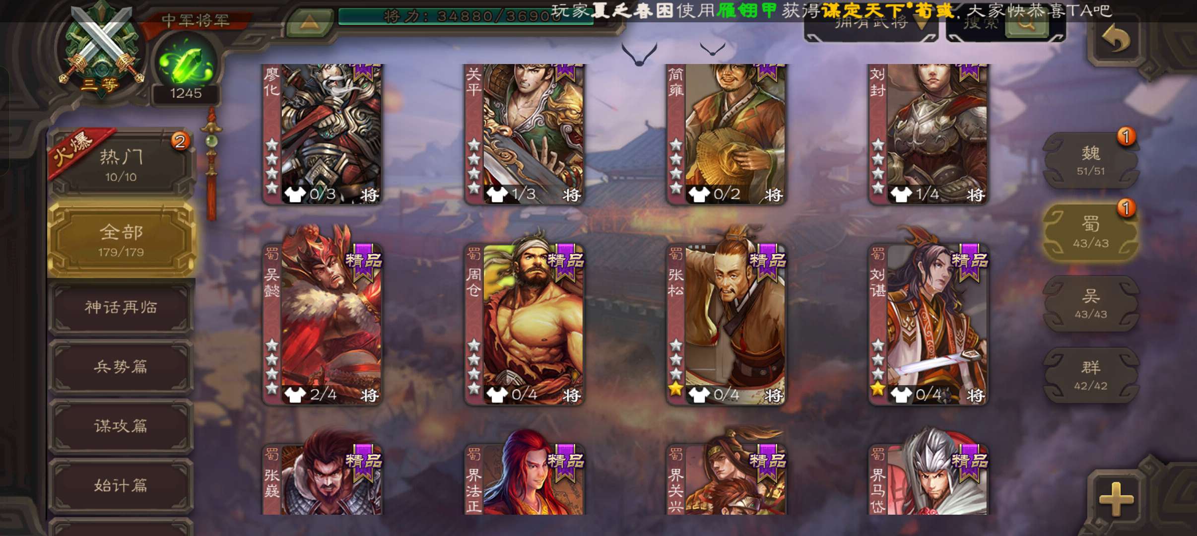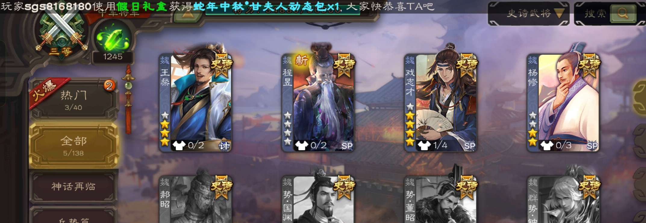 5史诗中军,玉龙动态戏志才庞德公王粲杨修程昱5史诗,谋小乔桥公谋高顺谋韩当崔琰179将
