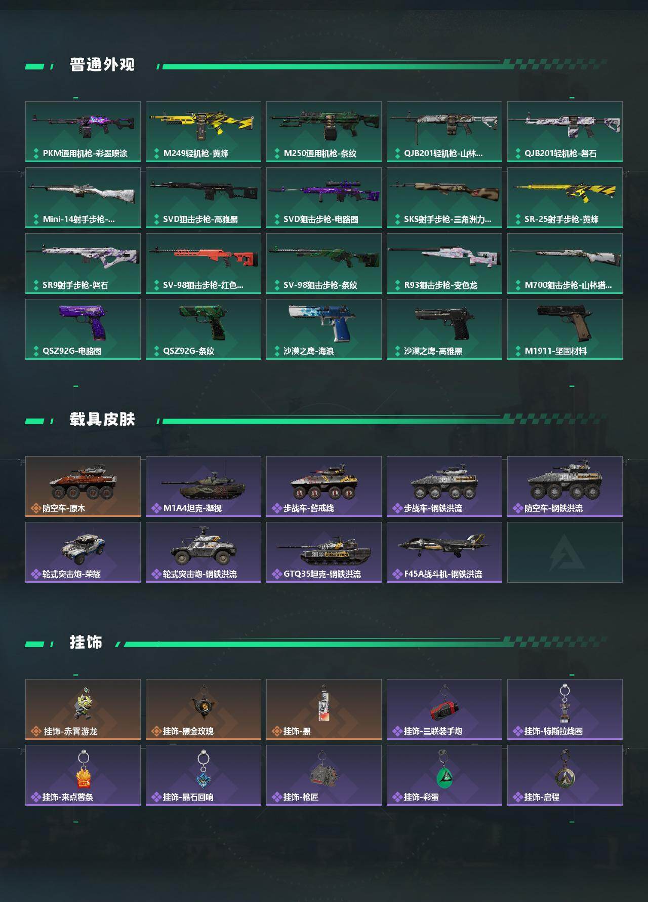 【传说外观】:M4A1突击步枪-蚀金玫瑰,M4A1突击步枪-阿米娅,ASh-12战斗步枪-鹅鸭杀,SG552突击步枪-运动员,AK-12突击步枪-特斯拉线圈,SCAR