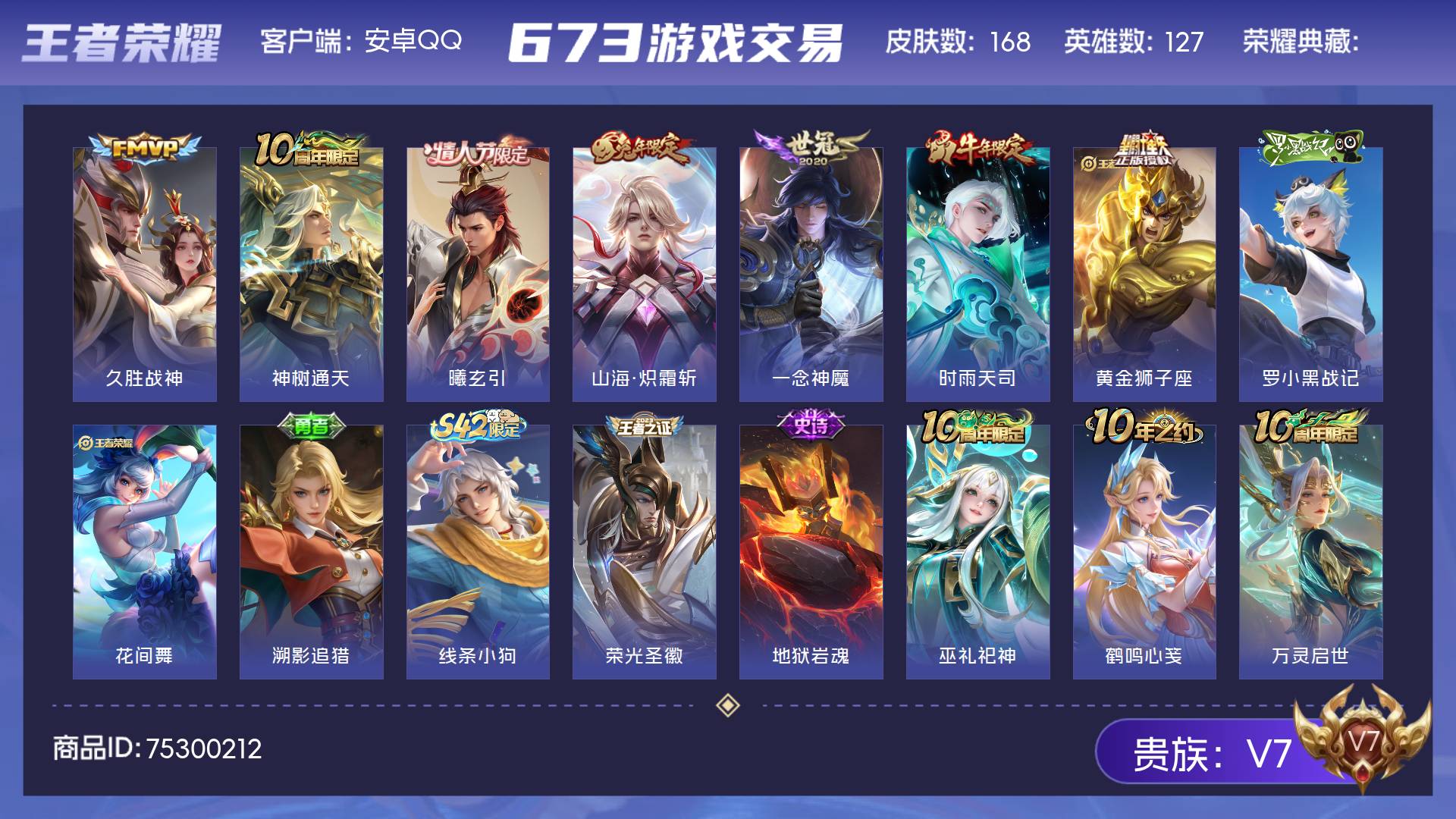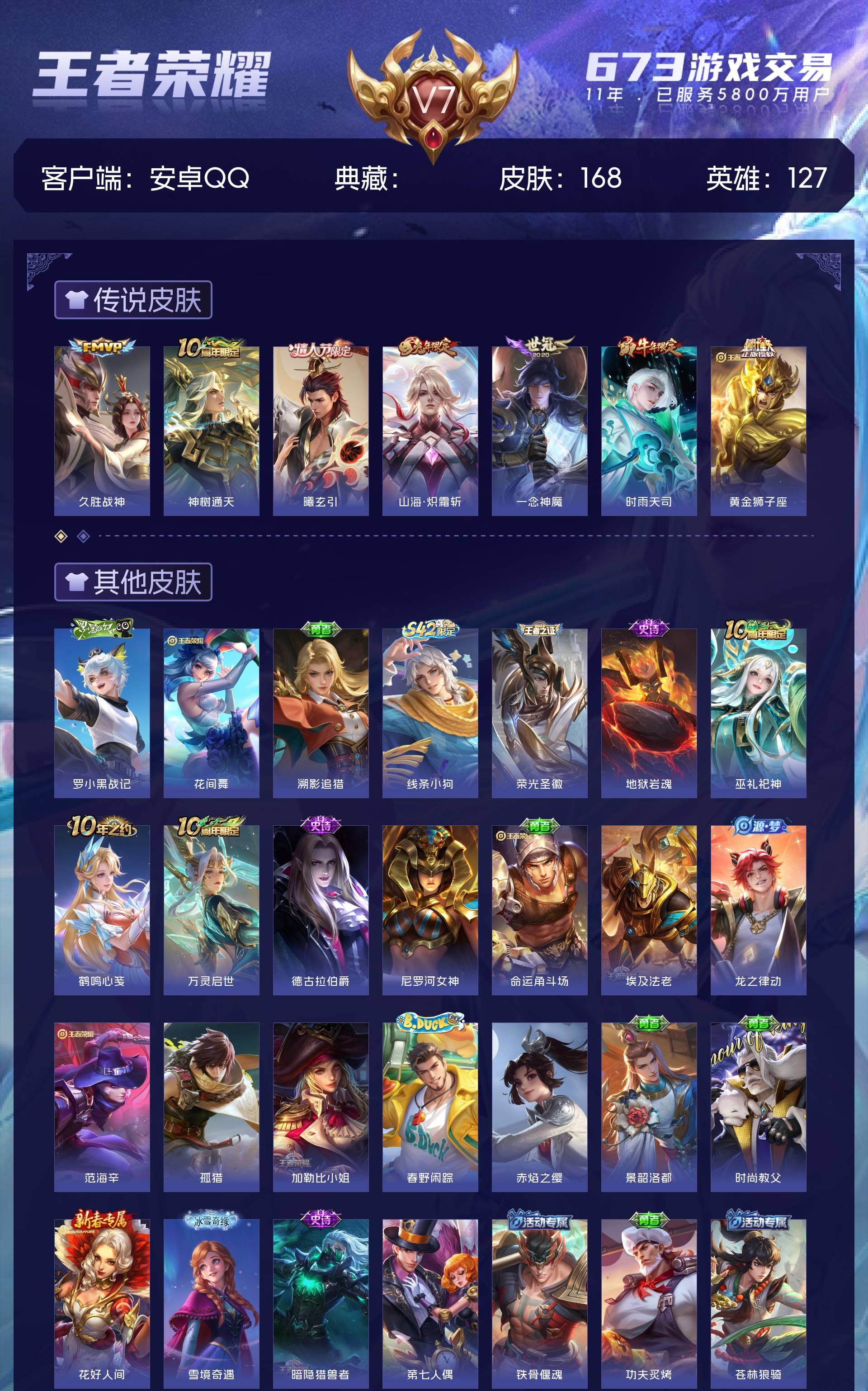 V7 皮肤168 英雄127 至尊星耀 传说7 其他皮肤167