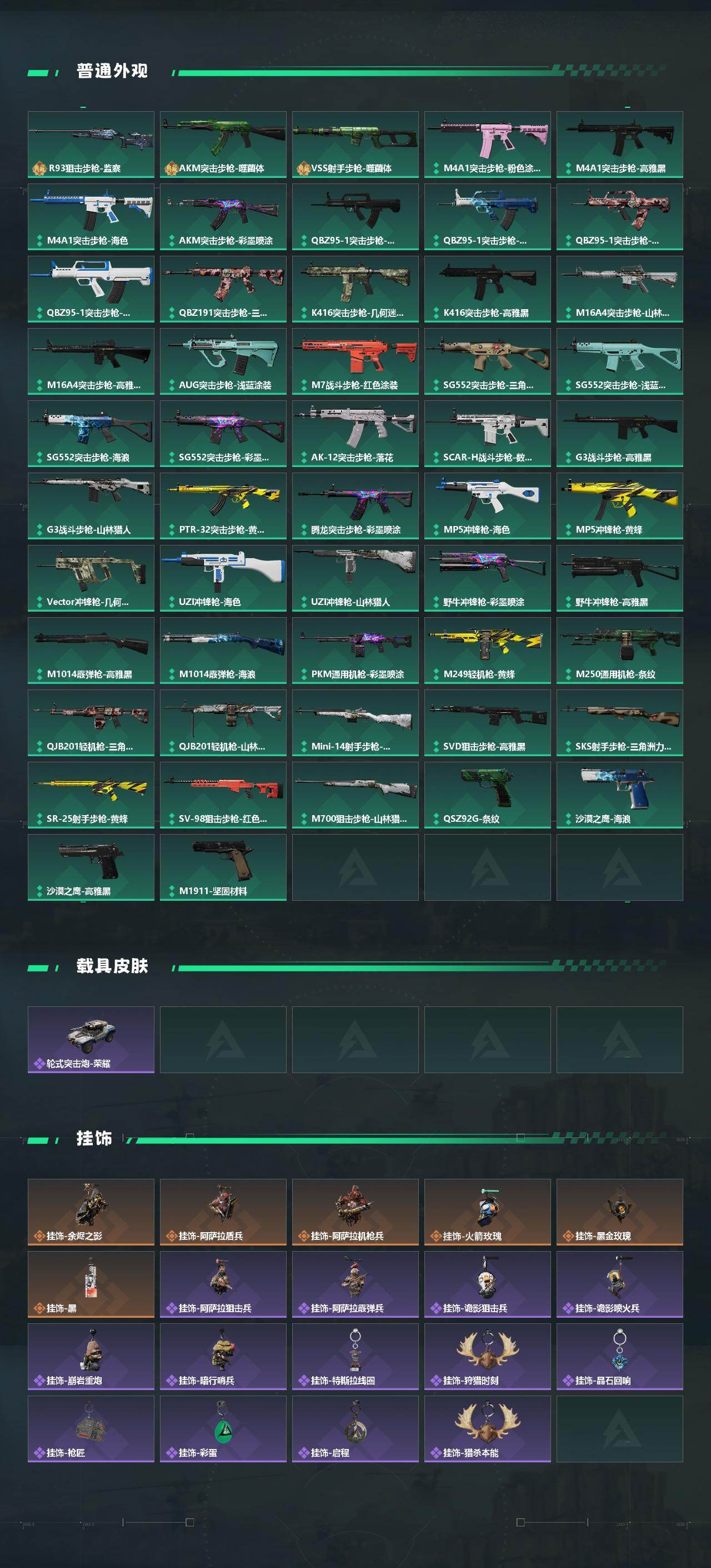 【传说外观】:M4A1突击步枪-阿米娅,ASh-12战斗步枪-鹅鸭杀,M16A4突击步枪-狩猎时刻,AK-12突击步枪-特斯拉线圈,SCAR-H战斗步枪-启航,G3战斗步枪-狩猎时刻,G3战斗步枪-骑士,CAR-15突击