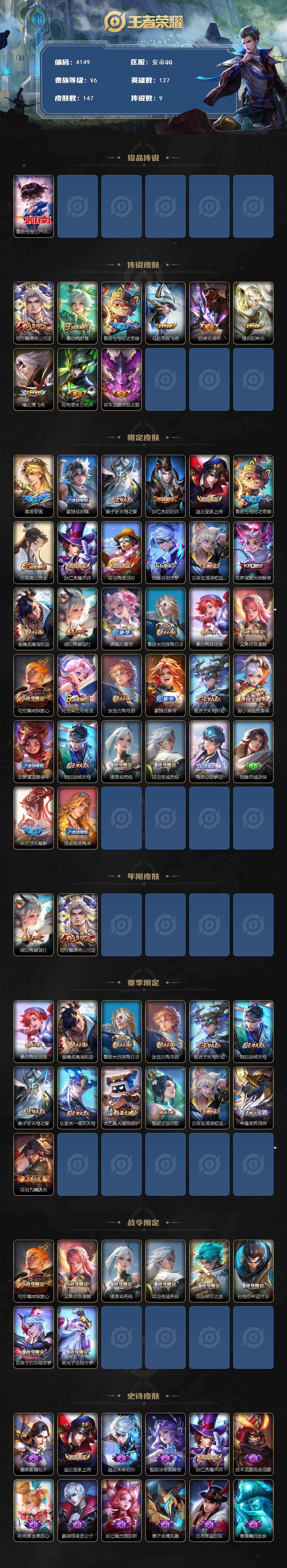 安卓Q-V6-永恒钻石III段位-127英雄-147皮肤-1珍品传说-9传说-52史诗