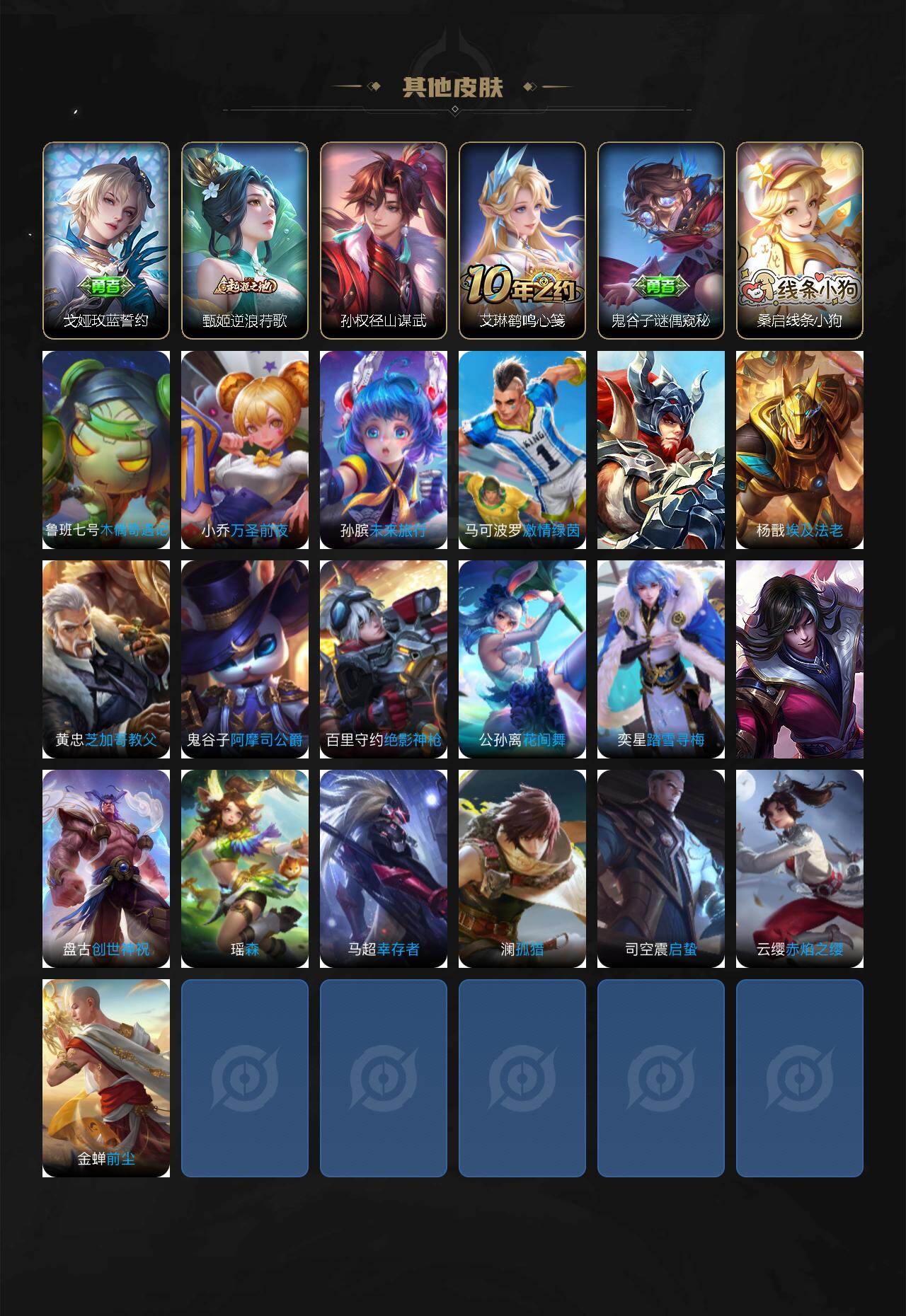 【传说皮肤】:司空震愿照山河定,桑启鸣野蒿,鲁班七号时之奇旅,马超无双飞将,铠绛天战甲,镜炽阳神光,曜云鹰飞将,孙尚香末日机甲,宫本武藏地狱之眼