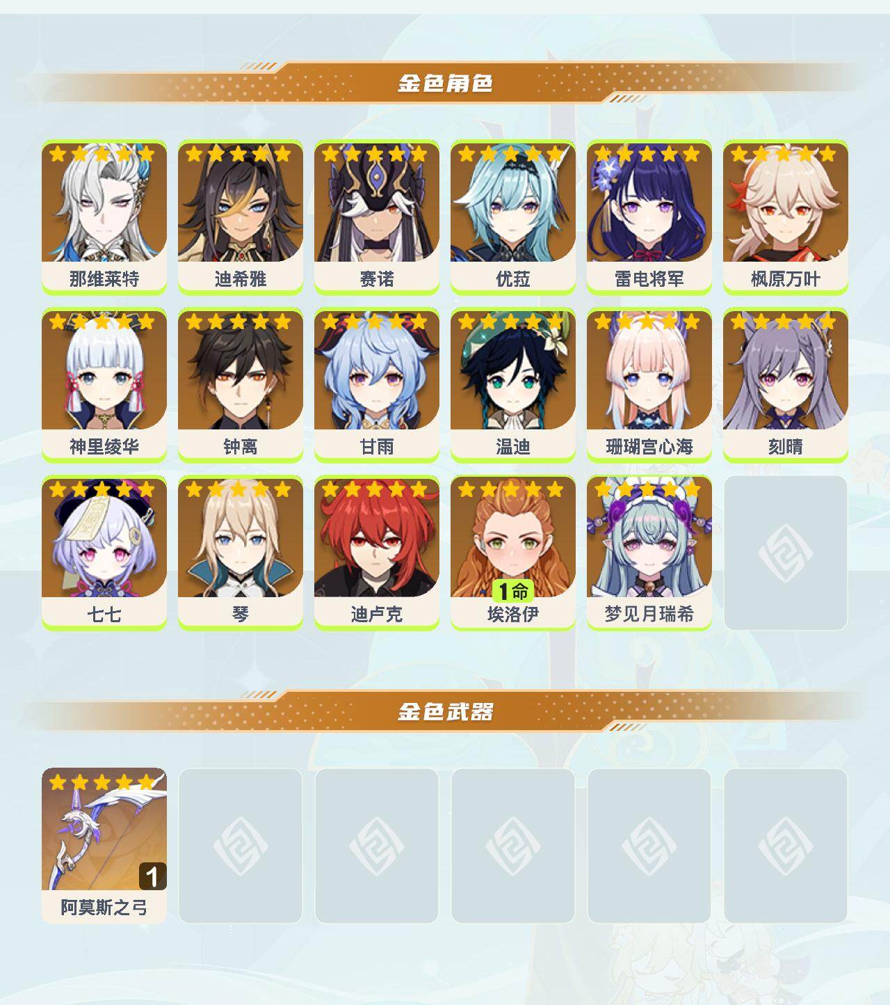 【YSX1538】57级/19黄/女主/17个五星角色/2个五星武器/钟离/温迪/雷电将军/优菈/枫原万叶/甘雨/珊瑚宫心海/神里绫华/刻晴/梦见月瑞希/那维莱特/迪卢克/七七/赛诺/0命埃洛伊/琴/迪希雅/阿莫斯之弓