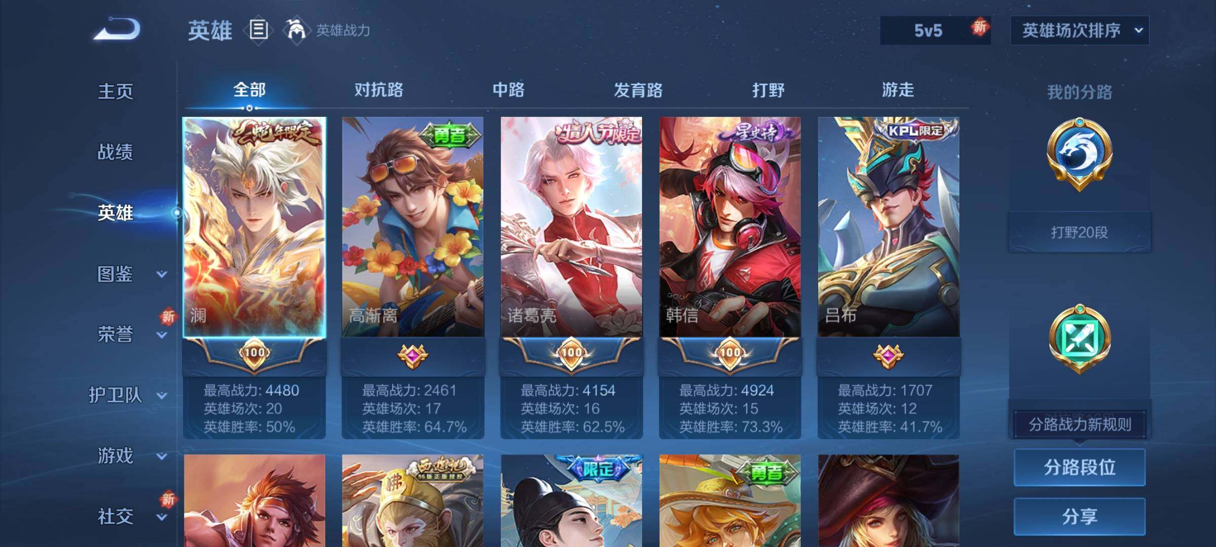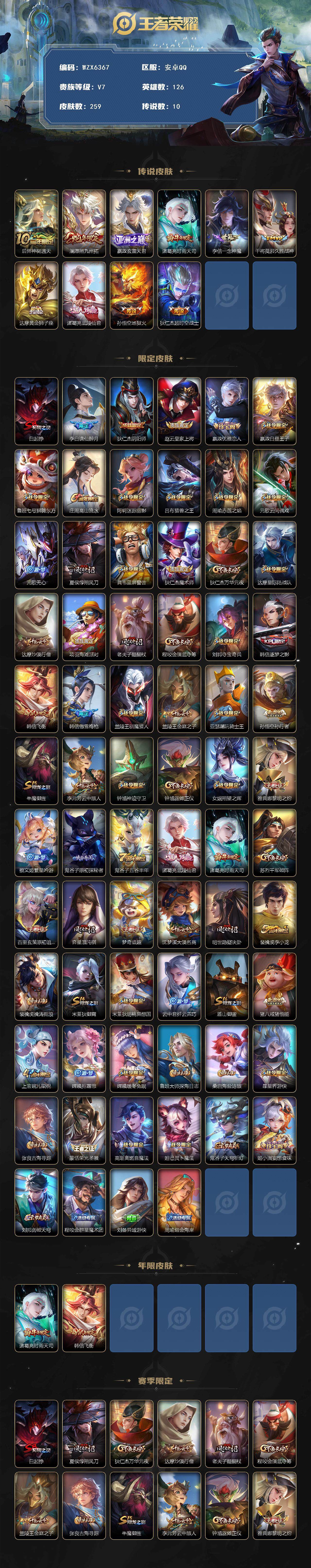 贵族7/皮肤259/传说10/史诗68/英雄126/嬴政全皮/刘邦全皮/孙权全皮