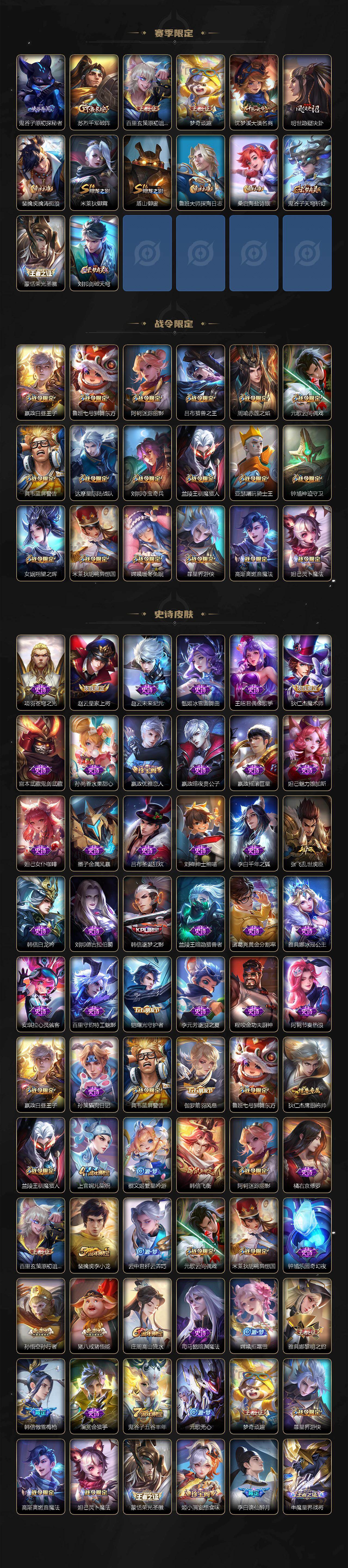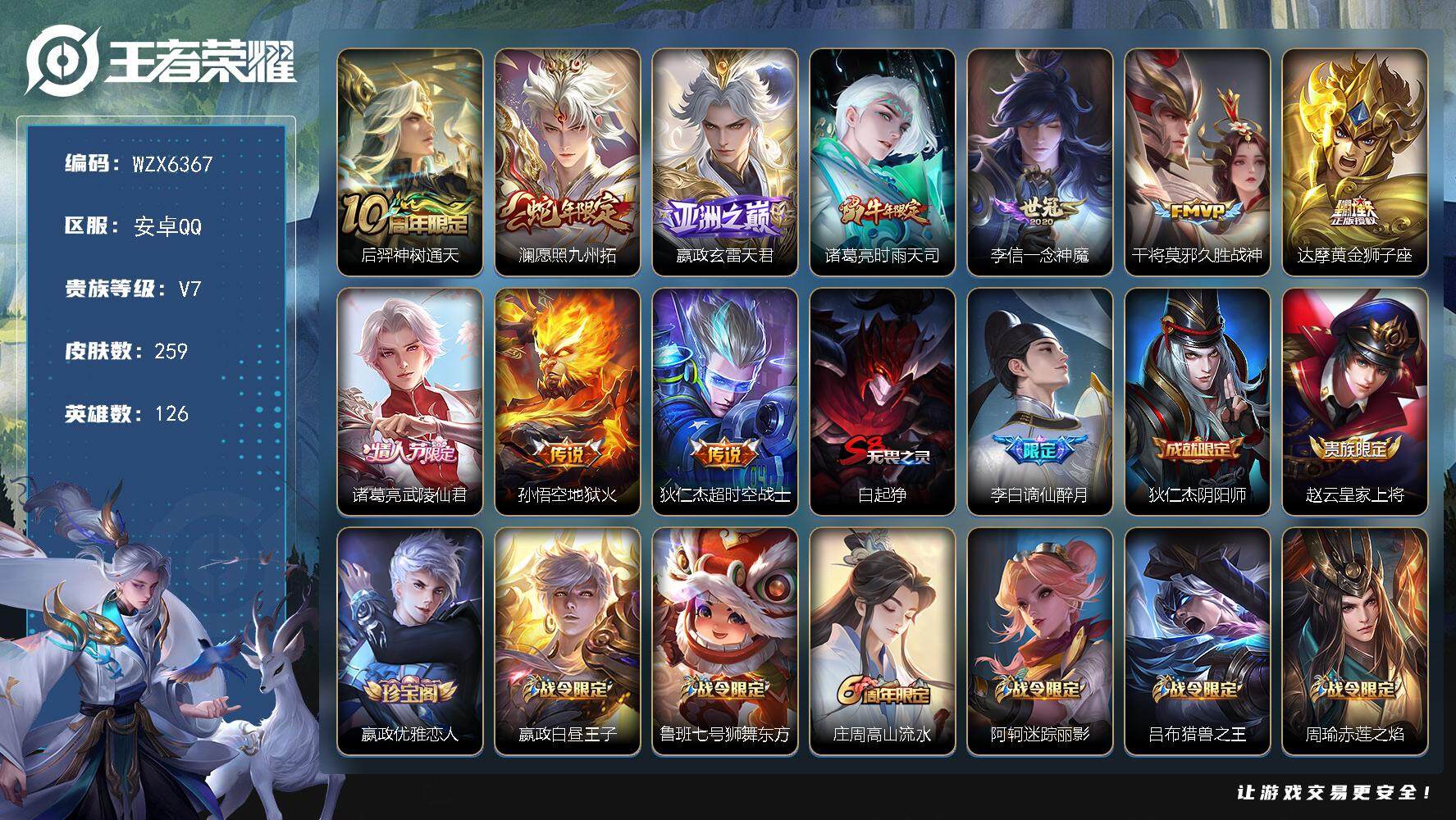 【WZX6367】贵族7/皮肤259/传说10/史诗68/英雄126/嬴政全皮/刘邦全皮/孙权全皮/蒙恬全皮/空空儿全皮/影全皮/后羿神树通天/澜-愿照·九州拓/嬴政-玄雷天君/诸葛亮-时雨天司/李信-一念神魔/干将莫邪-久胜战神/达摩-黄金狮子座/诸葛亮-武陵仙君/孙悟空-地狱火/狄仁杰-超时空战士/白起-狰/李白-谪仙醉月/狄仁杰-阴阳师/赵云-皇家上将/嬴政-优雅恋人/嬴政-白昼王子/鲁班七号-狮舞东方/庄周-高山流水/阿轲-迷踪丽影/吕布-猎兽之王/周瑜-赤莲之焰/元歌-云间偶戏/元歌-