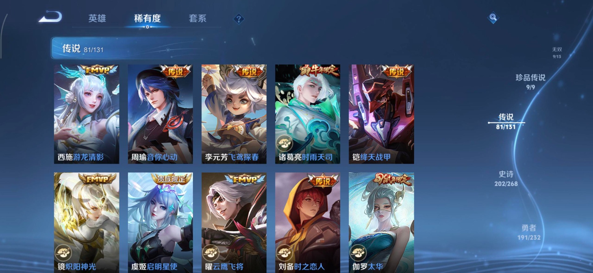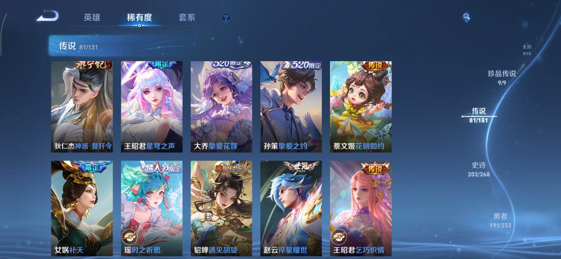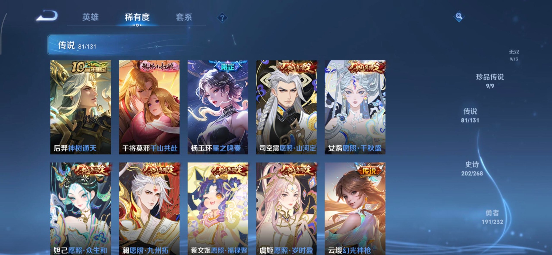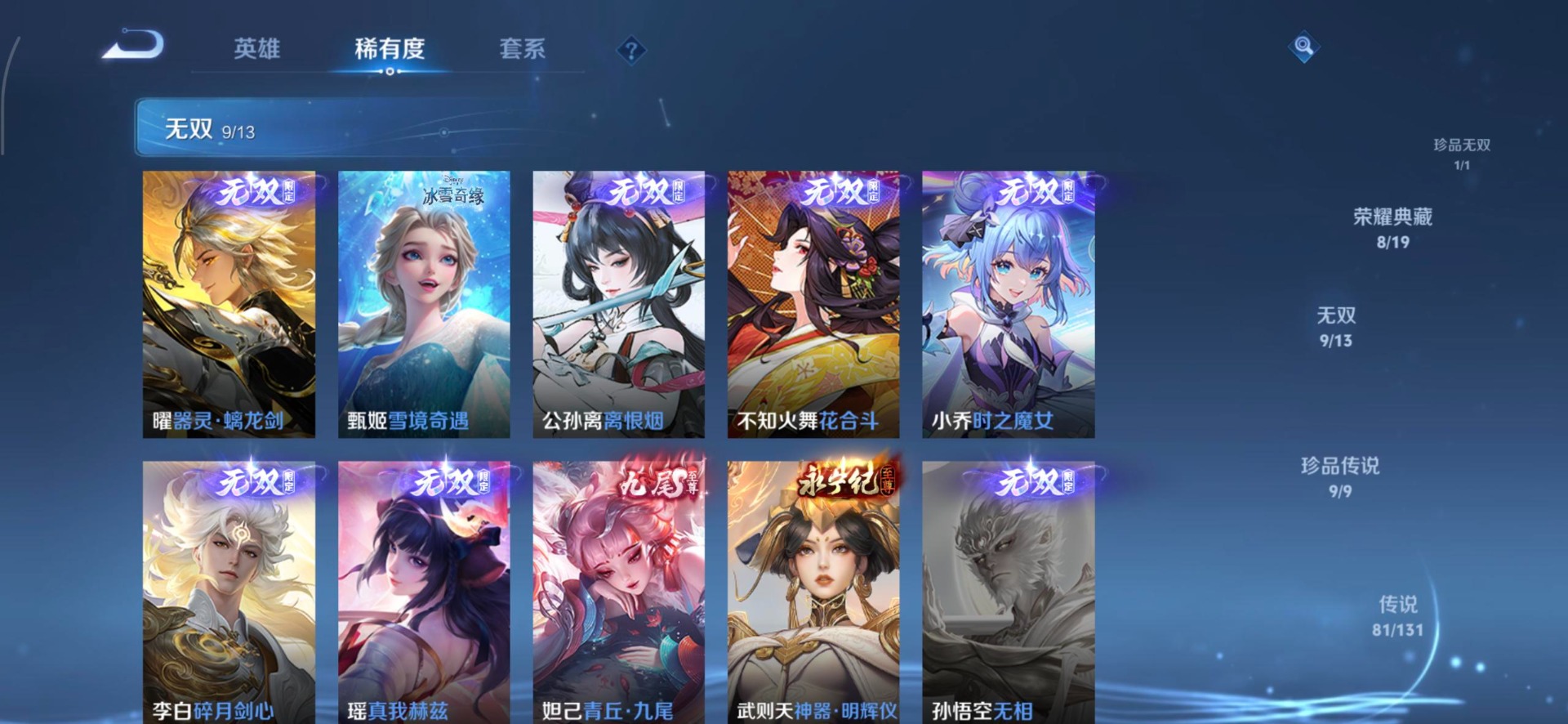 V10 8典藏 1珍品无双 9无双 9珍品传说 81传说 128英雄 583皮肤 典藏英雄武则天 可