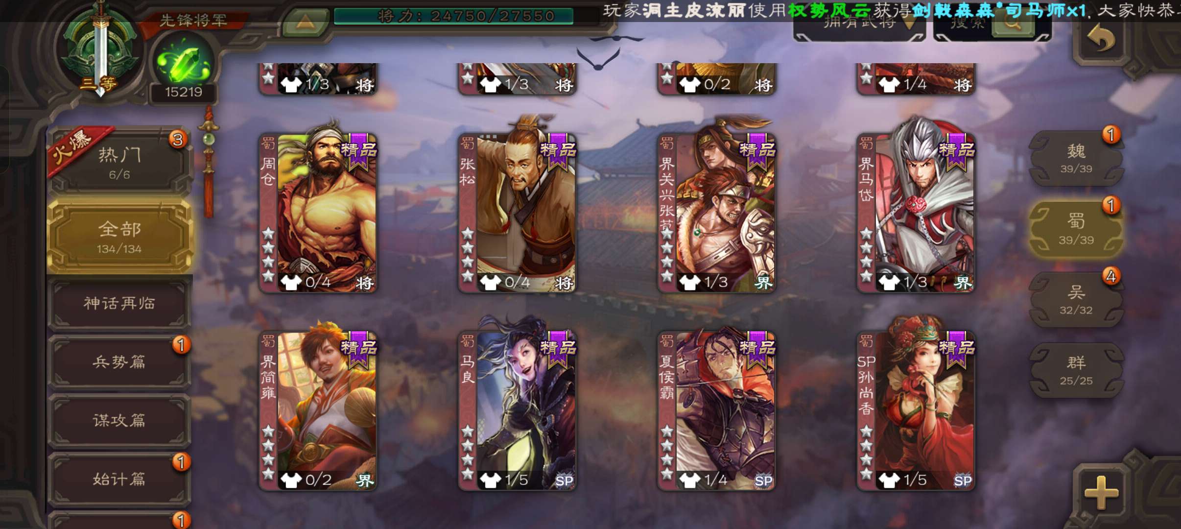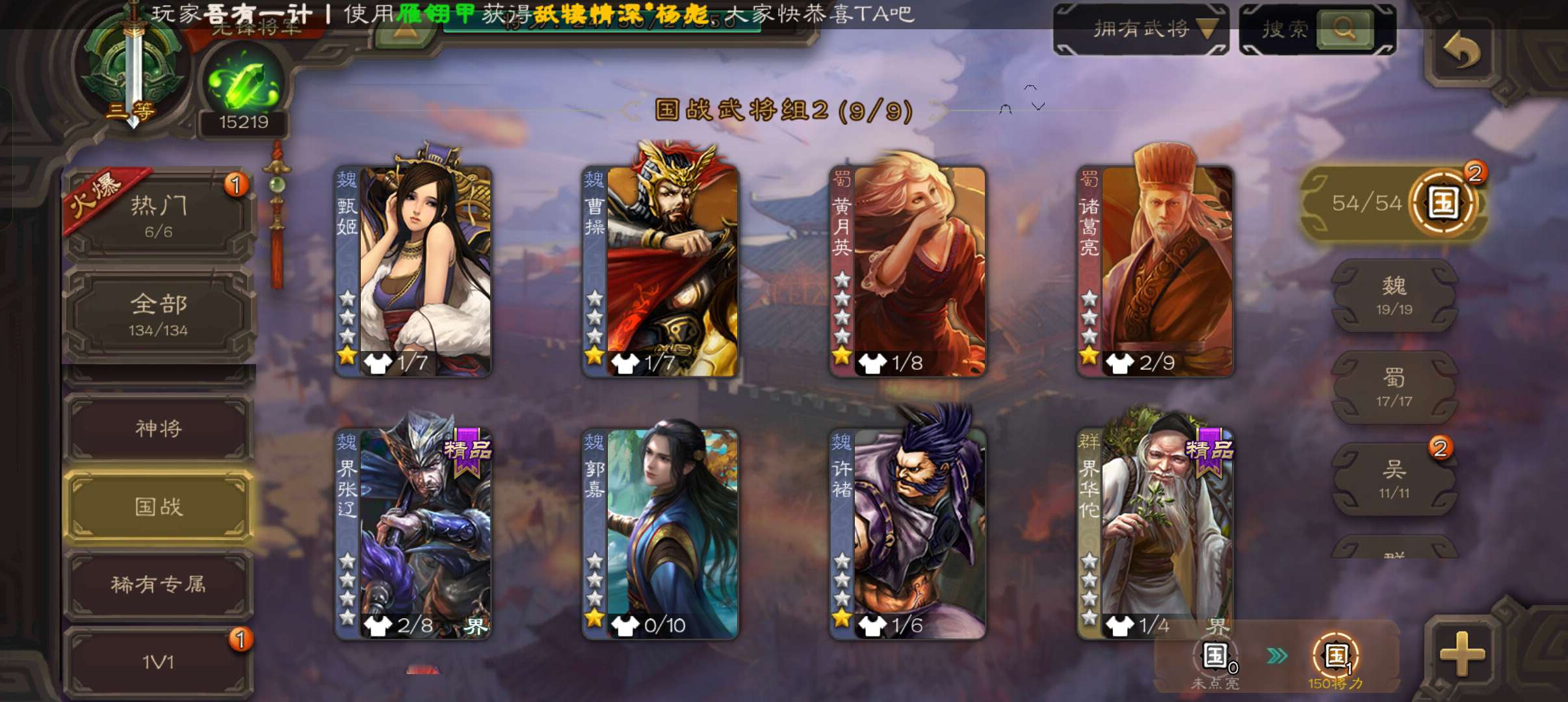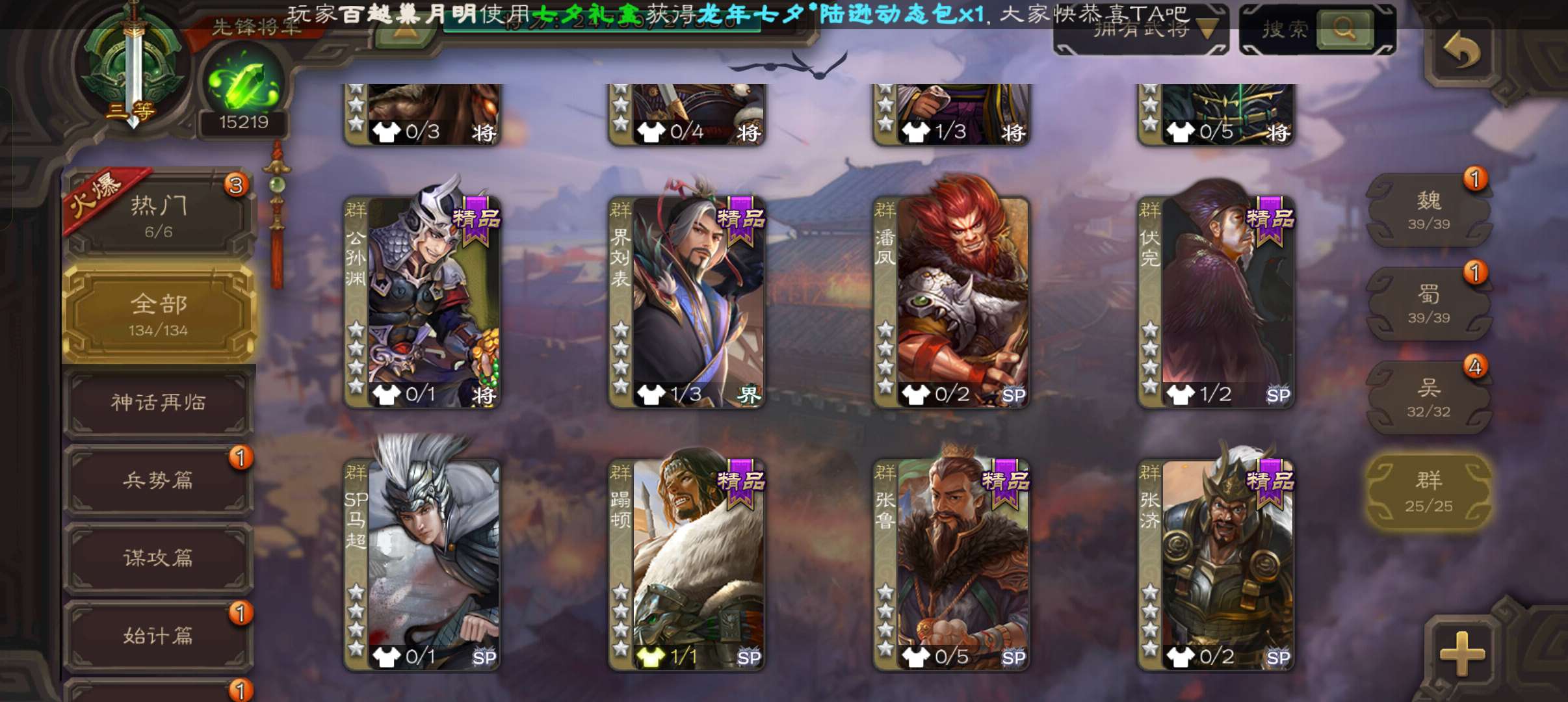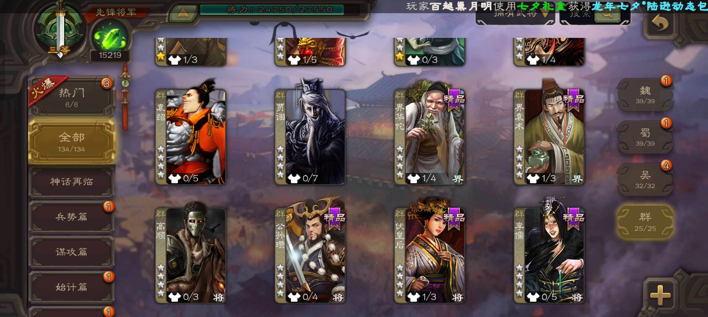 10万羽毛1.5万将魂5万豆,大宝界徐盛谯周双史诗先锋,甘夫人崔琰关银屏势陈祗134将
