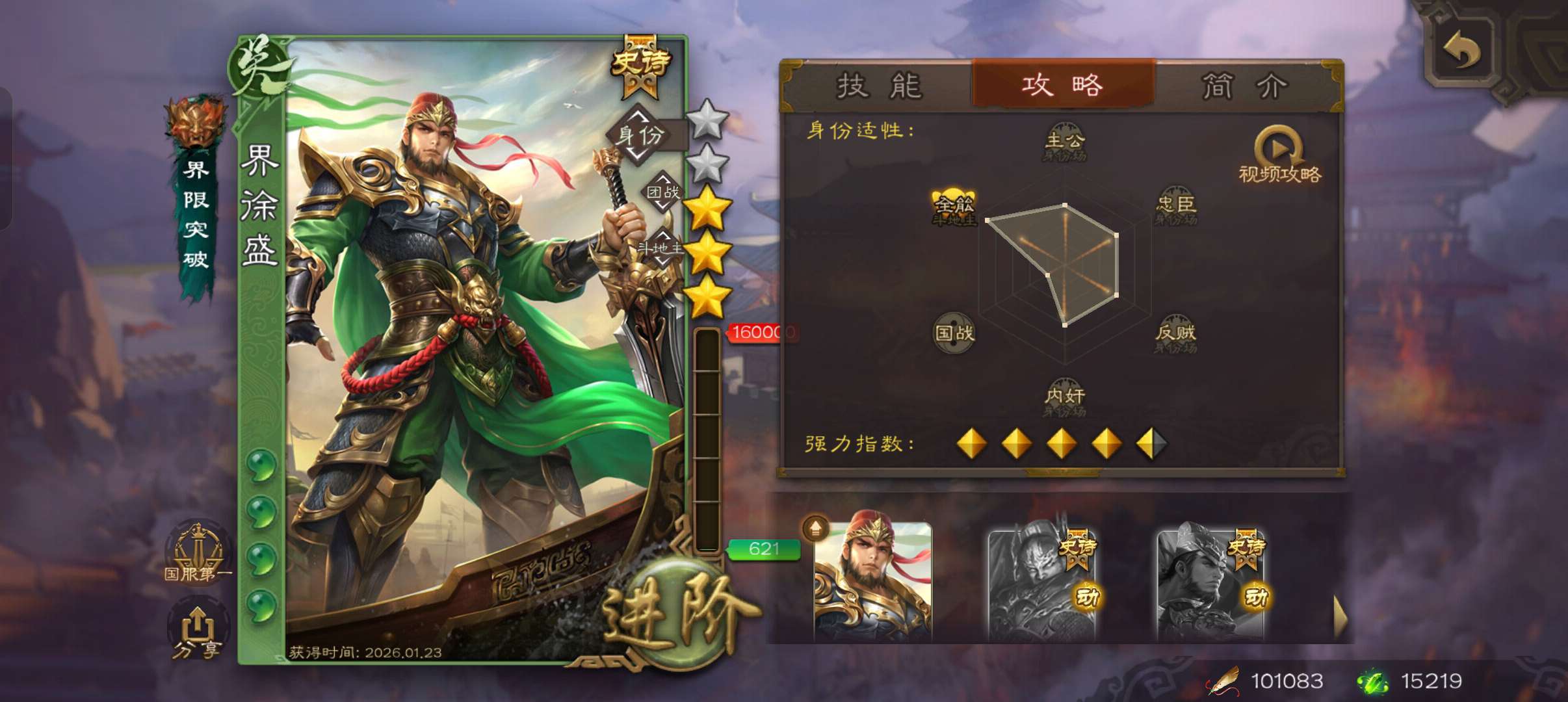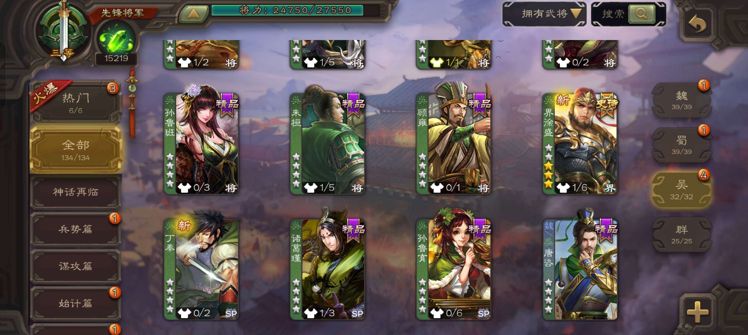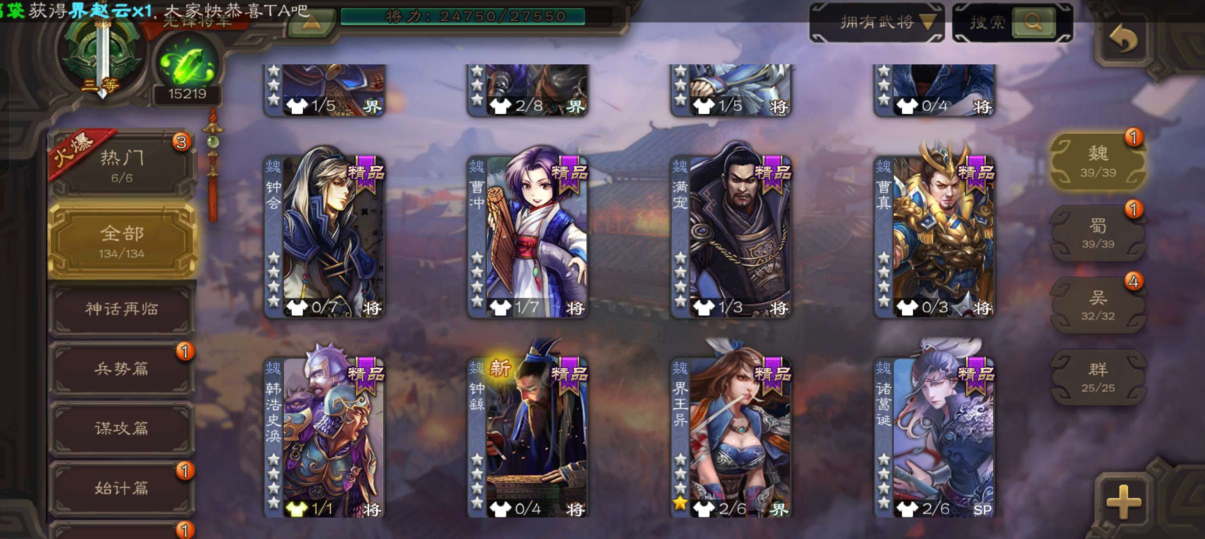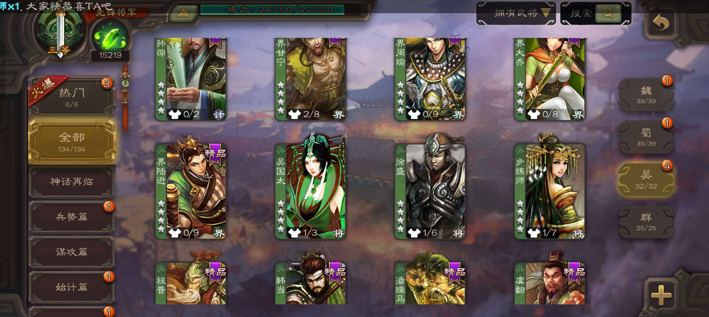 10万羽毛1.5万将魂5万豆,大宝界徐盛谯周双史诗先锋,甘夫人崔琰关银屏势陈祗134将