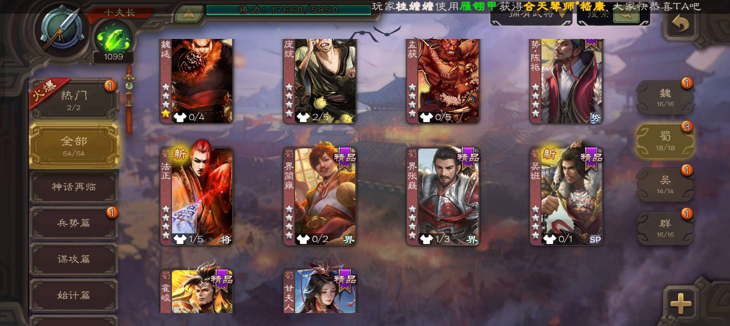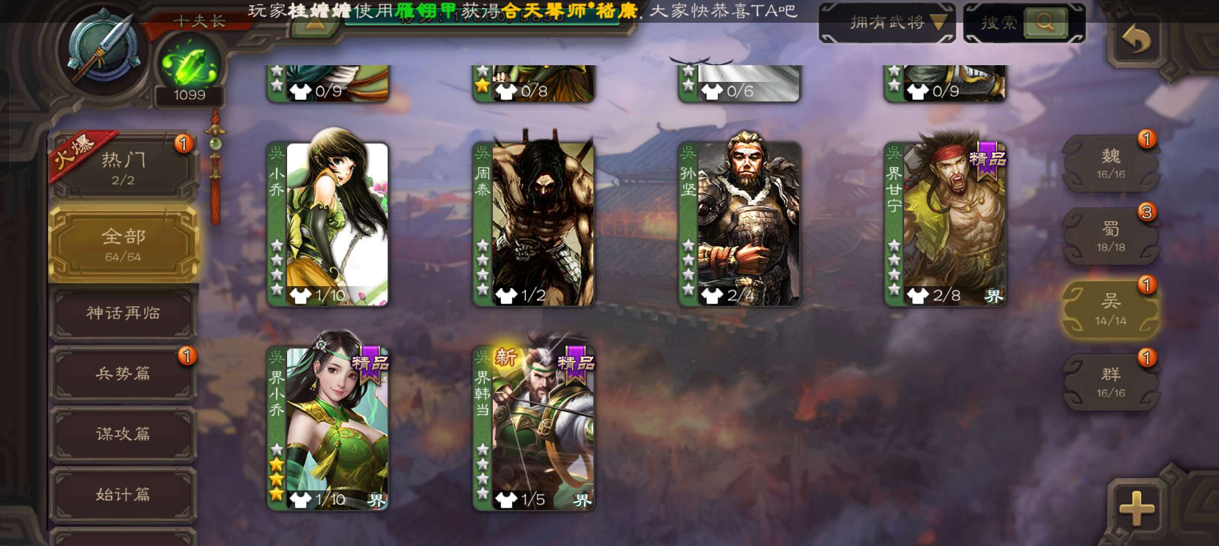 64将夫长,39.6珠8.6万羽毛,天工友徐庶,回廊动郝昭,动甘夫人动界小乔谋高顺霍峻崔琰