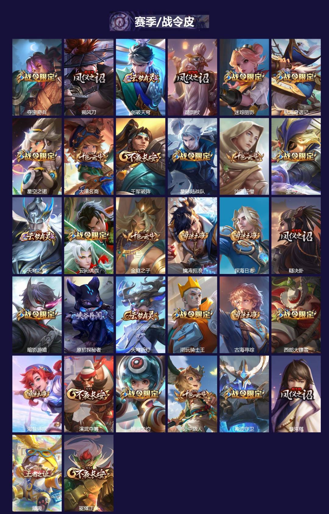 【传说皮】黄金狮子座,黄金射手座,黄金白羊座,零号·赤焰,一念神魔,云鹰飞将(小将军),无双飞将,时之恋人-刘备(电焊工),绛天战甲(鸡嘴战神),超时空战士-狄仁杰