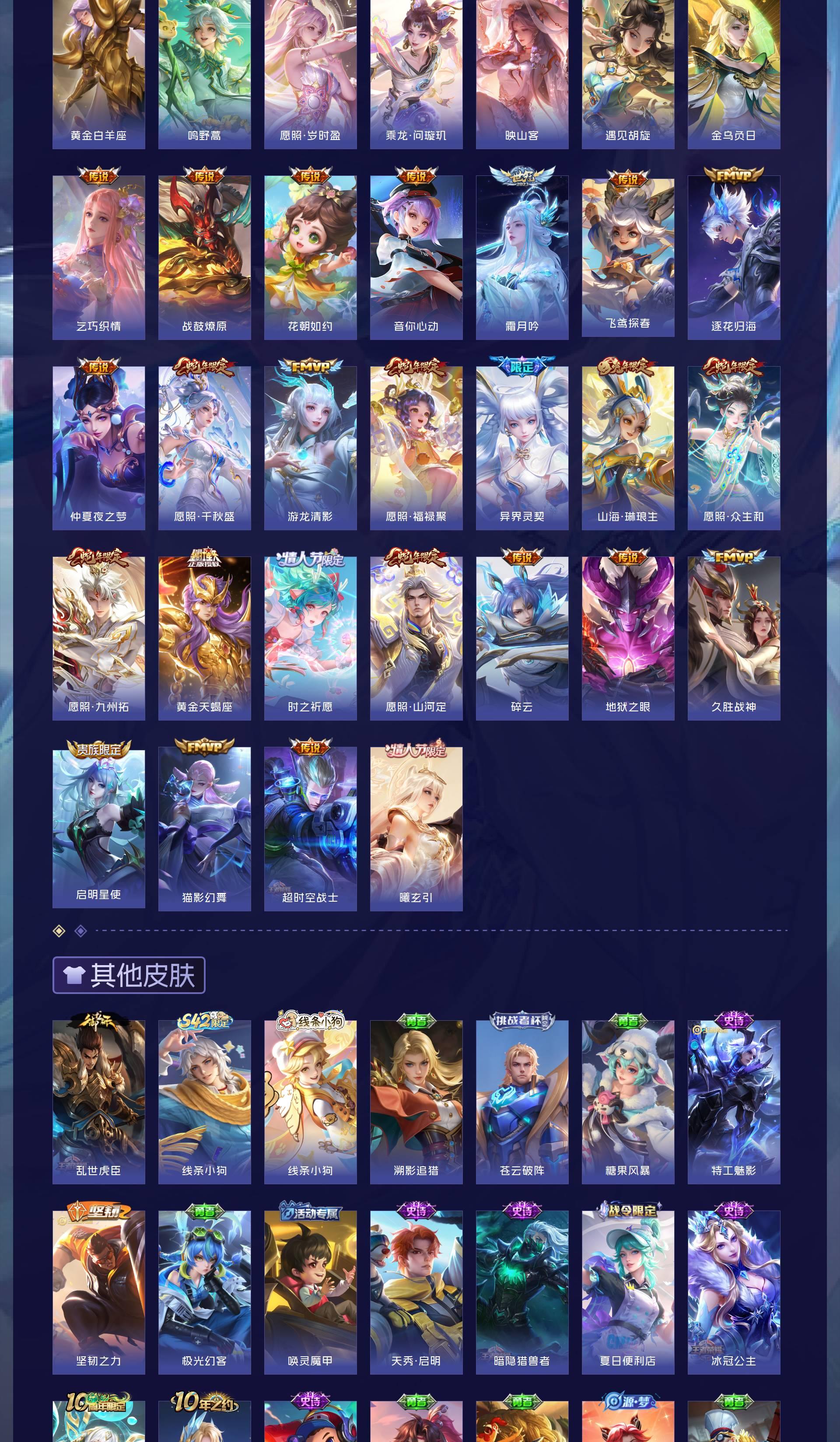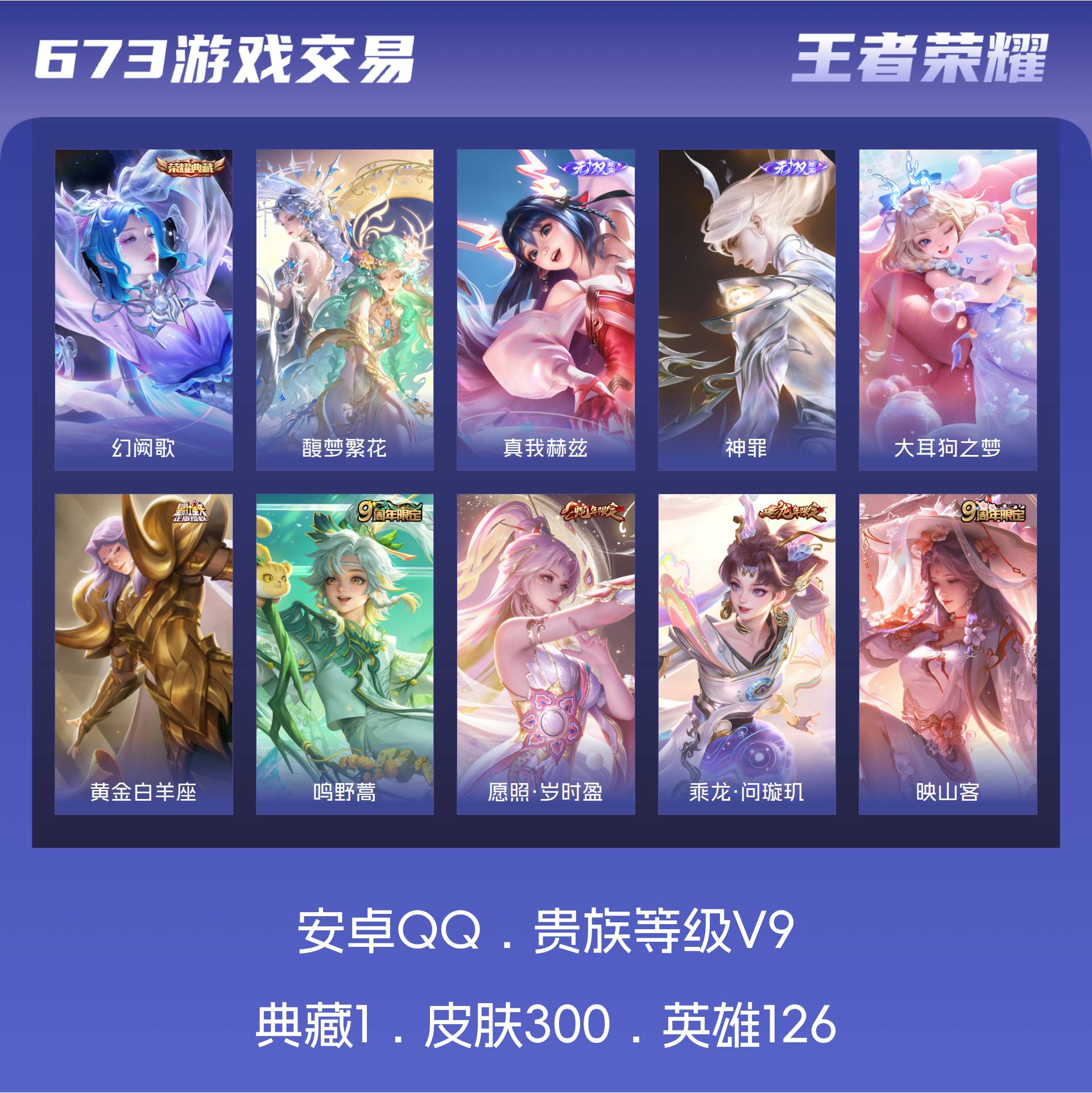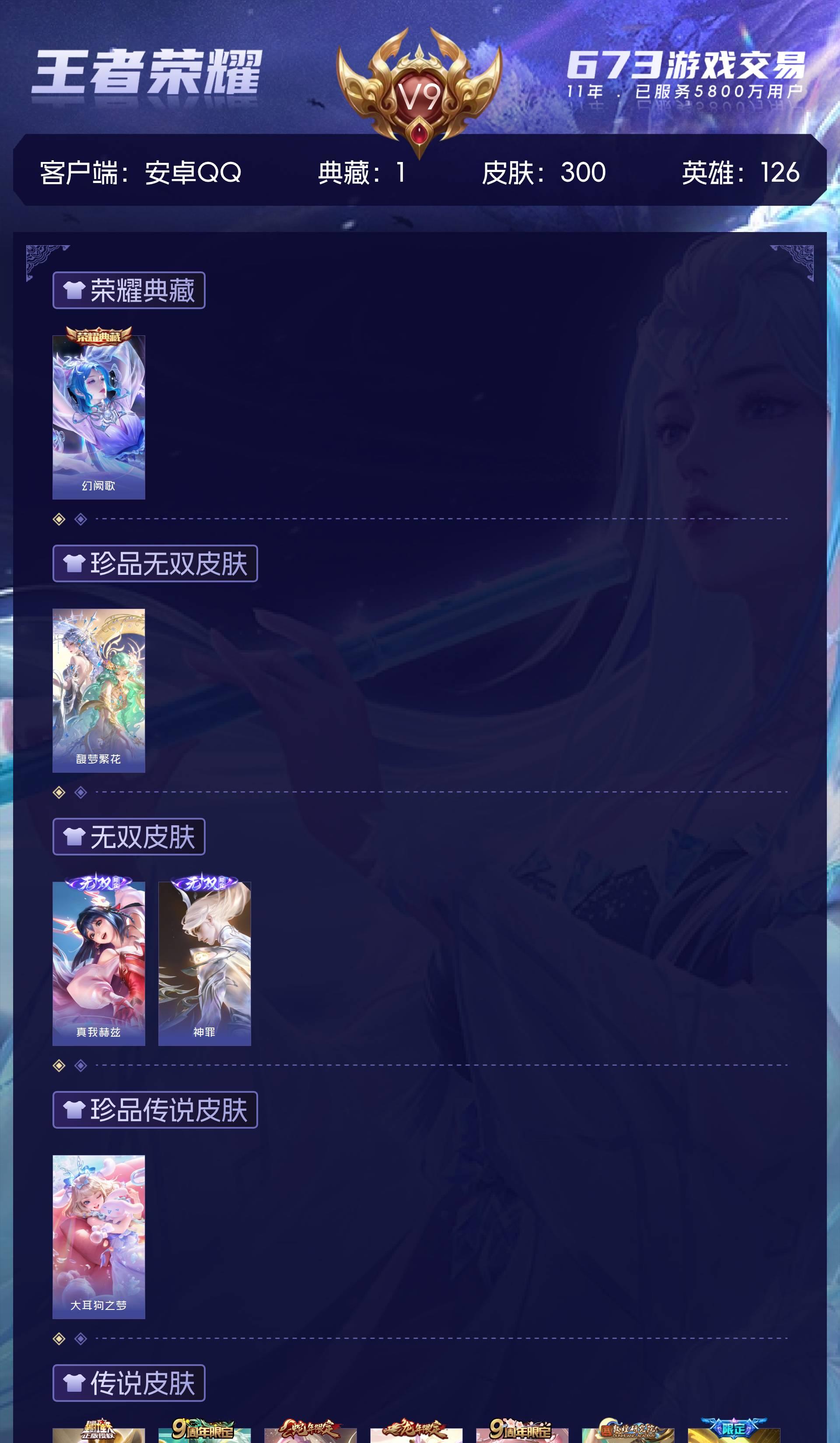 V9 皮肤300 英雄126 永恒钻石 荣耀典藏1 珍品无双1 无双皮肤2 珍品传说1 传说32 其他皮肤267