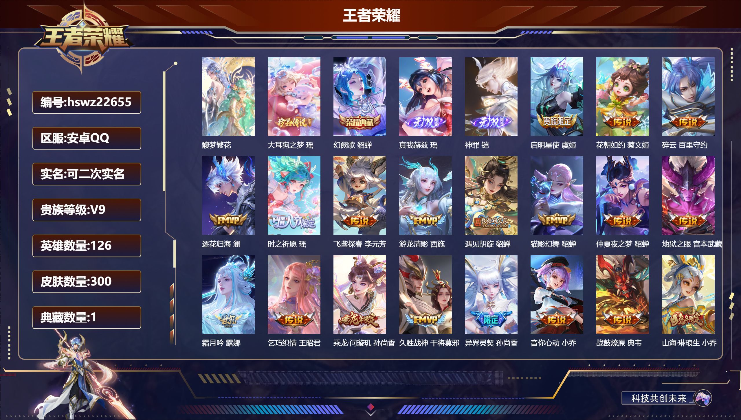 安卓QQ/永恒钻石/300皮肤/126英雄/1典藏/1珍品无双/2无双/1珍品传说/32传说/76史