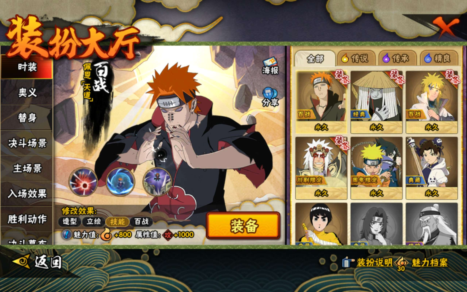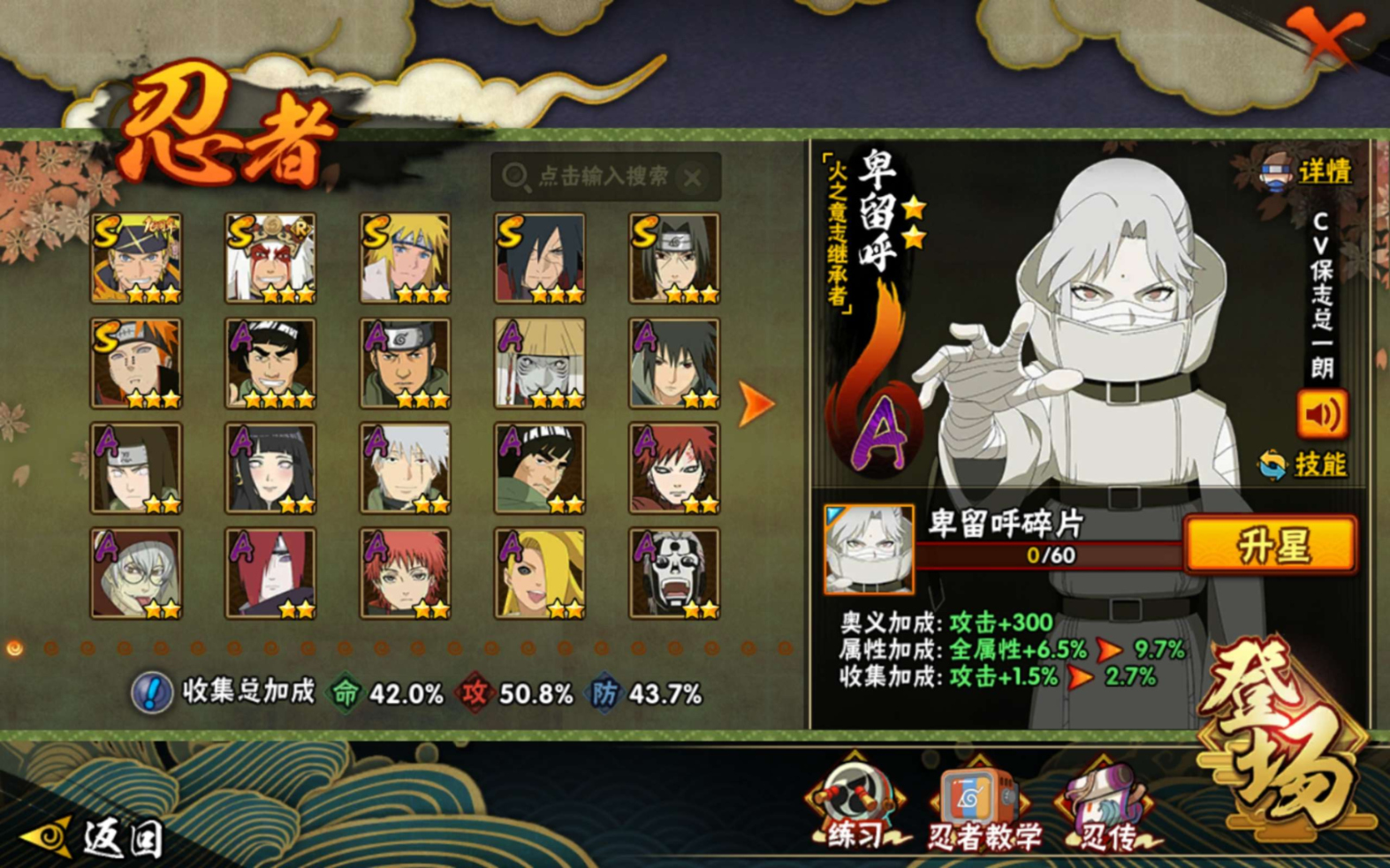 【S级忍者】宇智波斑「秽土转生·解」(3星),自来也「舞之豪杰」(3星),宇智波鼬「须佐能乎」(3星),漩涡鸣人·宇智波佐助(3星),佩恩「天道」(3星),波风水门(3星),