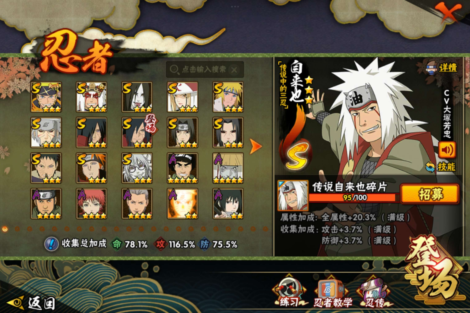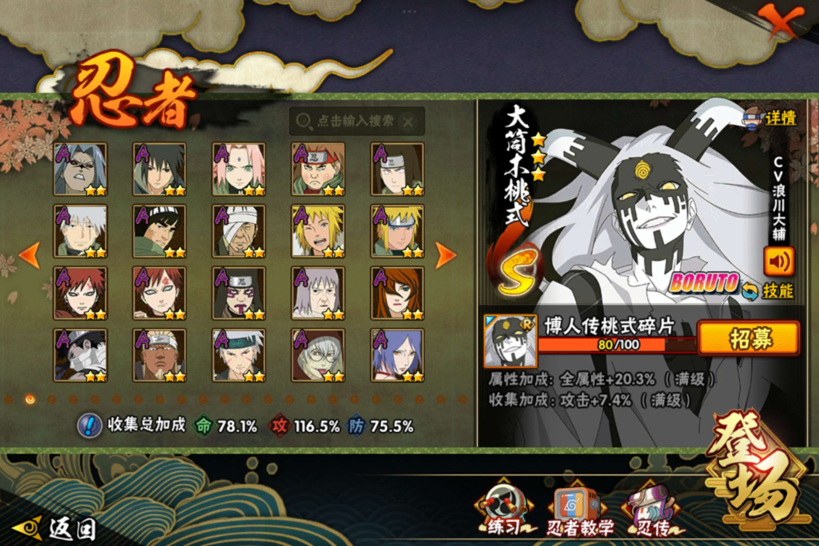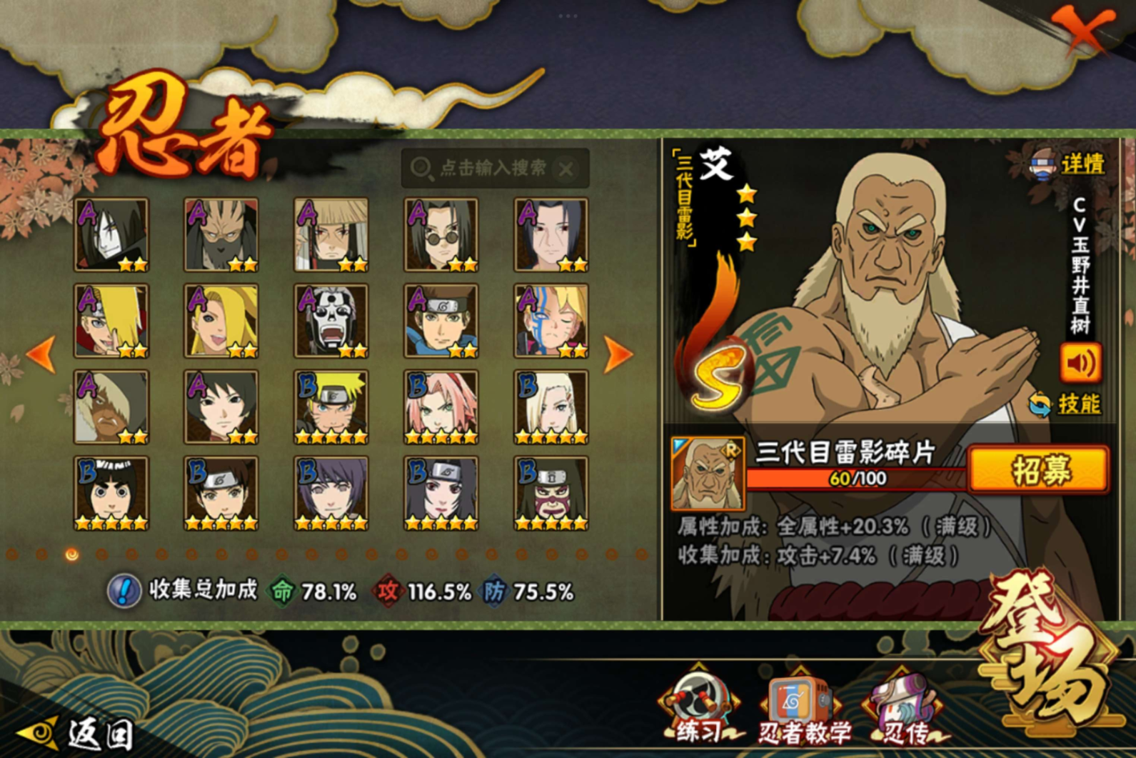 【S级忍者】宇智波带土「忍界大战」(3星),宇智波斑「秽土转生·解」(3星),药师兜「仙人模式」(3星),千手扉间「秽土转生」(3星),宇智波斑「秽土转生」(3星),自来也「舞之豪杰」(3星),宇智波鼬「秽土转生」(3星),