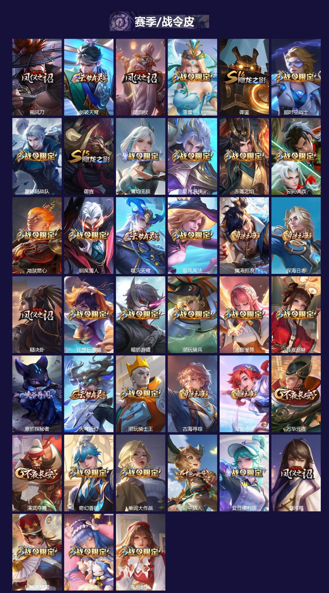 【传说皮】乘龙·问璇玑(孙尚香年限),云诺千山,神树通天,万灵伏威,死亡执政官,幻光神枪,山海·炽霜斩(李信年限),黄金狮子座,仲夏夜之梦(大飞蛾),久胜战神,猫影幻舞,