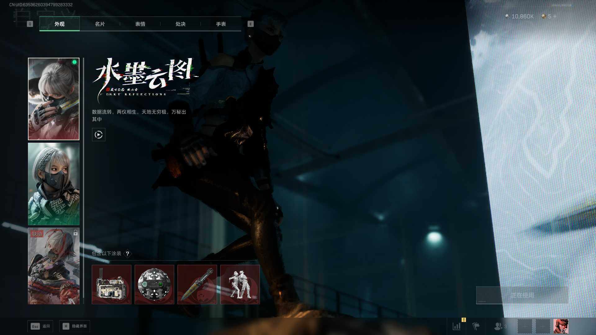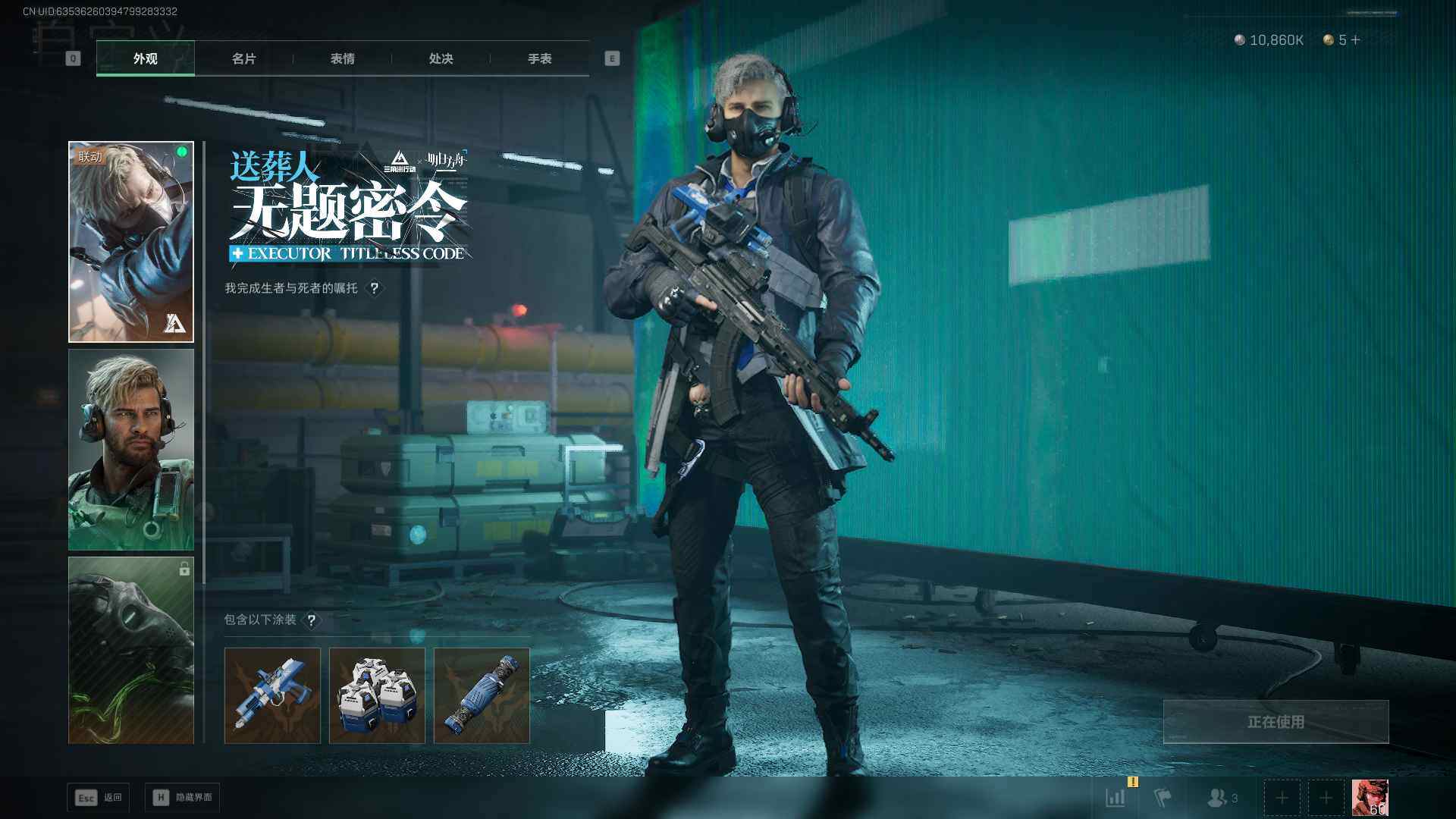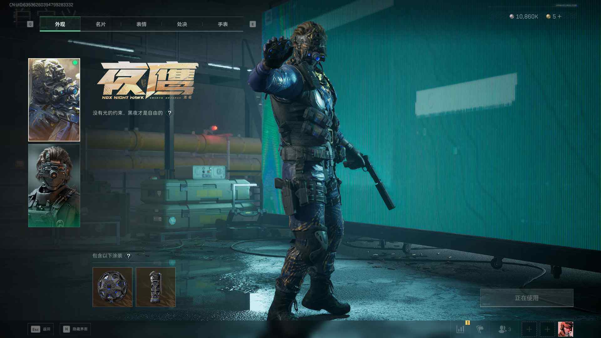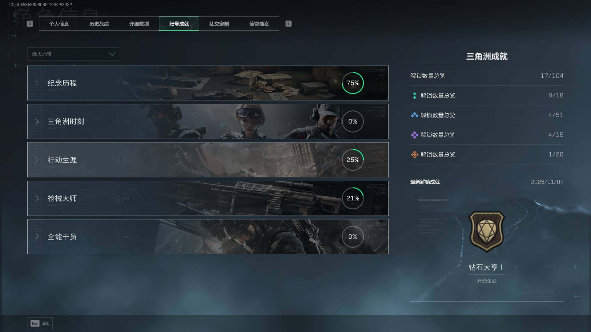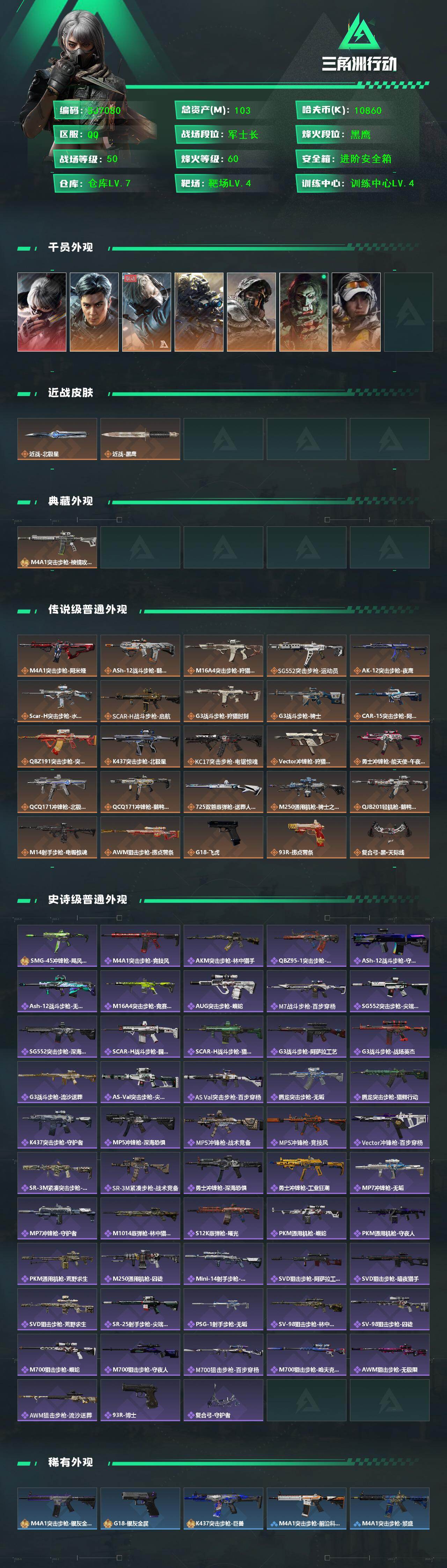 总资产(M):103M/哈夫币(K):10860K/传说枪皮数:26/全面战场等级:50_段位:军士长/烽火地带等级:60_段位:黑鹰/