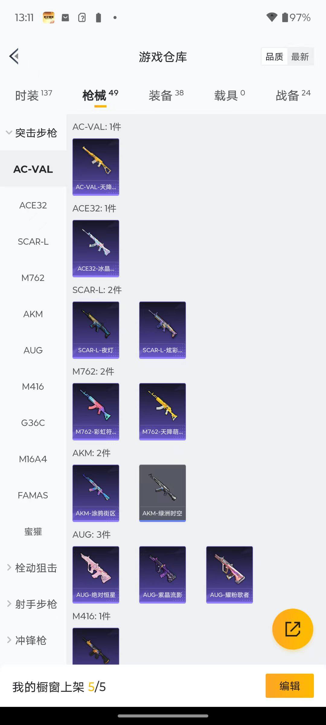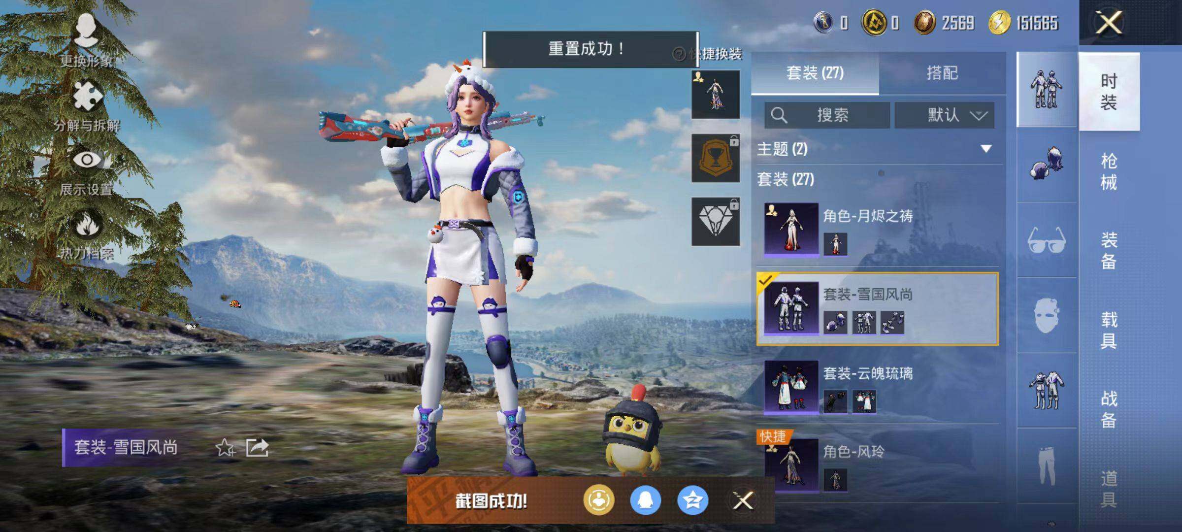 27套装/枪械2/装备38/战备24/热力值10647/五级Kar98K-巳巳如意/五级DP-28-豹影疾电/套装-粉红小猪/Kar98K-巳巳如意/DP-28-豹影疾电/星之彼岸降落伞/荧海星豚降落伞/套装-雪国风尚/角色-风玲/角色-月烬之祷/SCAR-L-夜灯/SCAR-L-炫彩节奏/M416-蓝色火焰/AUG-耀粉歌者/AUG-绝对恒星/M762-天降萌叽/M762-彩虹符号/G36C-