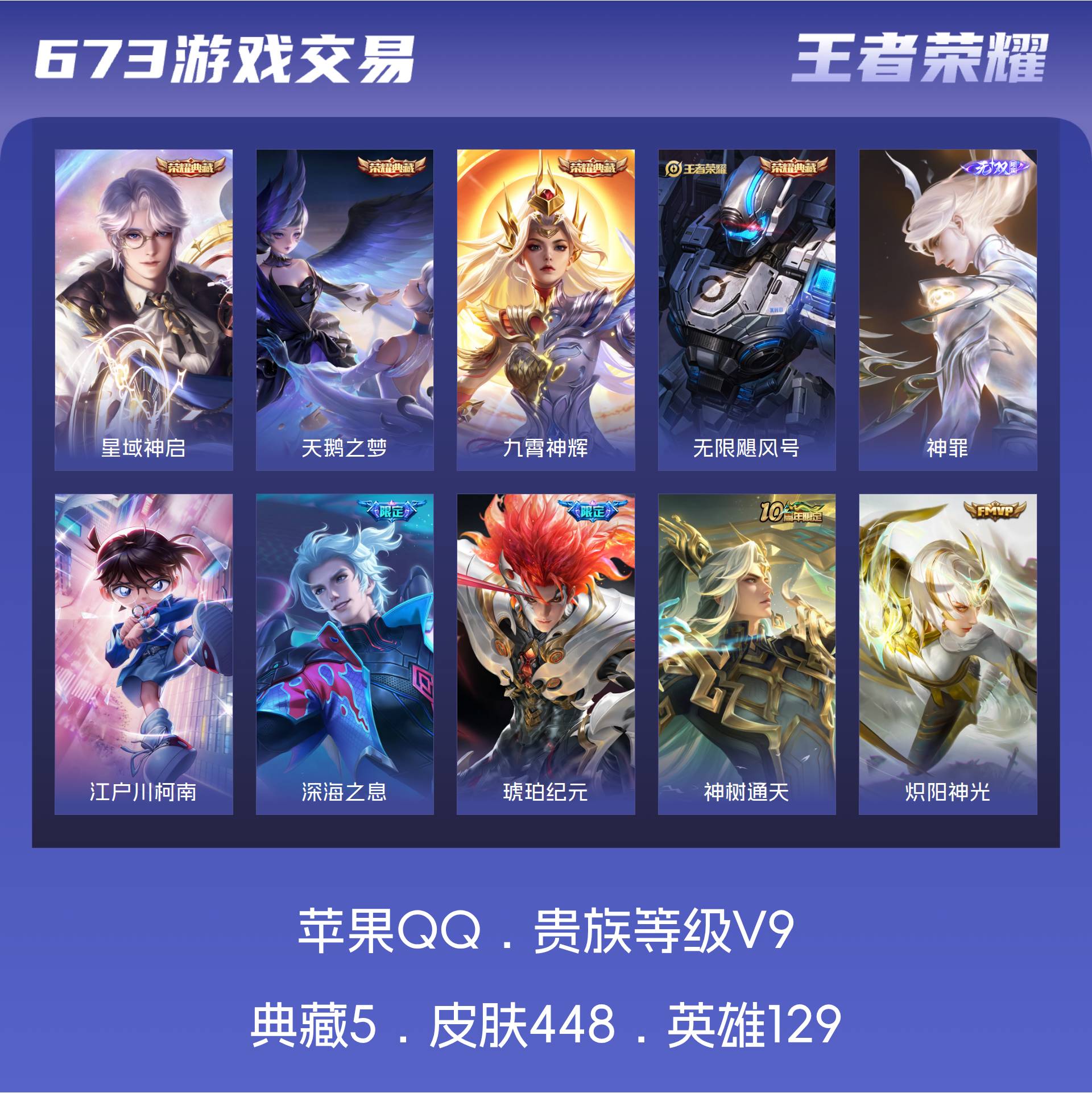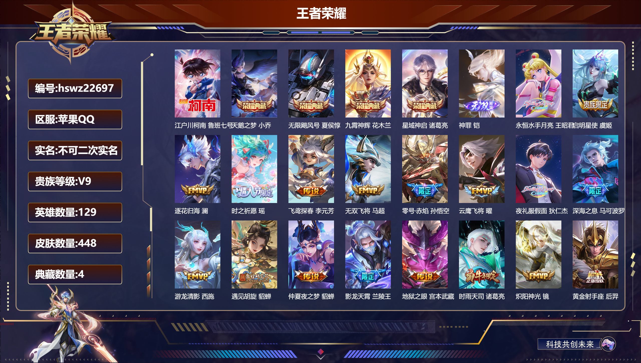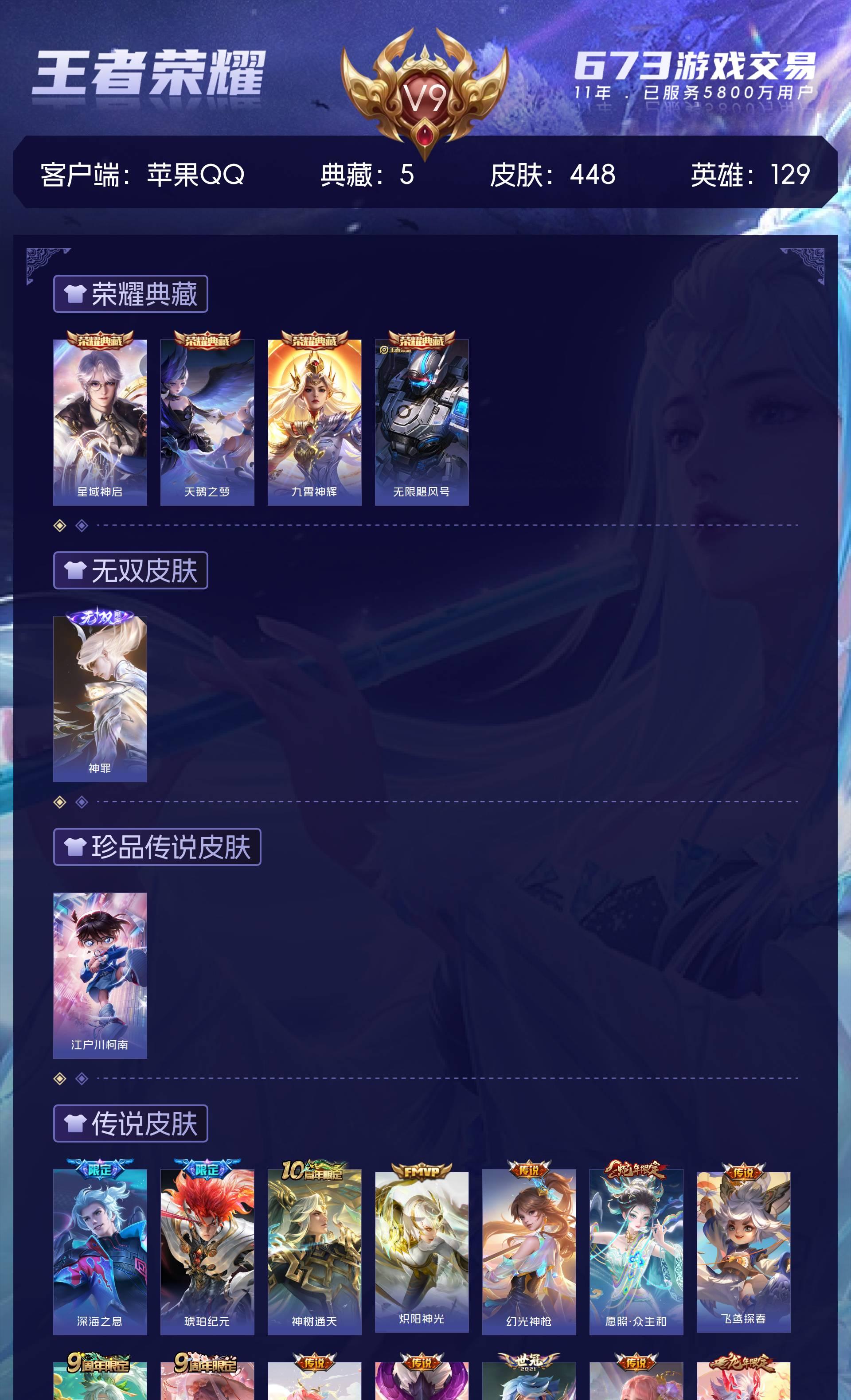 苹果QQ/至尊星耀/448皮肤/129英雄/4典藏/0珍品无双/1无双/1珍品传说/39传说/143